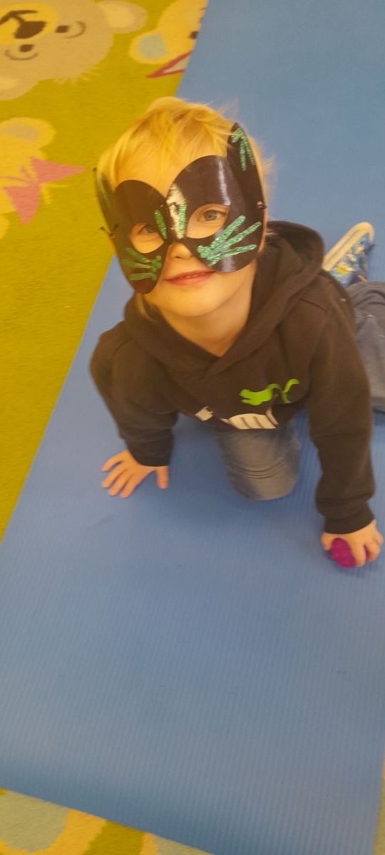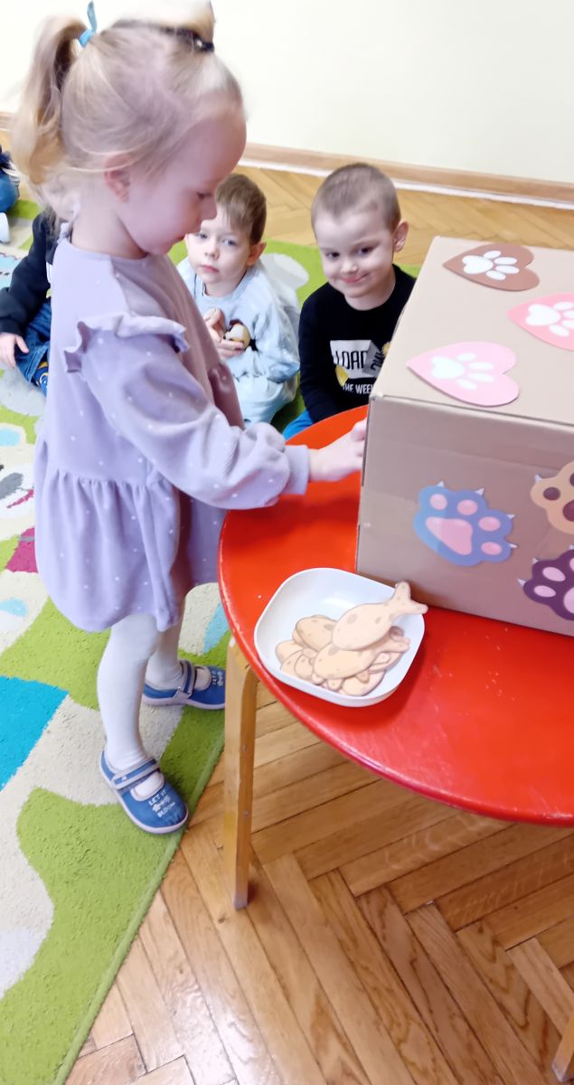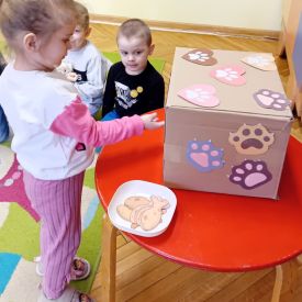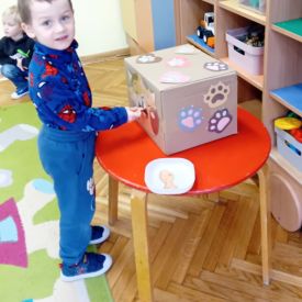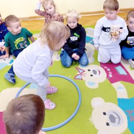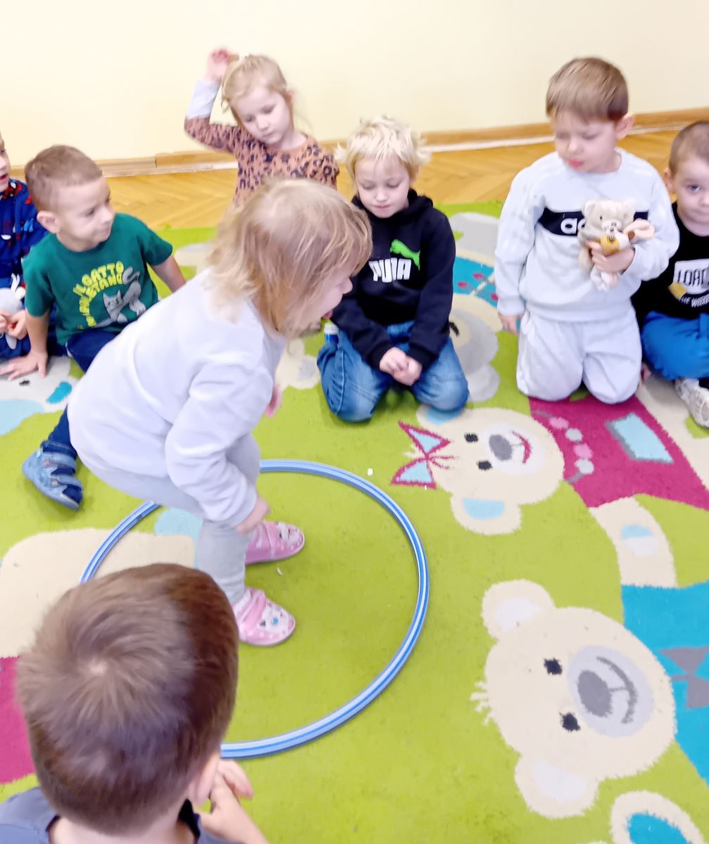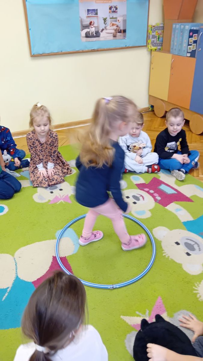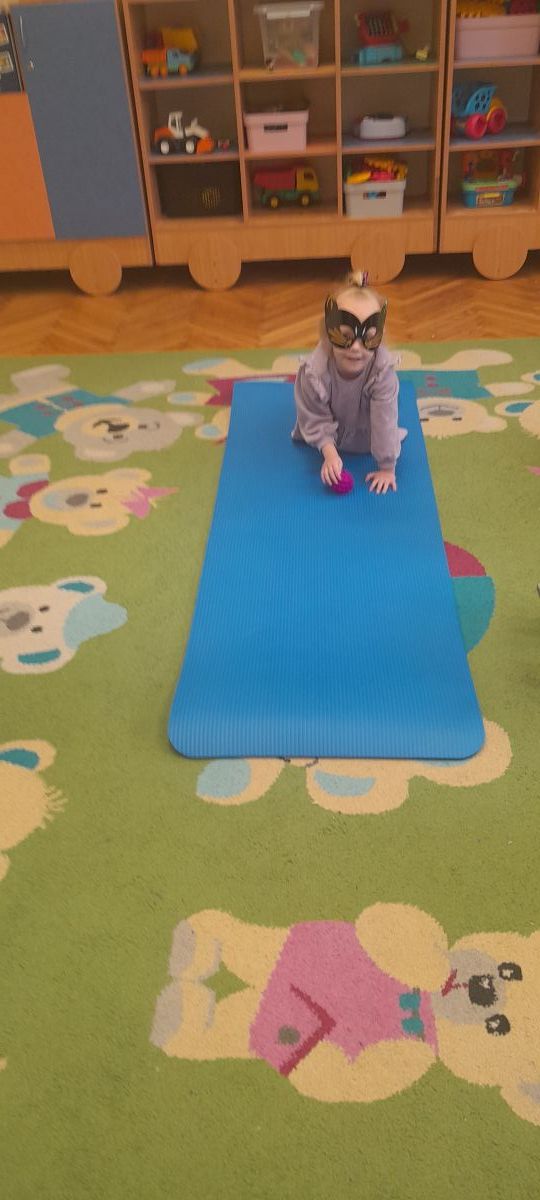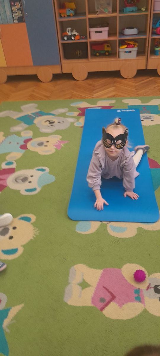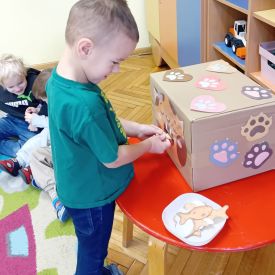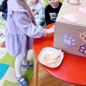 Przedszkolaki dzielnie pokonały przygotowany tor przeszkód, naśladując zwinne i sprytne kotki. Czołgały się przez tunel, przeskakiwały przeszkody starając się poruszać zwinnie i cicho jak prawdziwe kotki. Następnie karmiły „kotka” rybkami, ćwicząc przy tym celność i koordynację wzrokowo-ruchową.