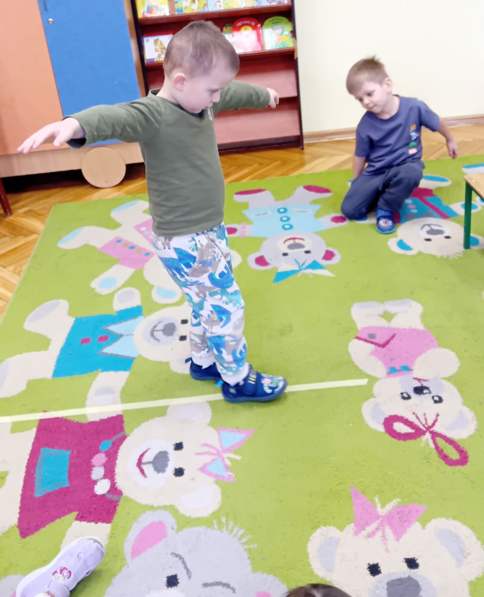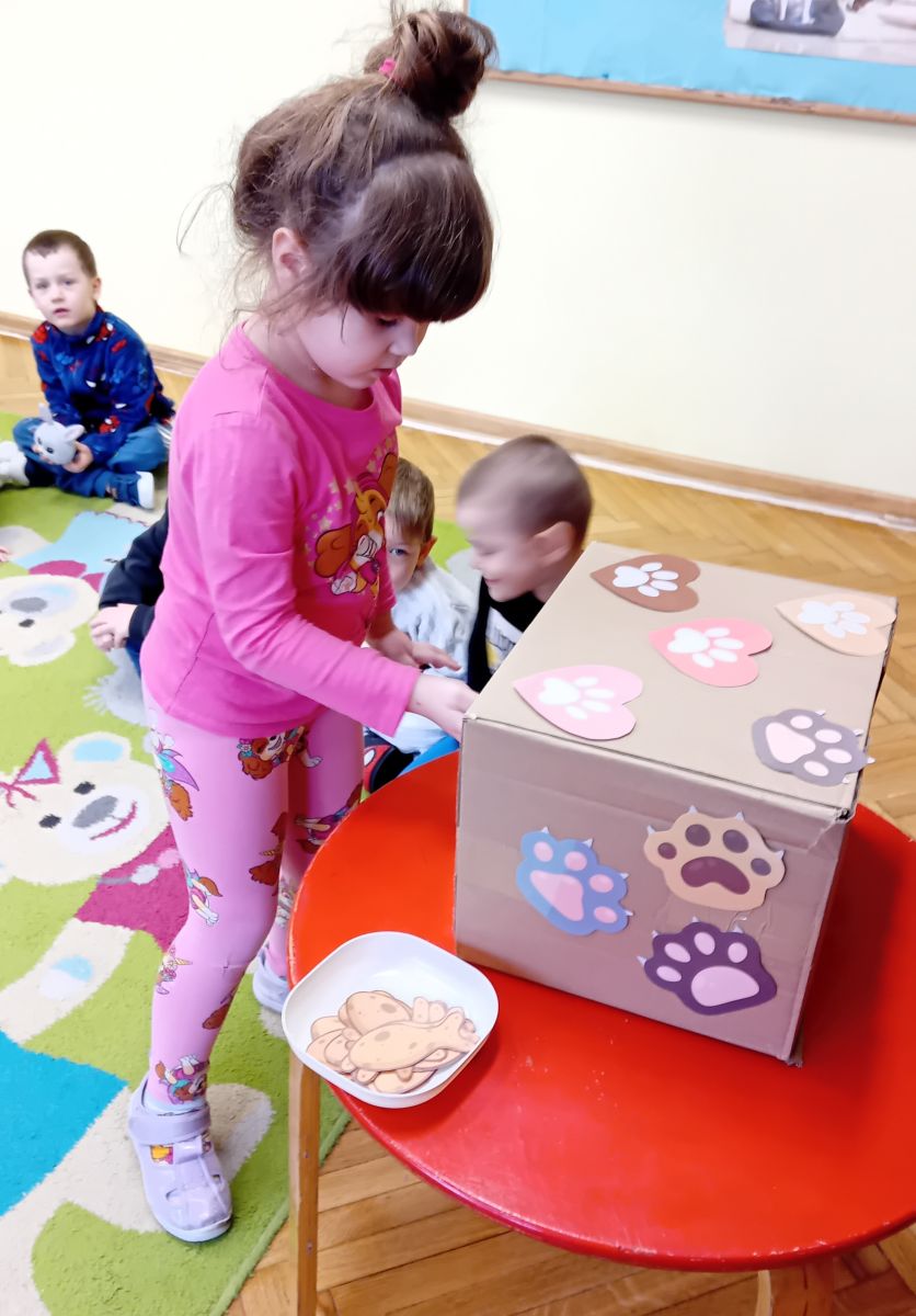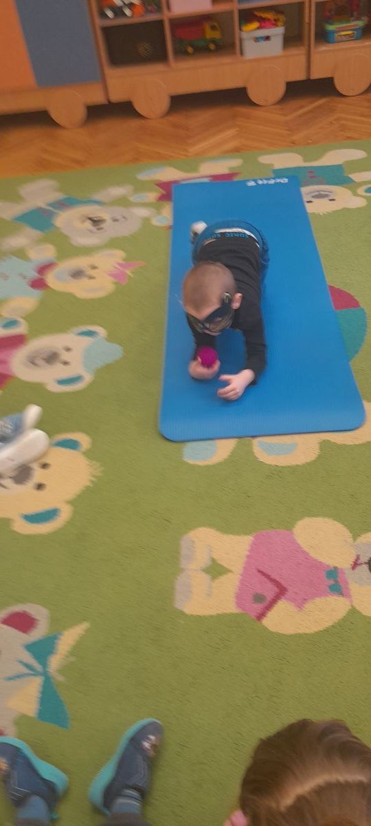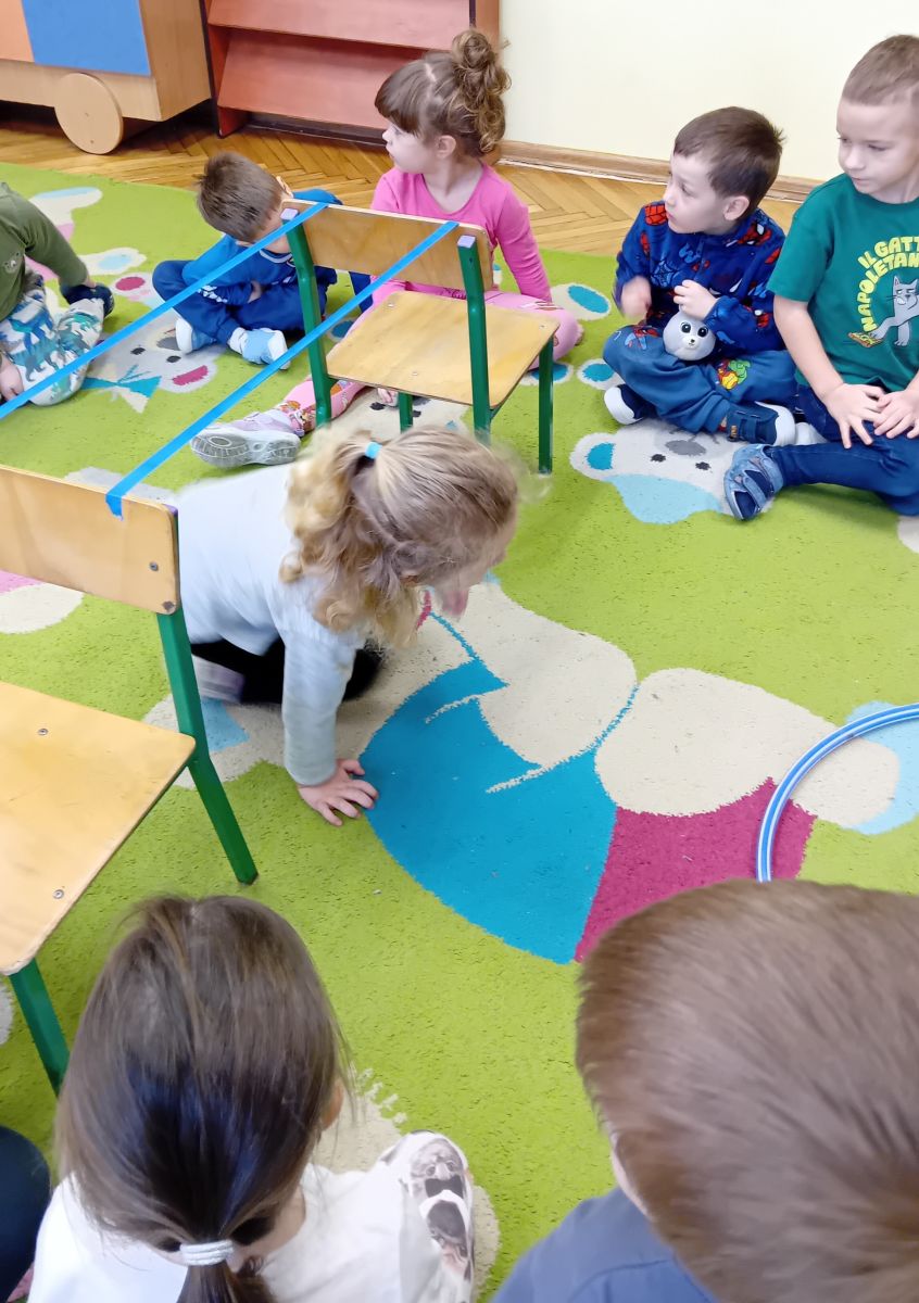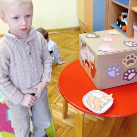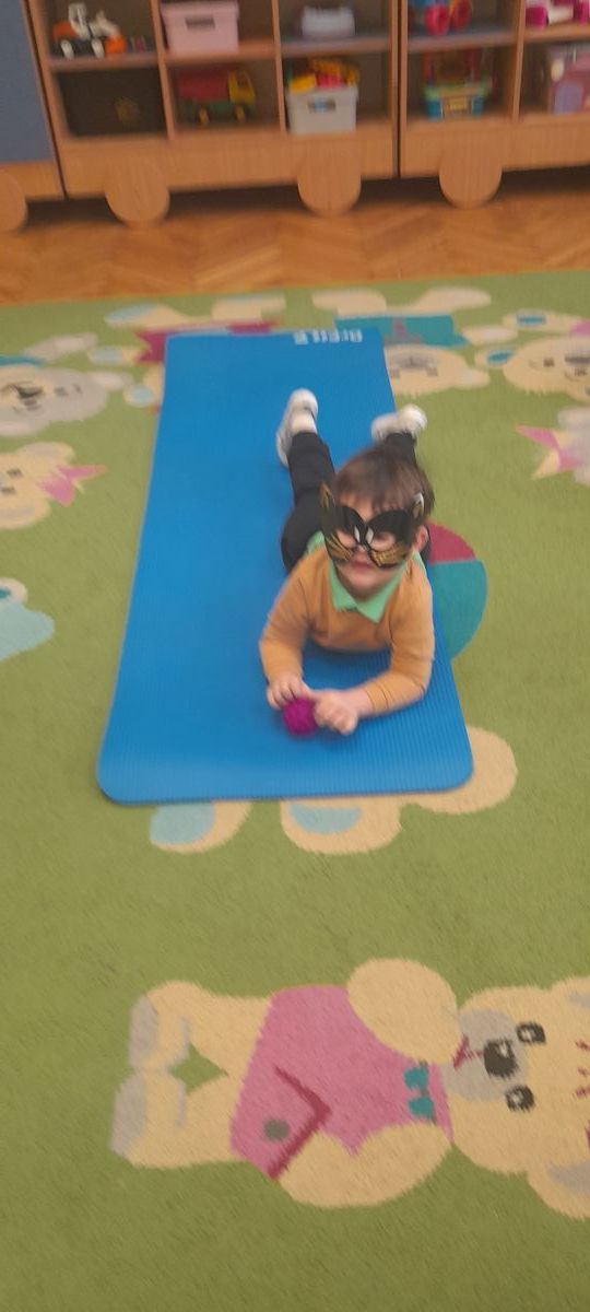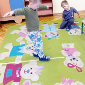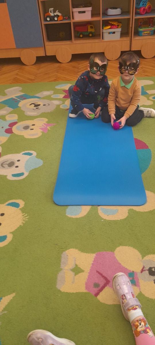 Przedszkolaki dzielnie pokonały przygotowany tor przeszkód, naśladując zwinne i sprytne kotki. Czołgały się przez tunel, przeskakiwały przeszkody starając się poruszać zwinnie i cicho jak prawdziwe kotki. Następnie karmiły „kotka” rybkami, ćwicząc przy tym celność i koordynację wzrokowo-ruchową.