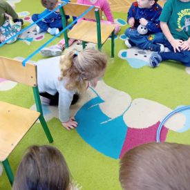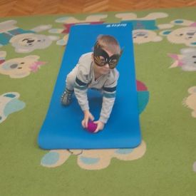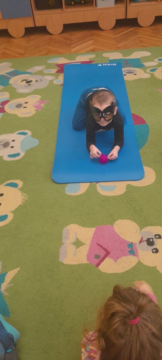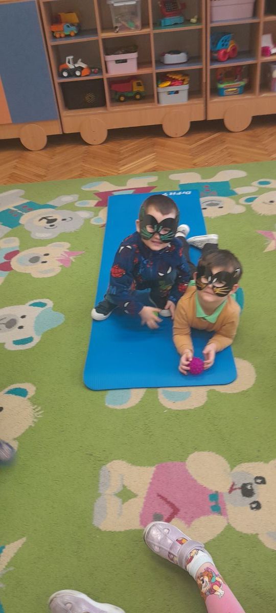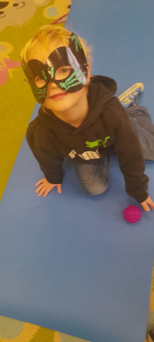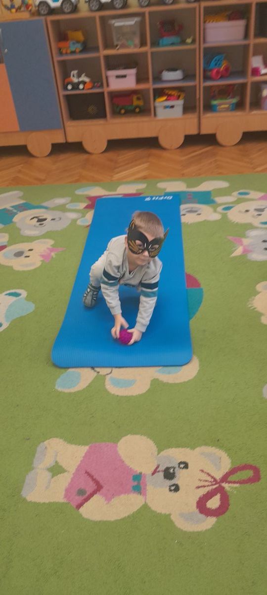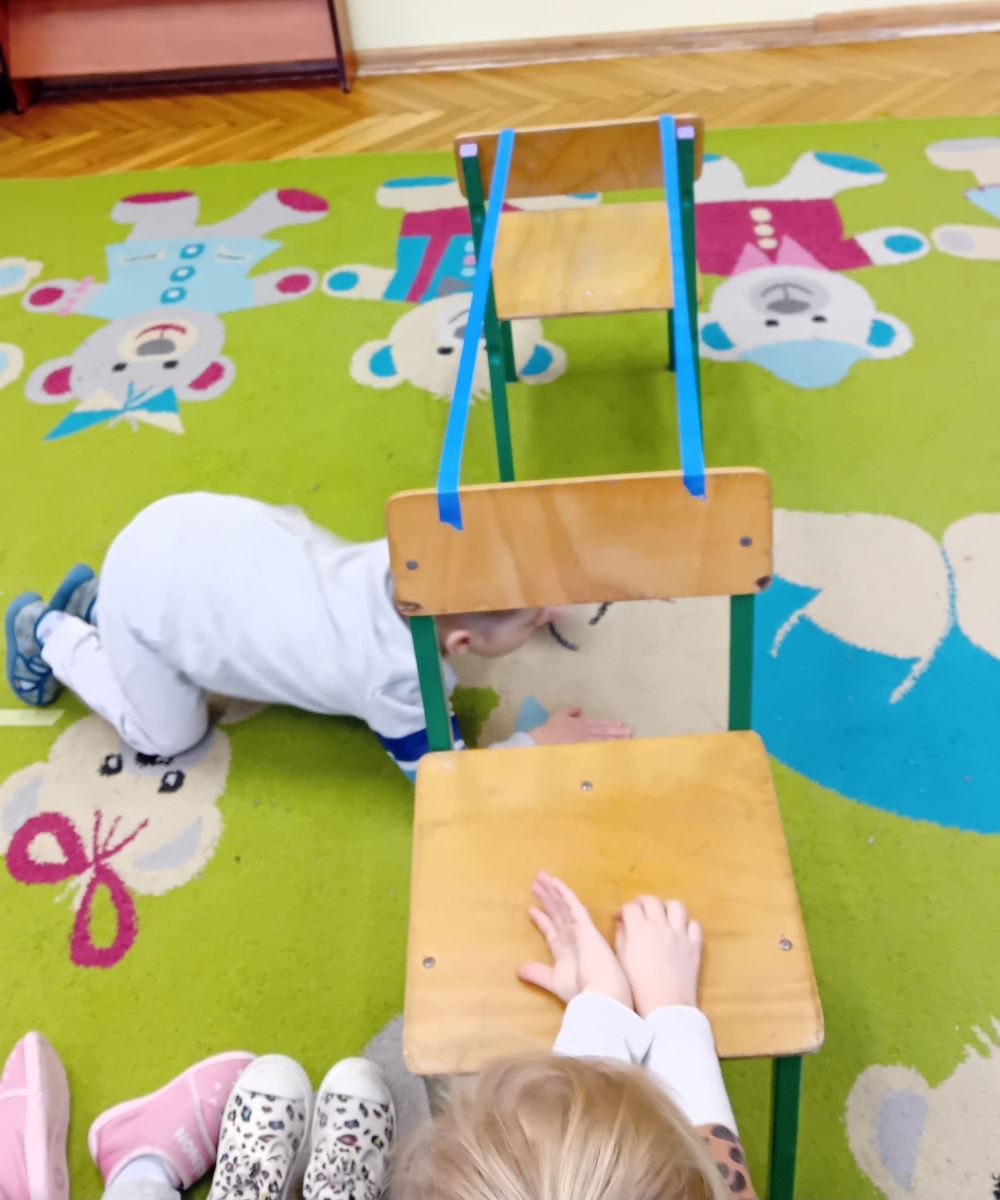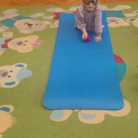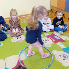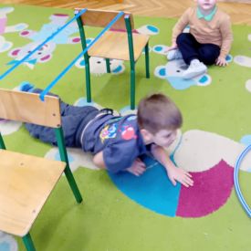 Przedszkolaki dzielnie pokonały przygotowany tor przeszkód, naśladując zwinne i sprytne kotki. Czołgały się przez tunel, przeskakiwały przeszkody starając się poruszać zwinnie i cicho jak prawdziwe kotki. Następnie karmiły „kotka” rybkami, ćwicząc przy tym celność i koordynację wzrokowo-ruchową.