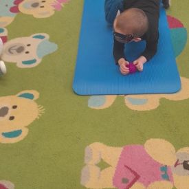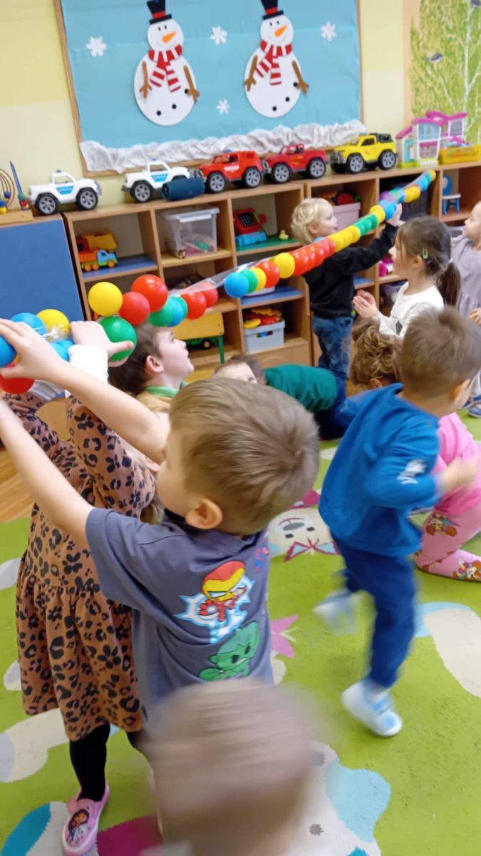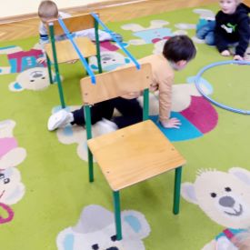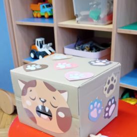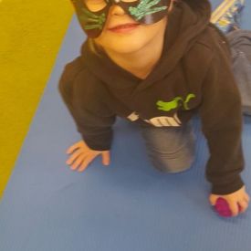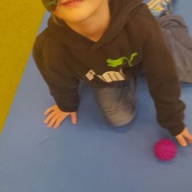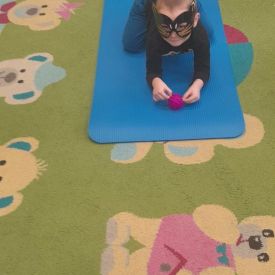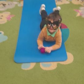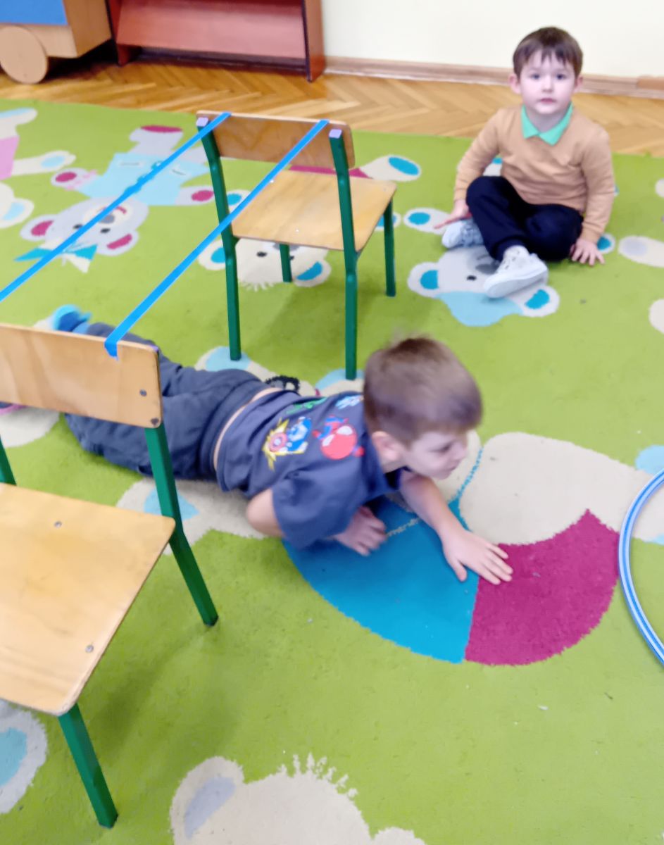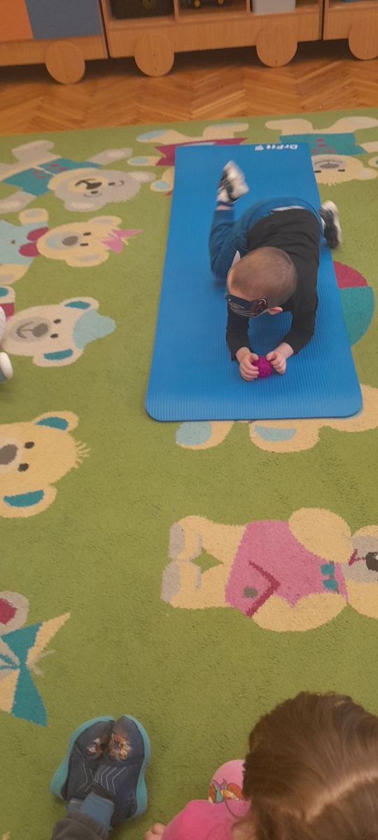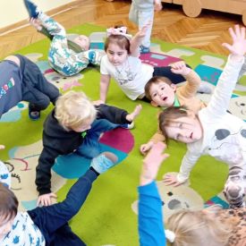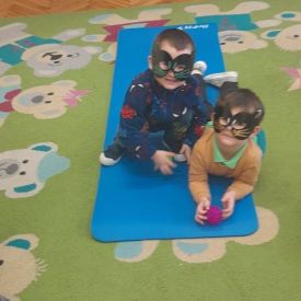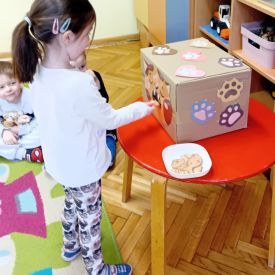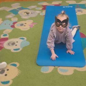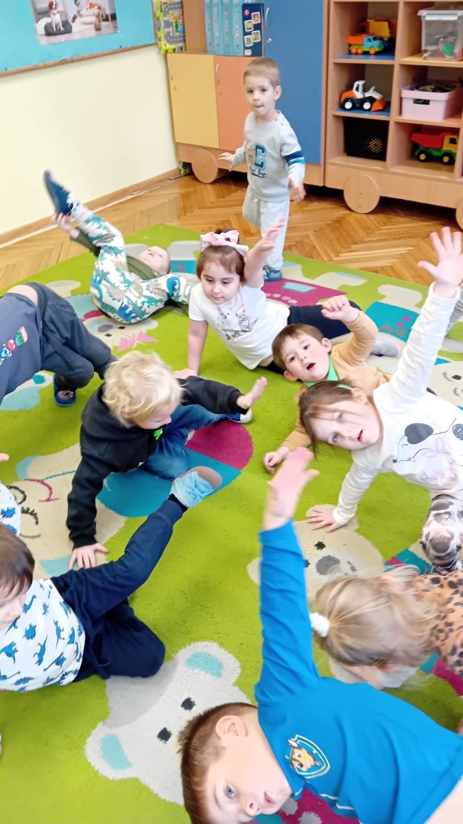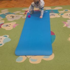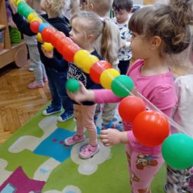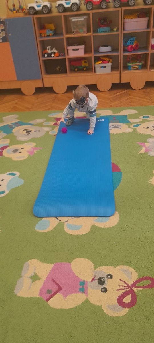 Przedszkolaki dzielnie pokonały przygotowany tor przeszkód, naśladując zwinne i sprytne kotki. Czołgały się przez tunel, przeskakiwały przeszkody starając się poruszać zwinnie i cicho jak prawdziwe kotki. Następnie karmiły „kotka” rybkami, ćwicząc przy tym celność i koordynację wzrokowo-ruchową.