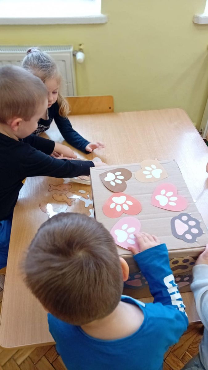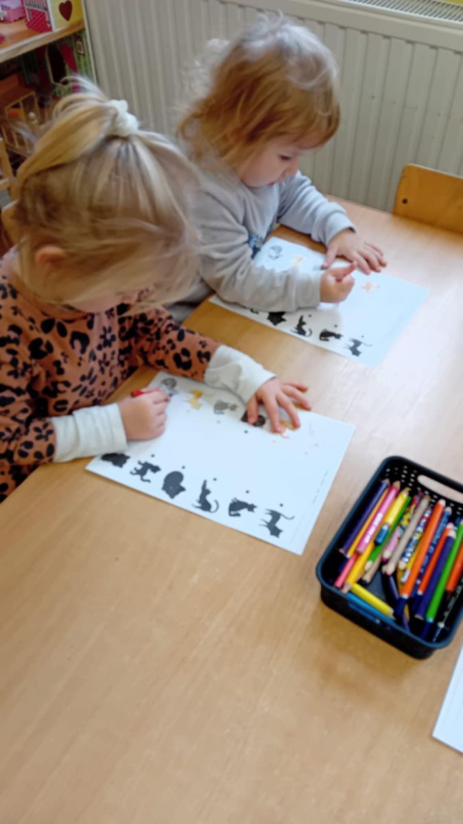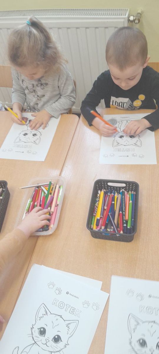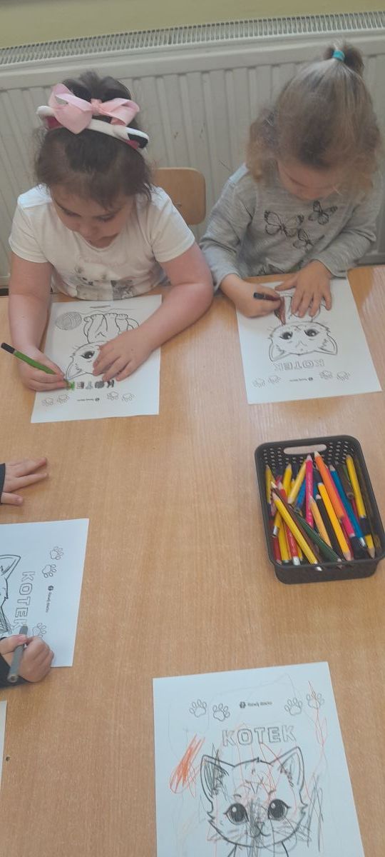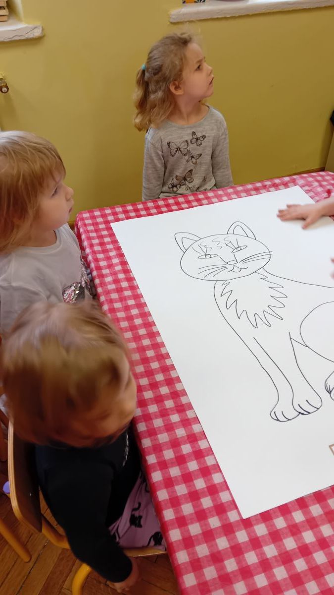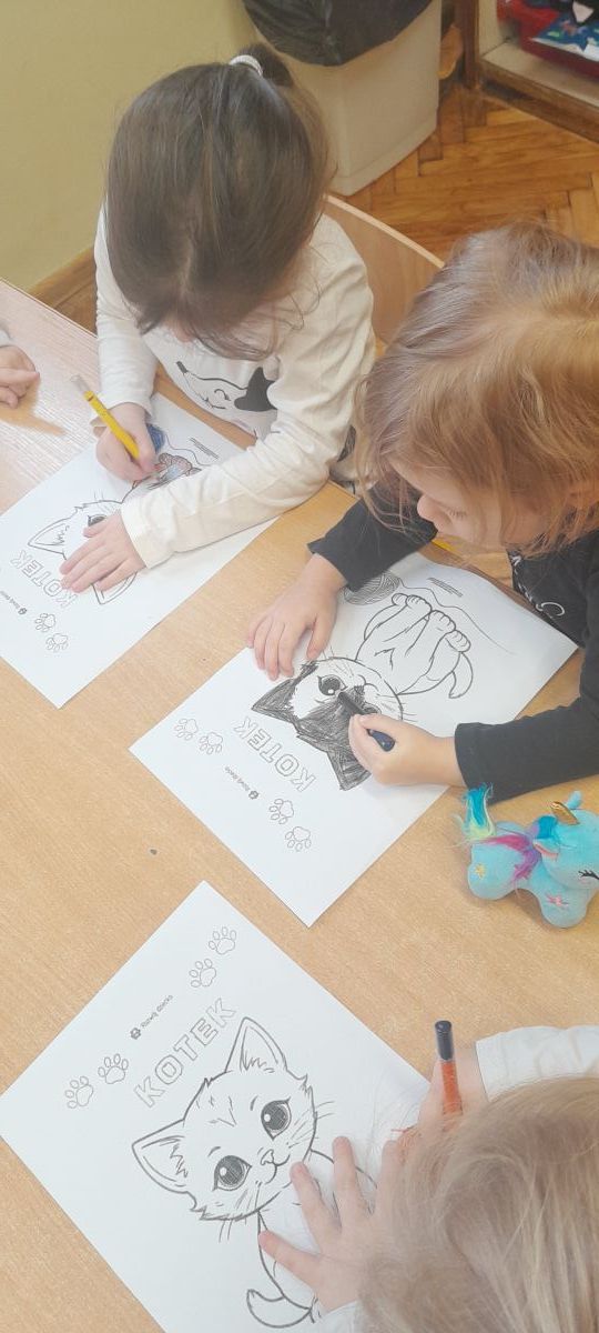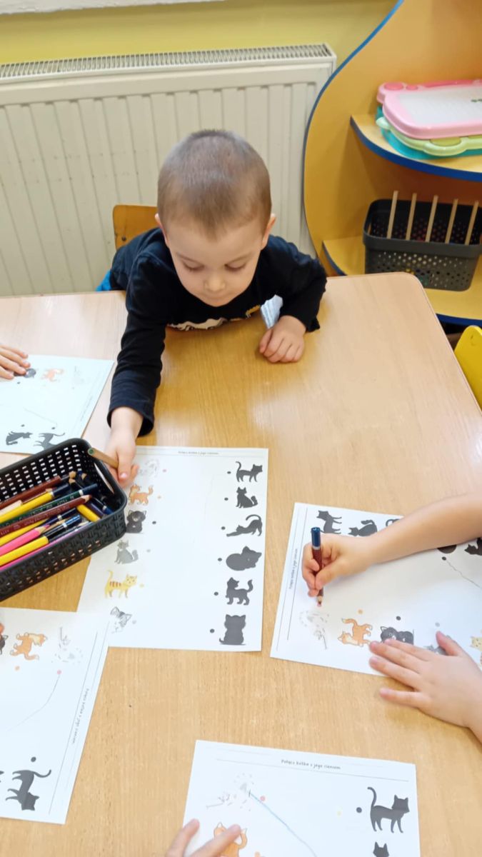 Podczas zajęć dydaktycznych dzieci uważnie słuchały opowiadania czytanego przez nauczyciela i wskazywały obrazek kotka, o którym była mowa. Wykonywały także karty pracy – dopasowywały kotka do jego cienia, doskonaląc percepcję wzrokową. Nie zabrakło działań plastycznych – przedszkolaki malowały sylwetę kotka oraz kolorowały rysunki przedstawiające te zwierzęta.