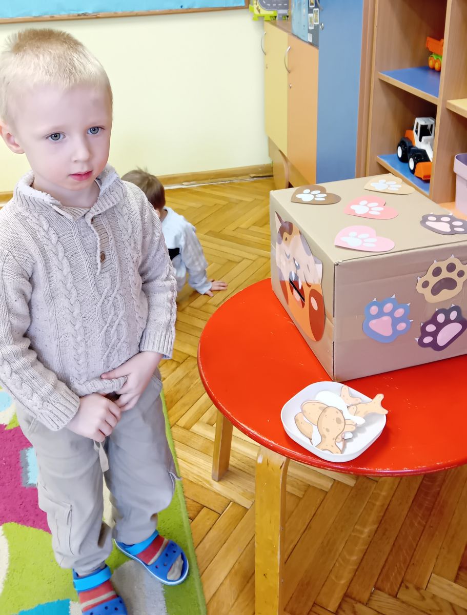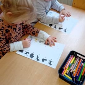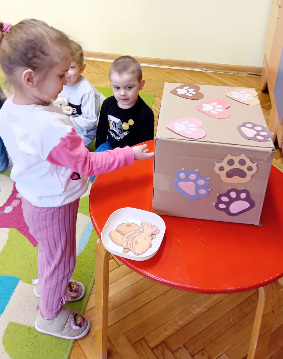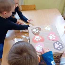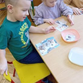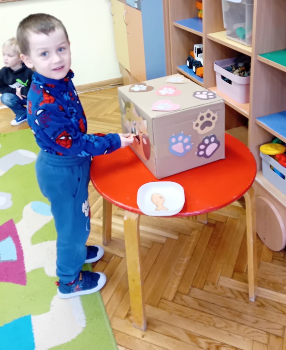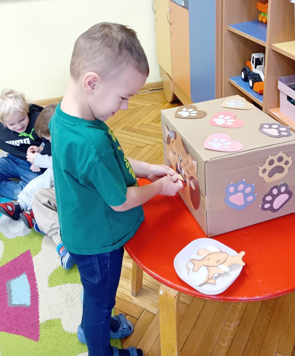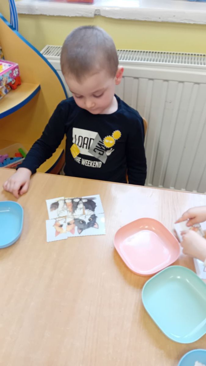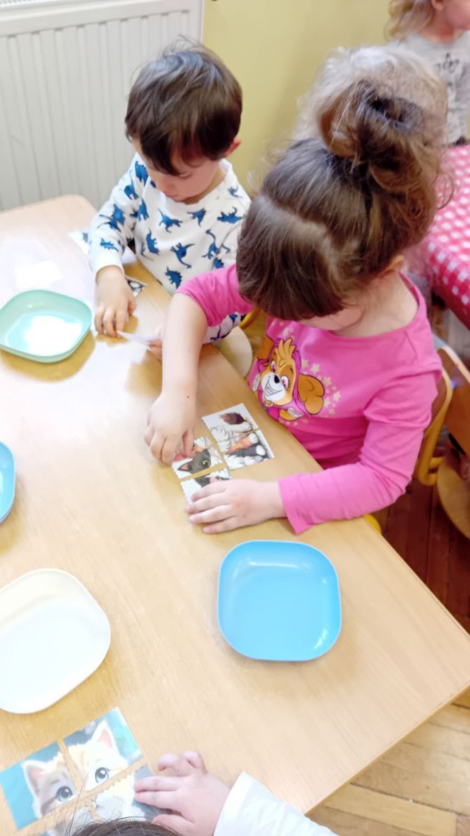 Podczas zajęć dydaktycznych dzieci uważnie słuchały opowiadania czytanego przez nauczyciela i wskazywały obrazek kotka, o którym była mowa. Wykonywały także karty pracy – dopasowywały kotka do jego cienia, doskonaląc percepcję wzrokową. Nie zabrakło działań plastycznych – przedszkolaki malowały sylwetę kotka oraz kolorowały rysunki przedstawiające te zwierzęta.
