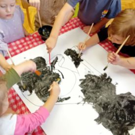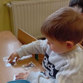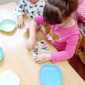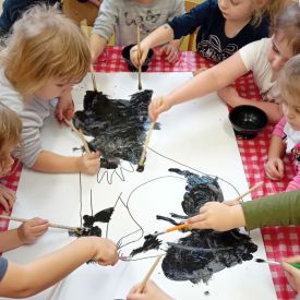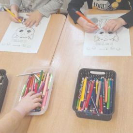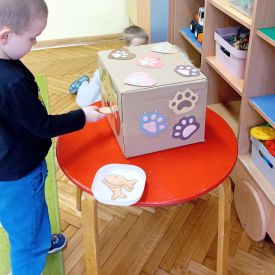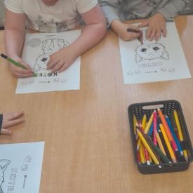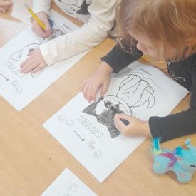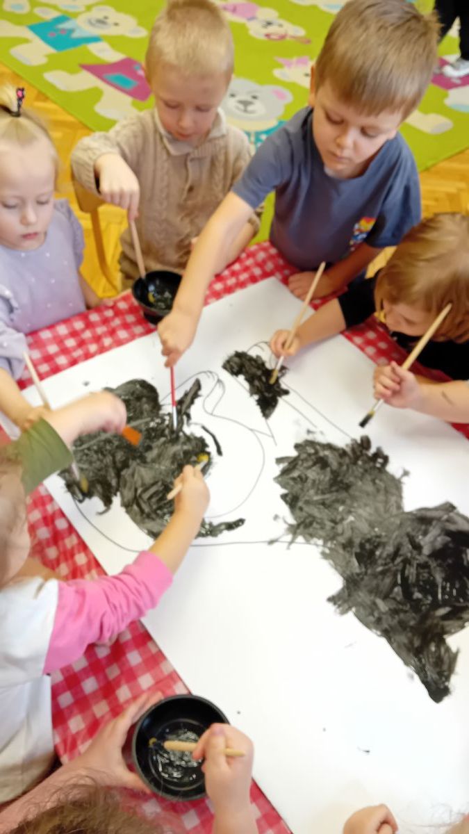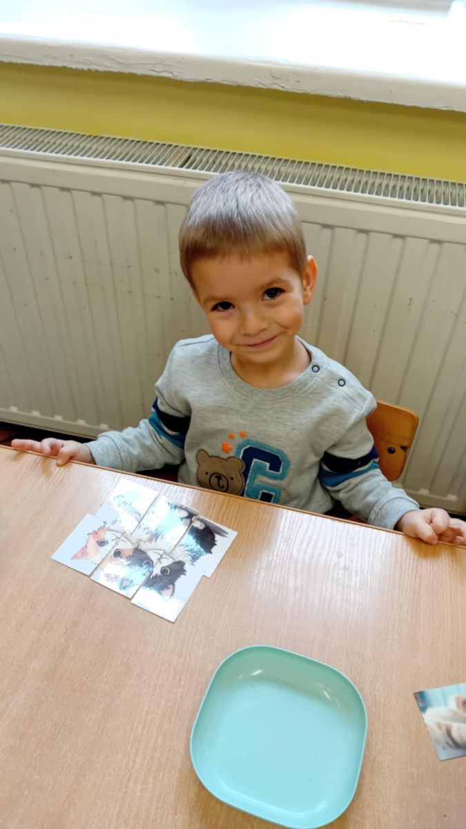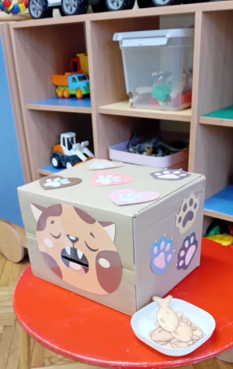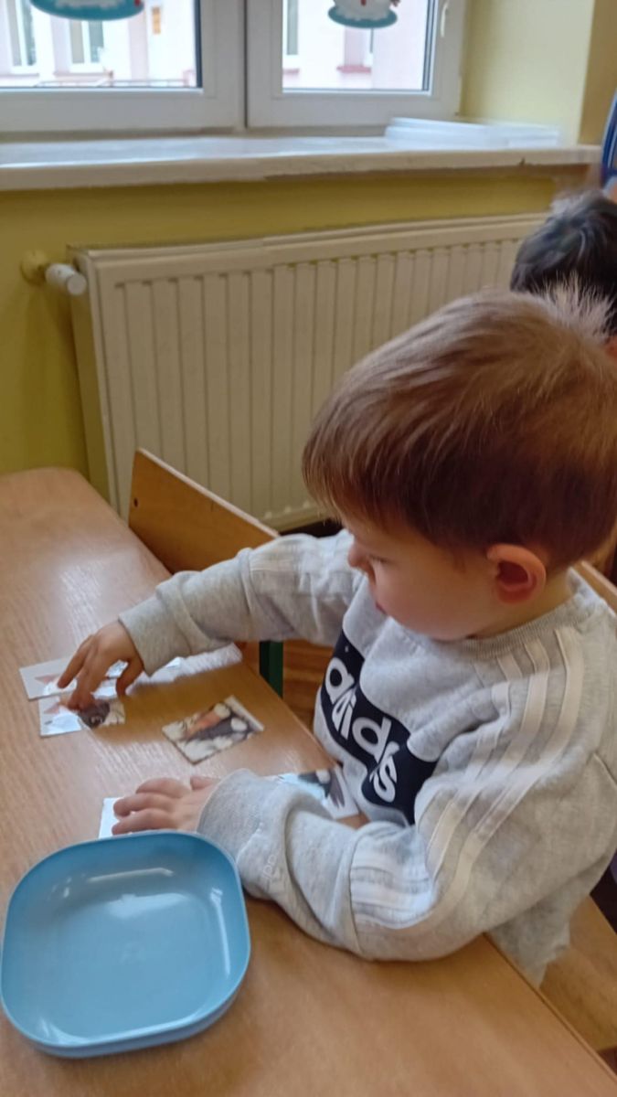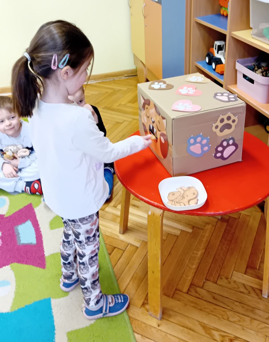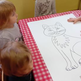 Podczas zajęć dydaktycznych dzieci uważnie słuchały opowiadania czytanego przez nauczyciela i wskazywały obrazek kotka, o którym była mowa. Wykonywały także karty pracy – dopasowywały kotka do jego cienia, doskonaląc percepcję wzrokową. Nie zabrakło działań plastycznych – przedszkolaki malowały sylwetę kotka oraz kolorowały rysunki przedstawiające te zwierzęta.