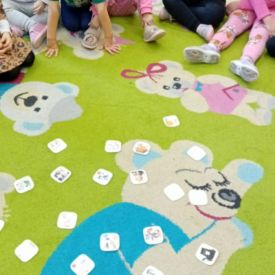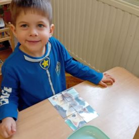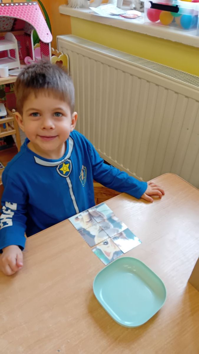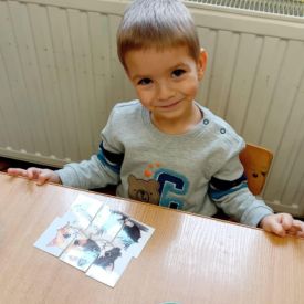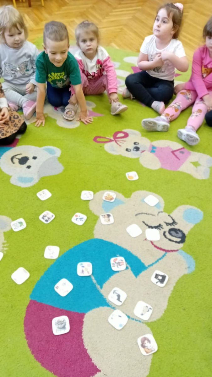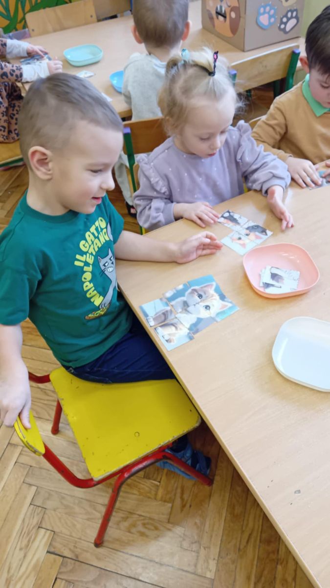 Dużo radości sprawiła dzieciom zabawa ruchowa „Kot i myszy”, podczas której mogły wykazać się szybkością i refleksem. „Misie” układały również puzzle z wizerunkiem kotów, rozwijając spostrzegawczość i koncentrację. Naśladowały pozycje kotków przedstawionych na rysunkach, co było świetnym ćwiczeniem równowagi i świadomości ciała.