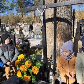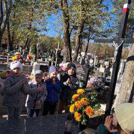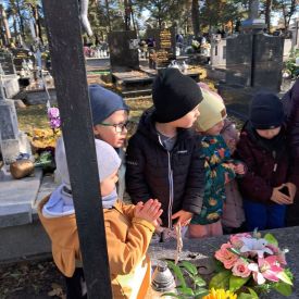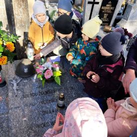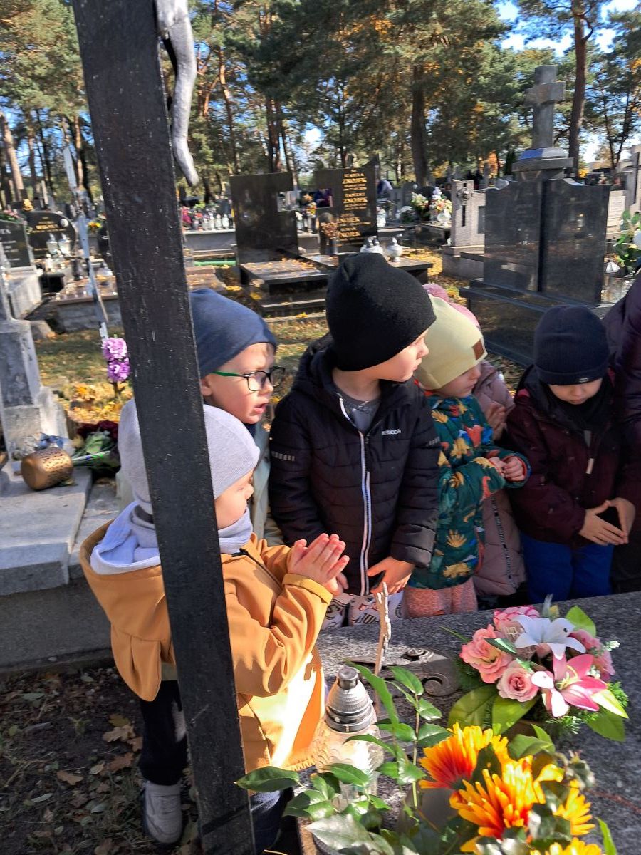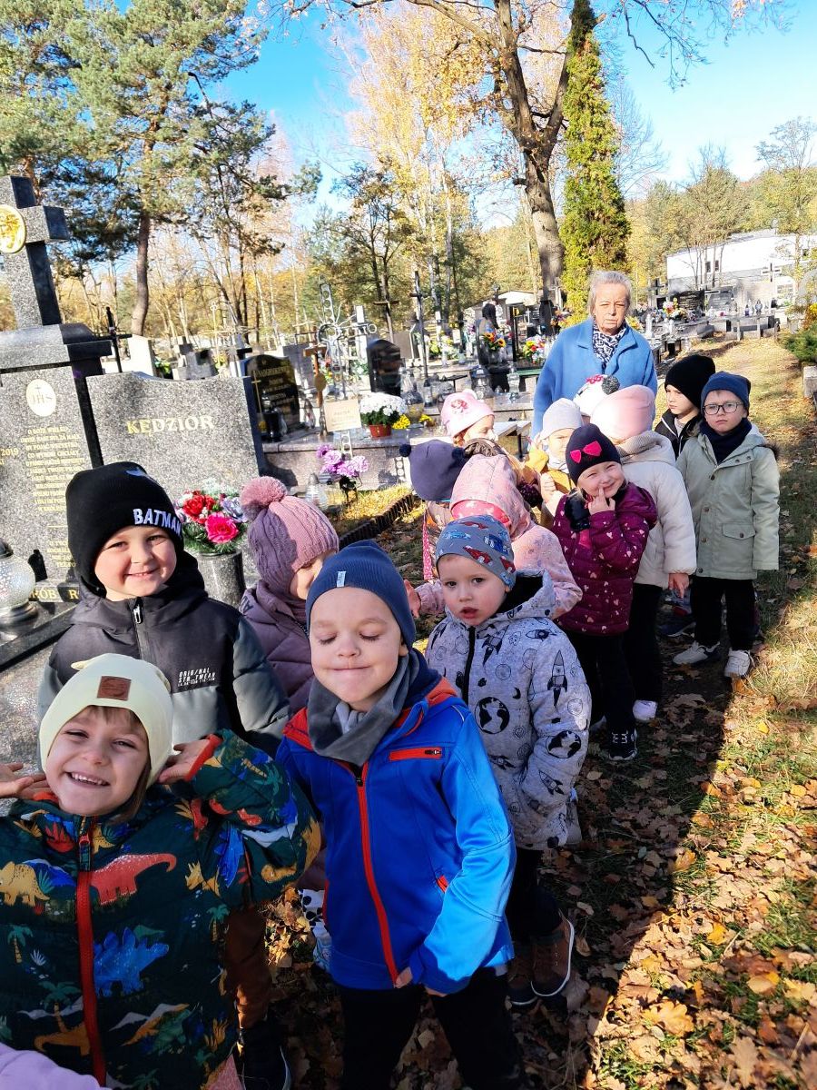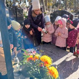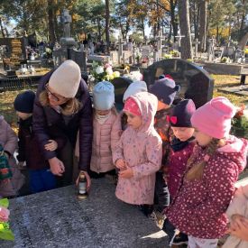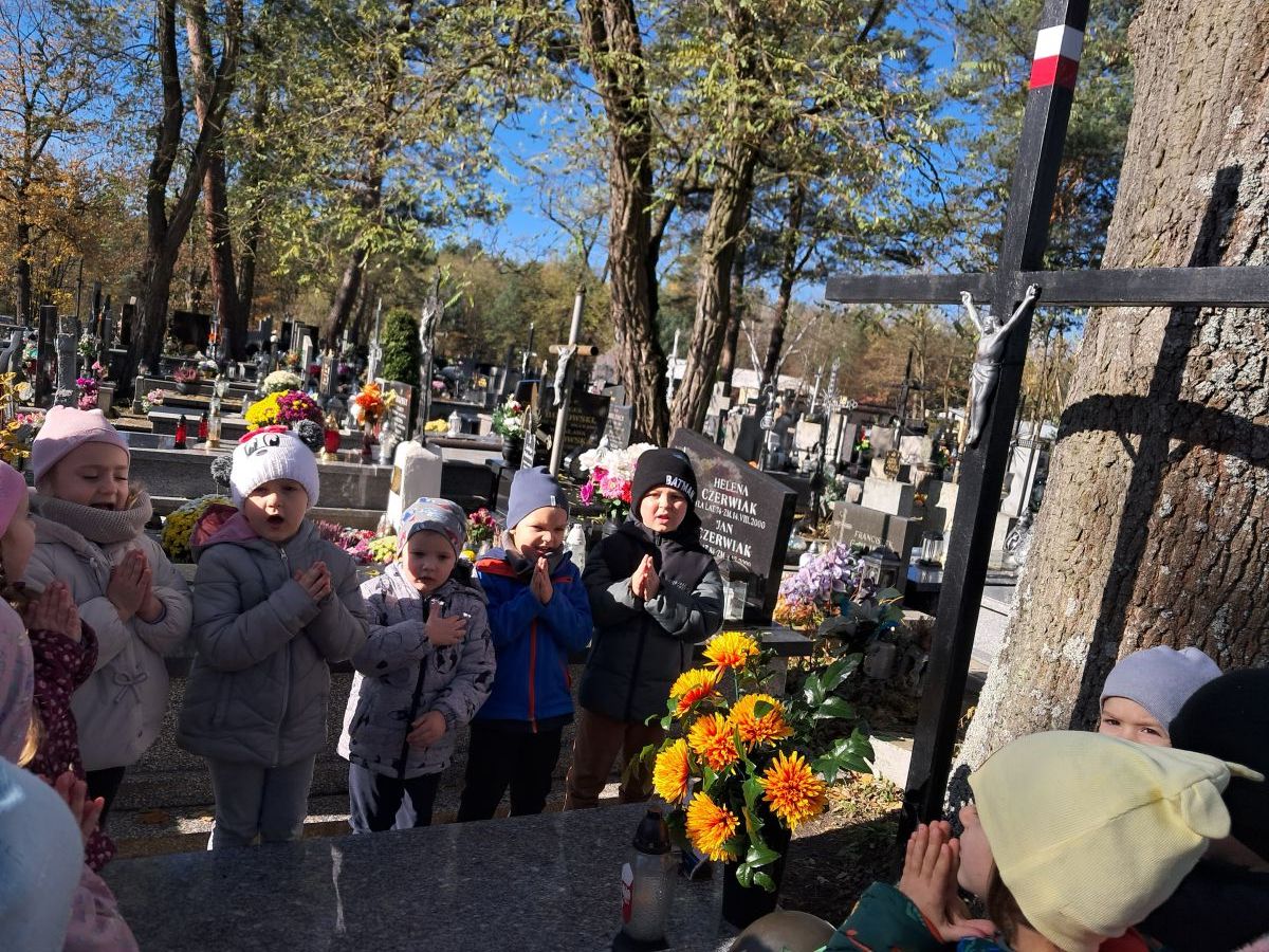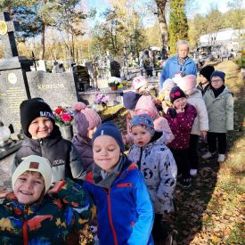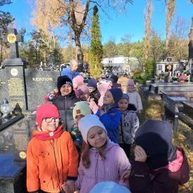 Korzystając ze słonecznej pogody, przedszkolaki z grupy II Motylki udały się na spacer na pobliski cmentarz. Z zaciekawieniem wysłuchały krótkiej lekcji historii.
