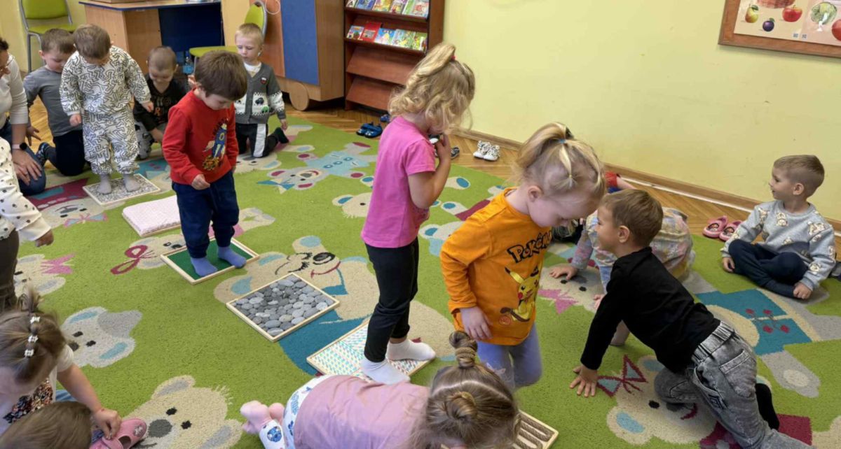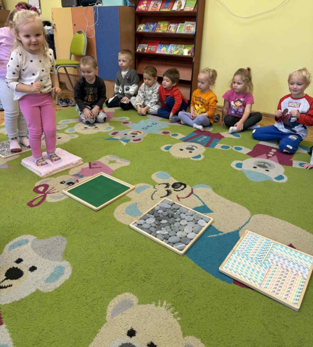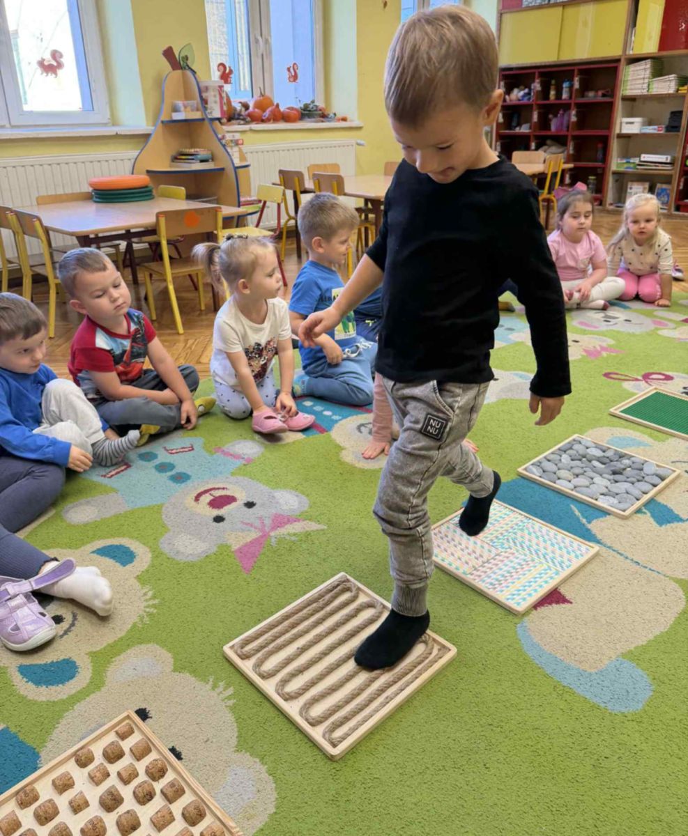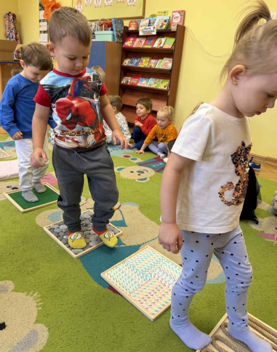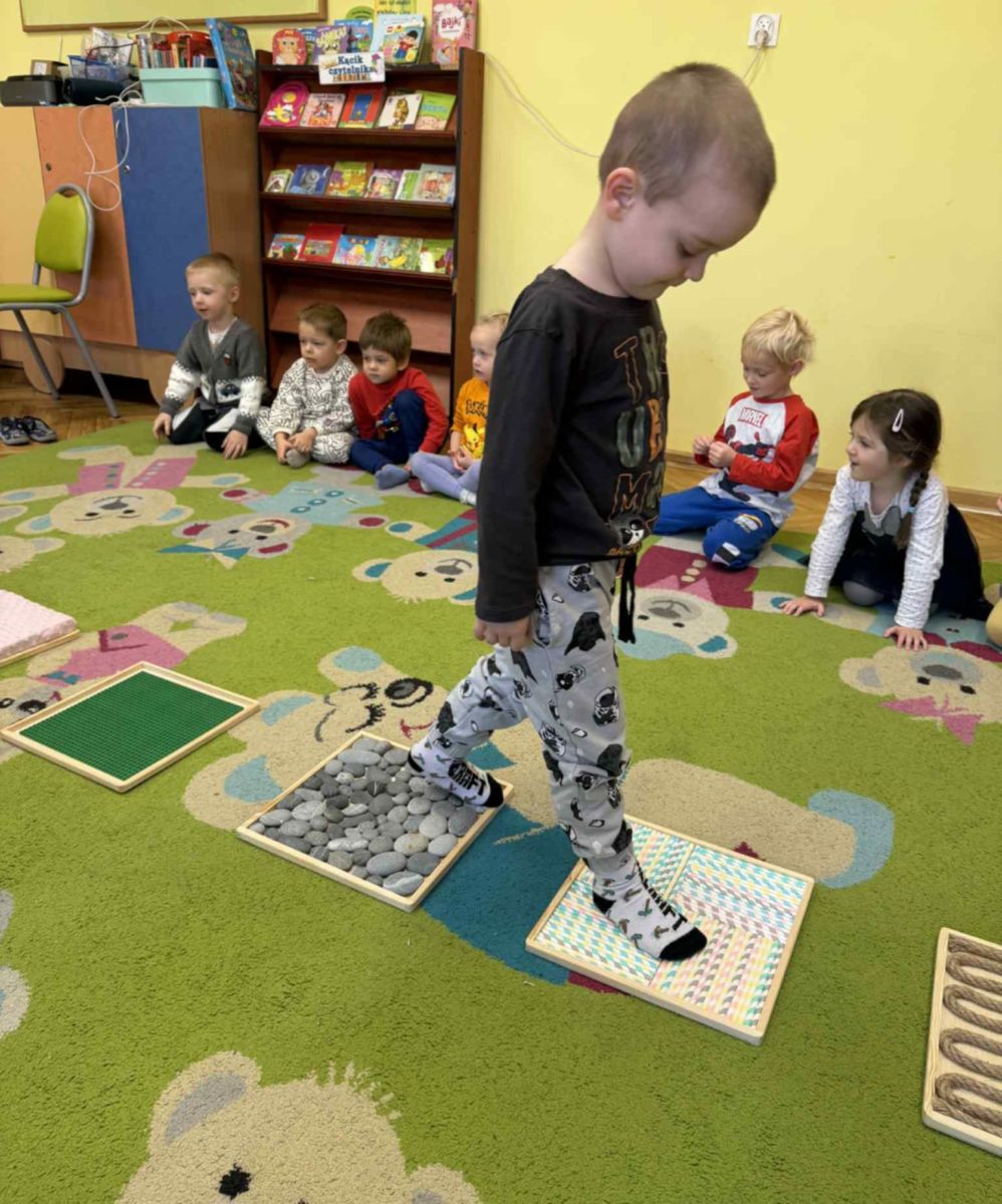 W grupie „Misie” odbywają się regularne zajęcia z wykorzystaniem ścieżki sensorycznej. To wspaniała forma aktywności, która nie tylko sprawia dzieciom ogromną radość, ale również wspiera ich rozwój – pobudza zmysły, doskonali równowagę, koordynację ruchową i koncentrację.