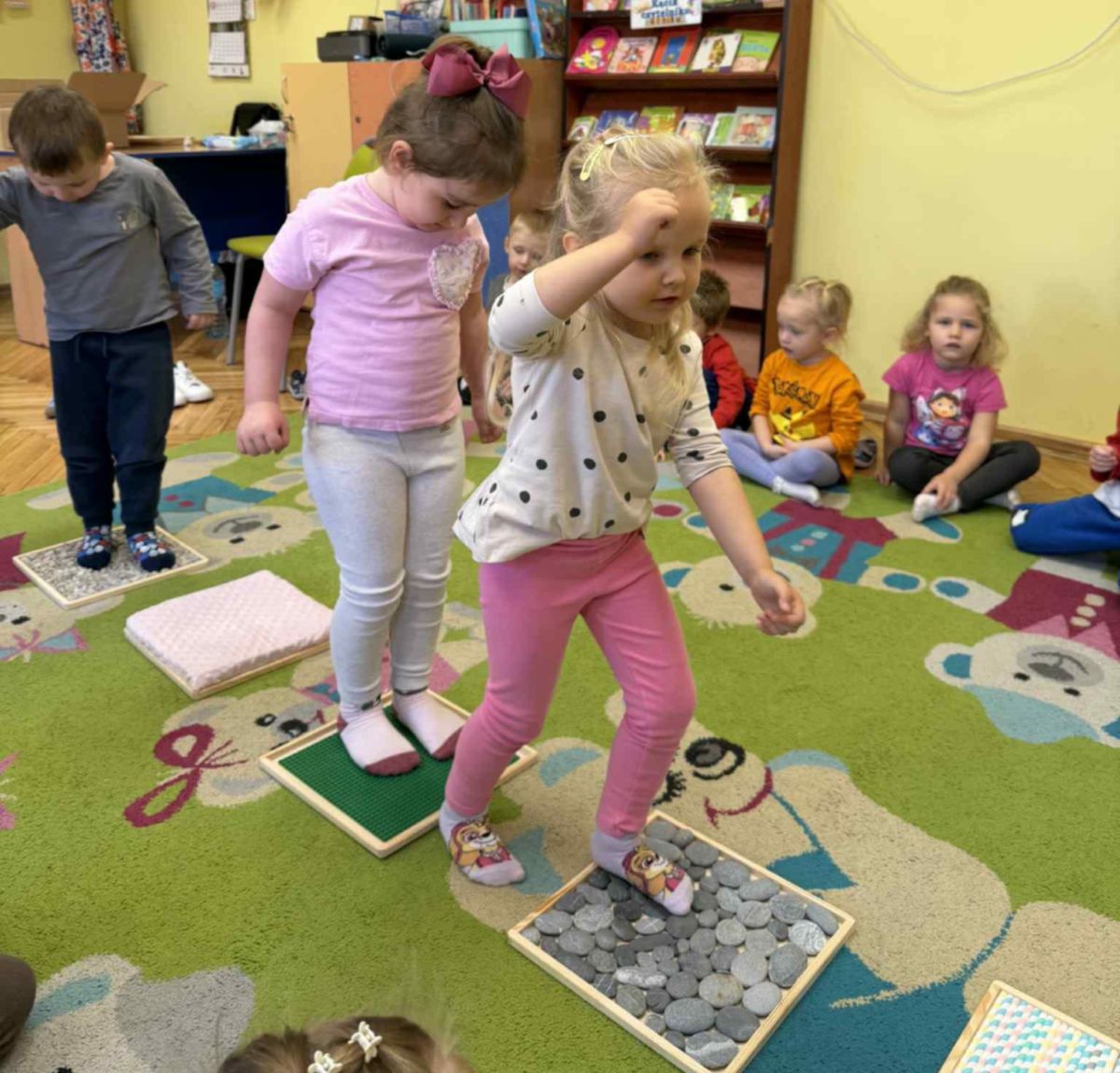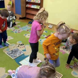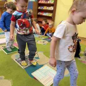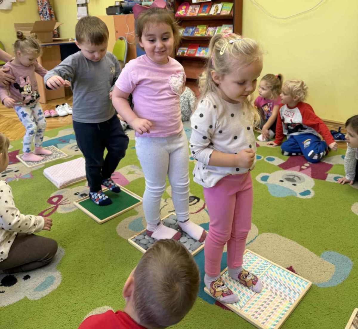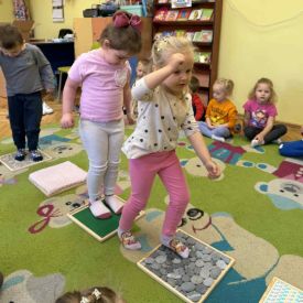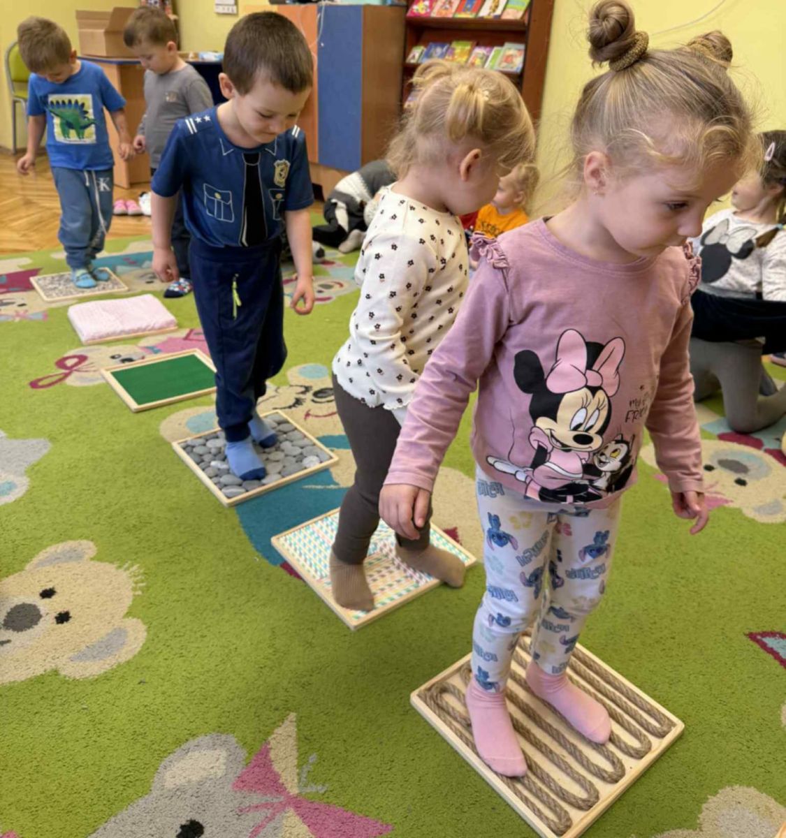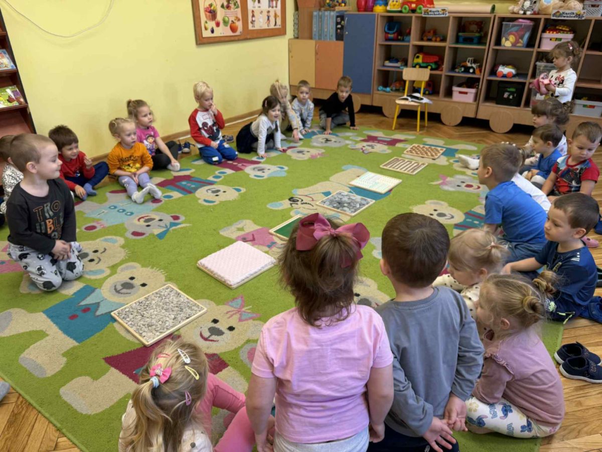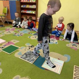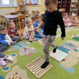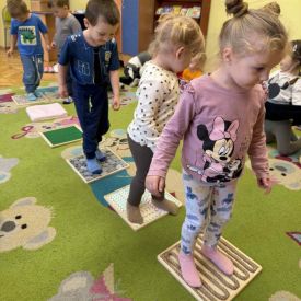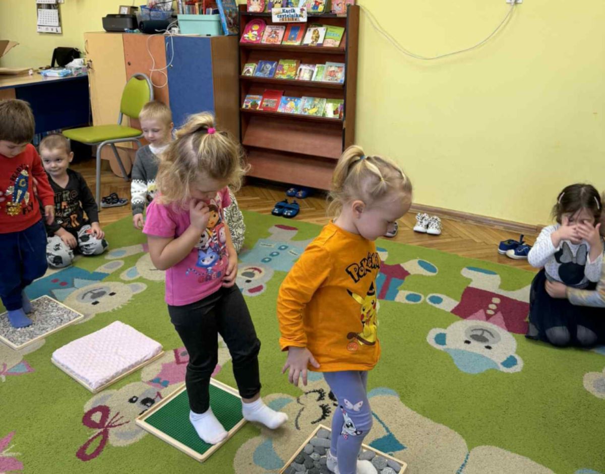 W grupie „Misie” odbywają się regularne zajęcia z wykorzystaniem ścieżki sensorycznej. To wspaniała forma aktywności, która nie tylko sprawia dzieciom ogromną radość, ale również wspiera ich rozwój – pobudza zmysły, doskonali równowagę, koordynację ruchową i koncentrację.