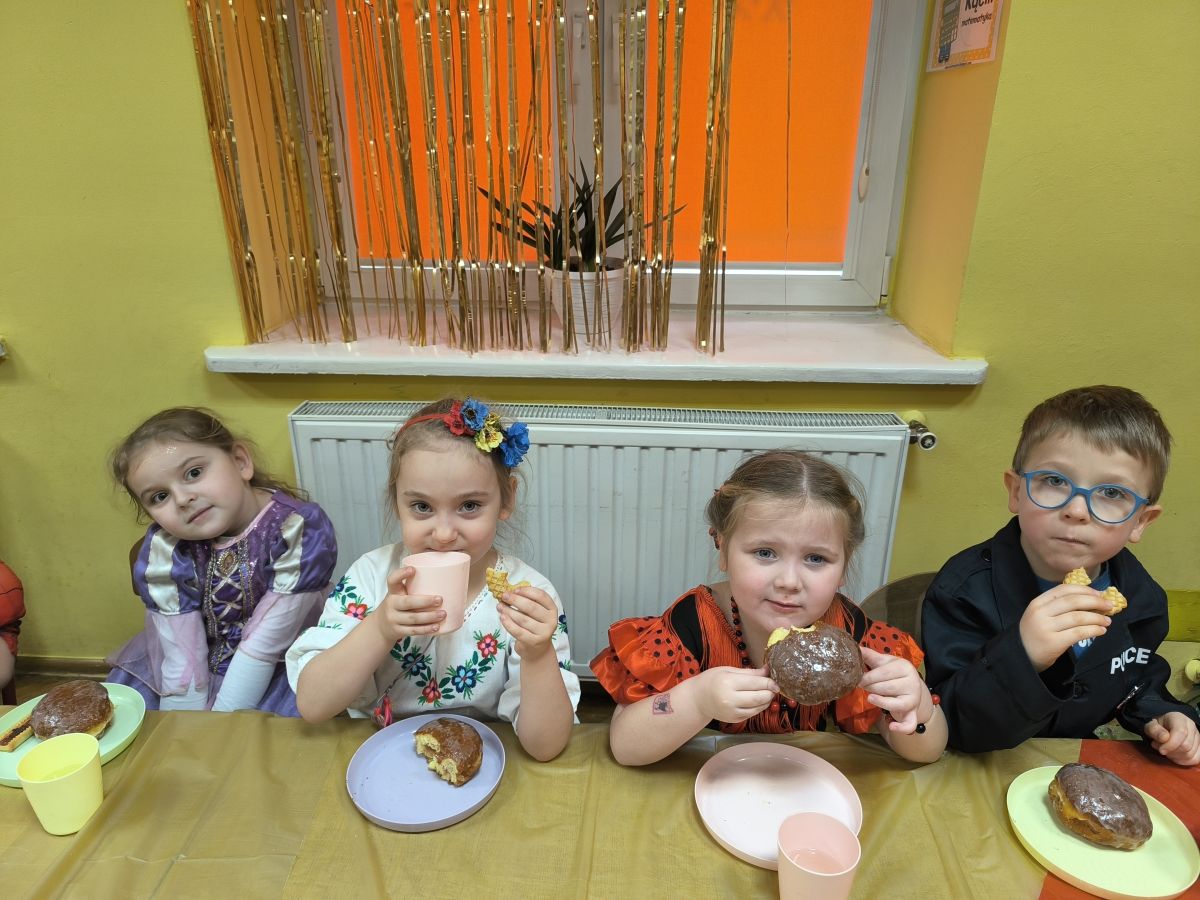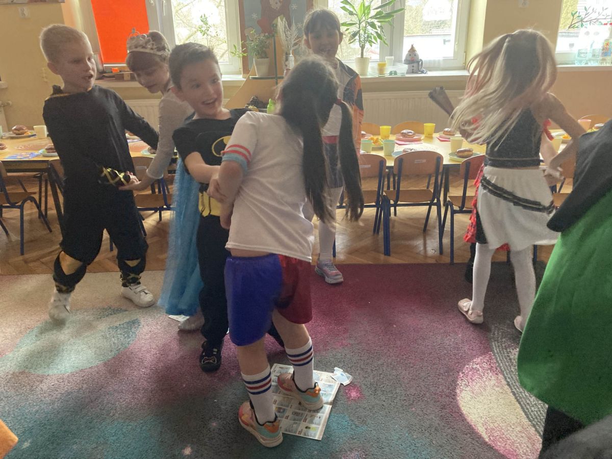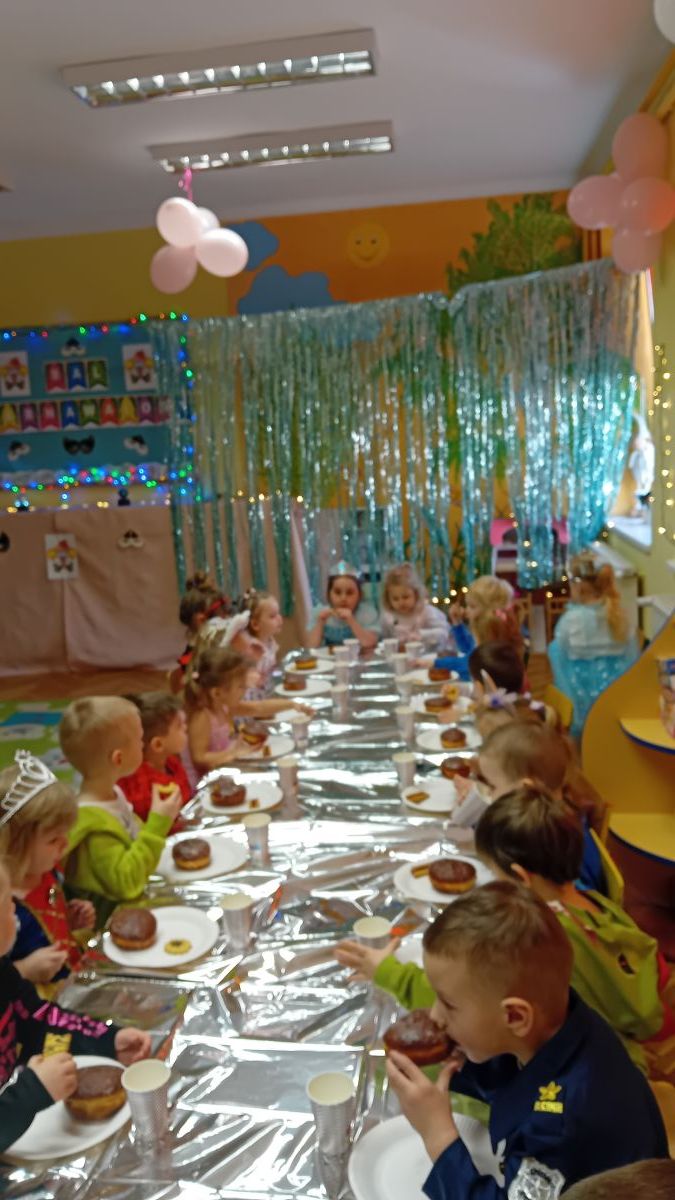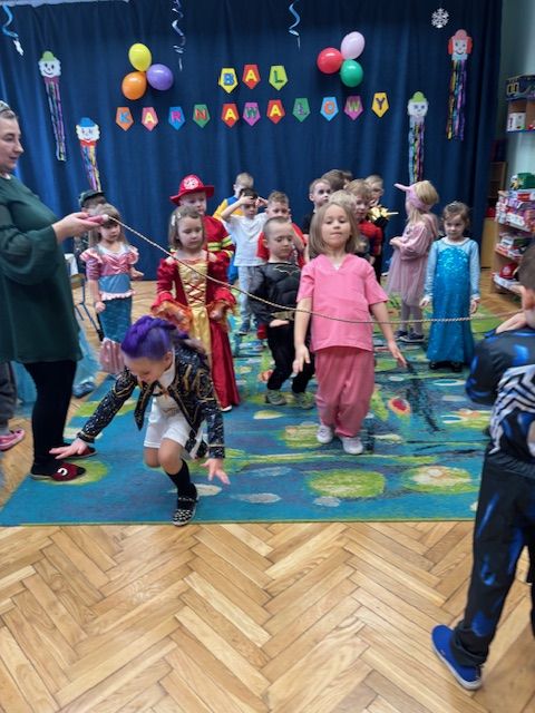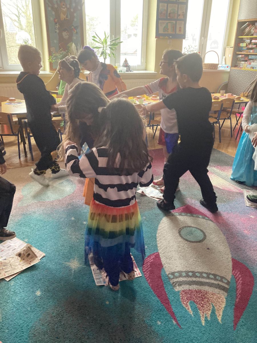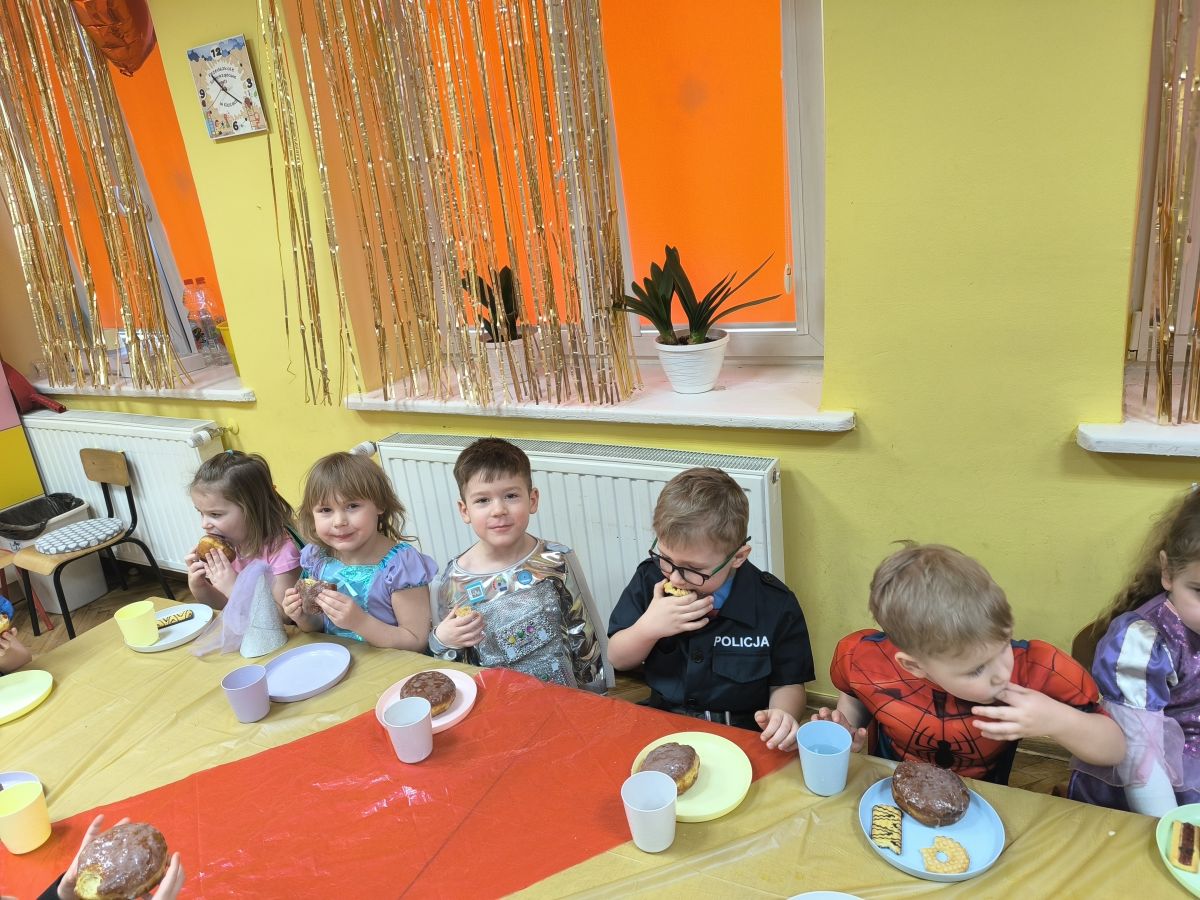 Grupa III „Ananaski” zachwyciła pomysłowością podczas zabawy pantomimicznej „Najpiękniejszy strój”. Dzieci poprzez ruch i gest prezentowały swoje kostiumy, rozwijając wyobraźnię i odwagę sceniczną. Nie zabrakło także zabaw integracyjnych – „tańca na gazetach”, limbo oraz radosnego podskakiwania „jak balony”. Przy dźwiękach karnawałowych hitów: „A ram sam sam”, „Jedzie pociąg”, „Mrówka tańczy sambę”, „Fredka Zgredka” czy „Solo” parkiet ani na chwilę nie pozostawał pusty. Tego dnia powstały również piękne prace plastyczne pt. „Tłusty Czwartek”, nawiązujące do słodkiej tradycji.