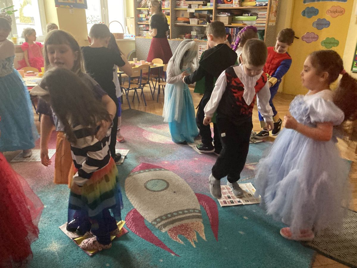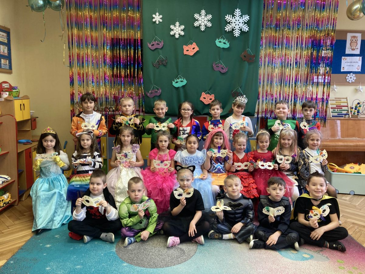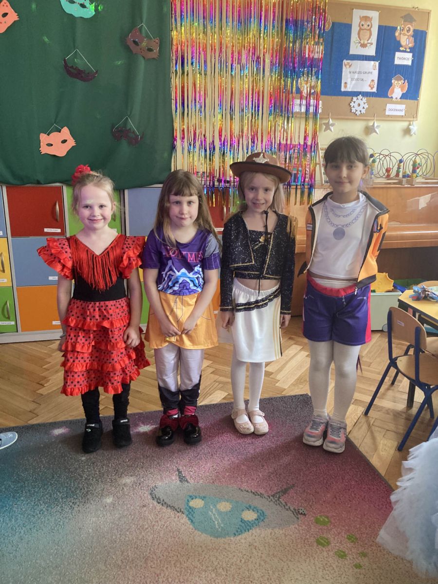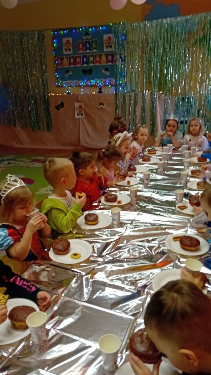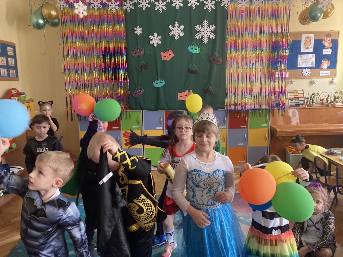 Grupa III „Ananaski” zachwyciła pomysłowością podczas zabawy pantomimicznej „Najpiękniejszy strój”. Dzieci poprzez ruch i gest prezentowały swoje kostiumy, rozwijając wyobraźnię i odwagę sceniczną. Nie zabrakło także zabaw integracyjnych – „tańca na gazetach”, limbo oraz radosnego podskakiwania „jak balony”. Przy dźwiękach karnawałowych hitów: „A ram sam sam”, „Jedzie pociąg”, „Mrówka tańczy sambę”, „Fredka Zgredka” czy „Solo” parkiet ani na chwilę nie pozostawał pusty. Tego dnia powstały również piękne prace plastyczne pt. „Tłusty Czwartek”, nawiązujące do słodkiej tradycji.