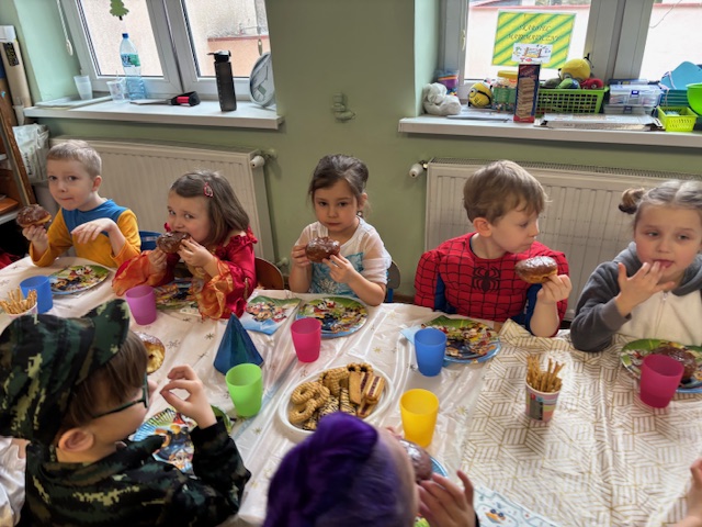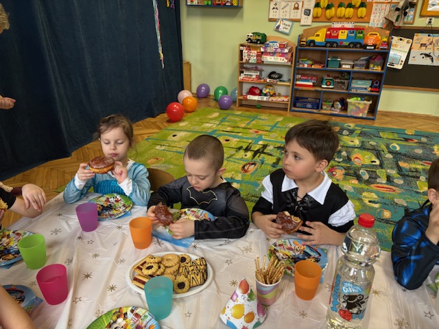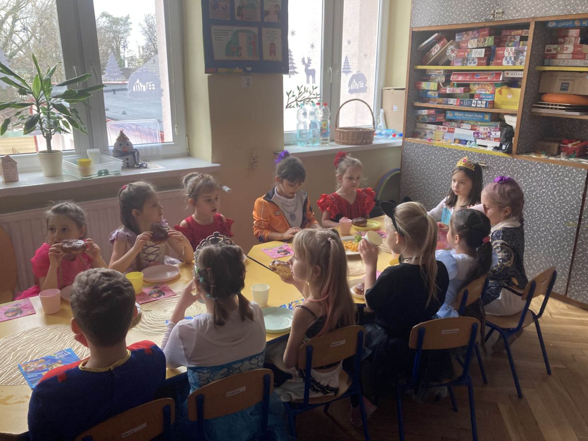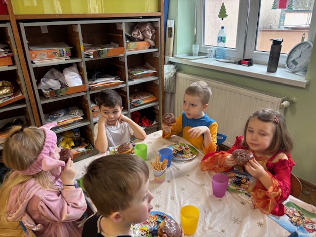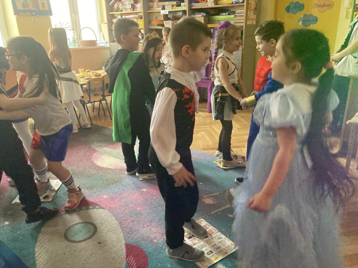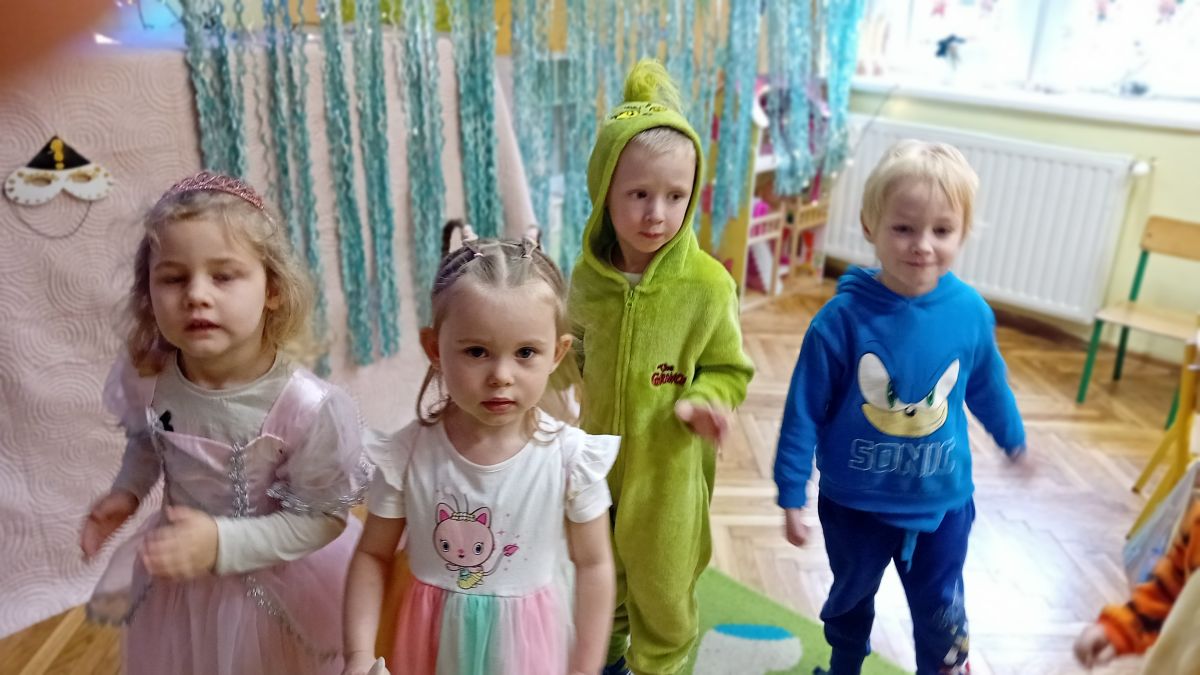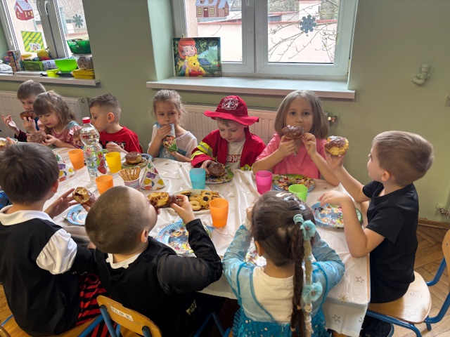 Grupa III „Ananaski” zachwyciła pomysłowością podczas zabawy pantomimicznej „Najpiękniejszy strój”. Dzieci poprzez ruch i gest prezentowały swoje kostiumy, rozwijając wyobraźnię i odwagę sceniczną. Nie zabrakło także zabaw integracyjnych – „tańca na gazetach”, limbo oraz radosnego podskakiwania „jak balony”. Przy dźwiękach karnawałowych hitów: „A ram sam sam”, „Jedzie pociąg”, „Mrówka tańczy sambę”, „Fredka Zgredka” czy „Solo” parkiet ani na chwilę nie pozostawał pusty. Tego dnia powstały również piękne prace plastyczne pt. „Tłusty Czwartek”, nawiązujące do słodkiej tradycji.