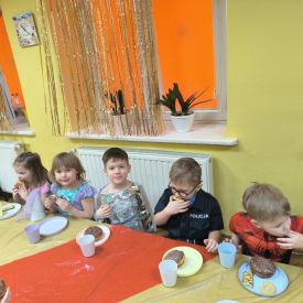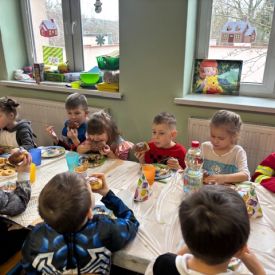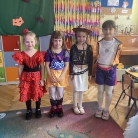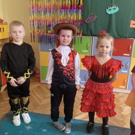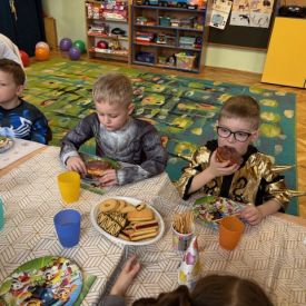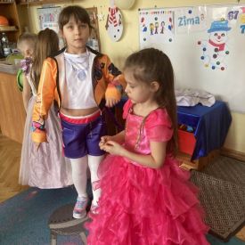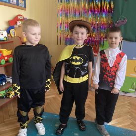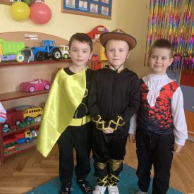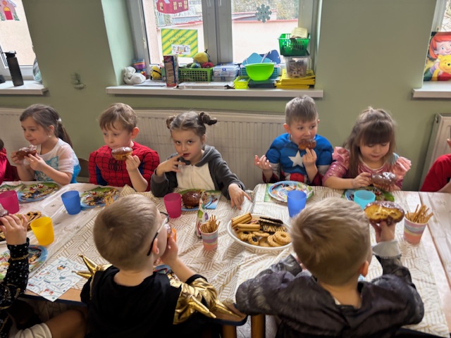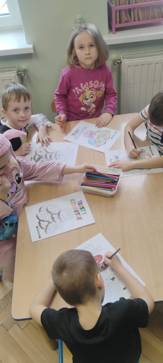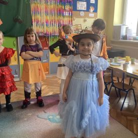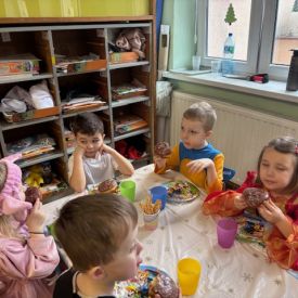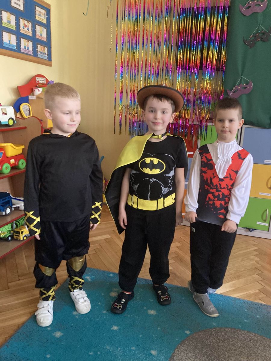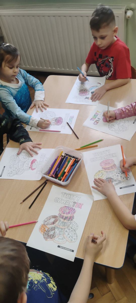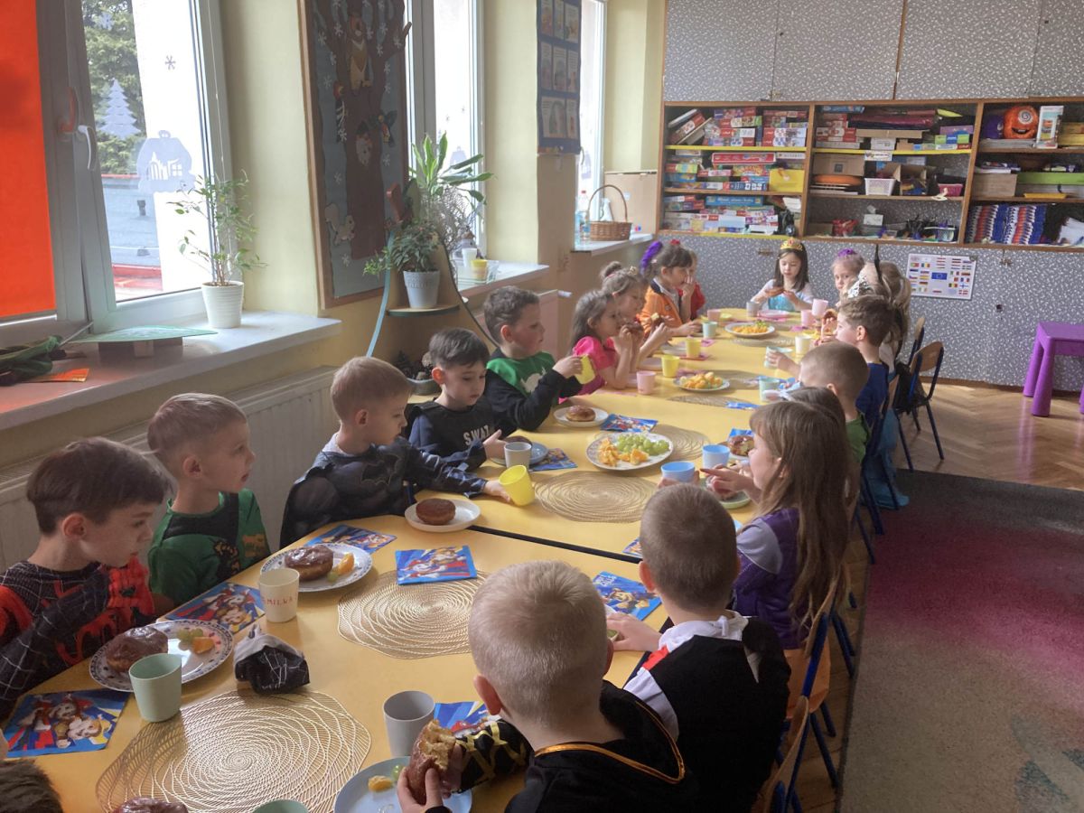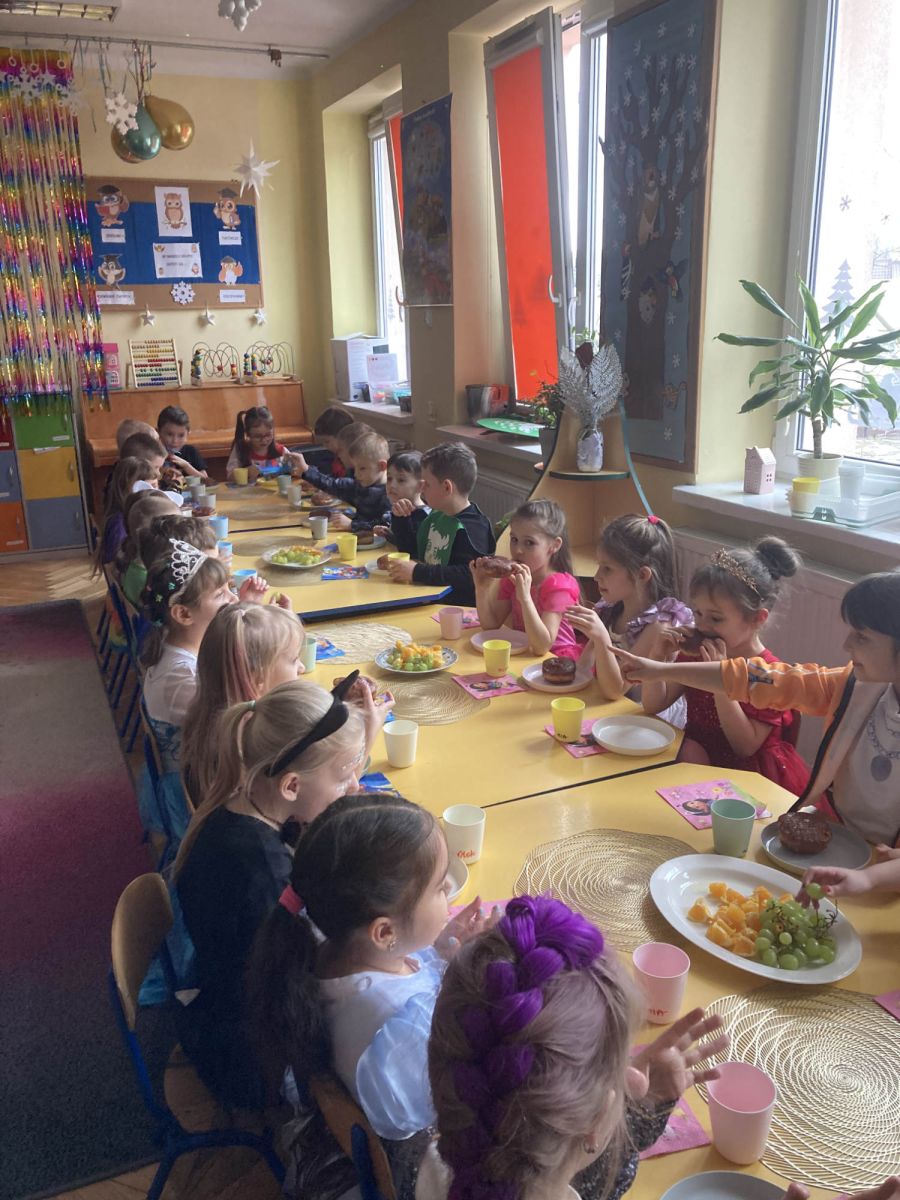 Grupa III „Ananaski” zachwyciła pomysłowością podczas zabawy pantomimicznej „Najpiękniejszy strój”. Dzieci poprzez ruch i gest prezentowały swoje kostiumy, rozwijając wyobraźnię i odwagę sceniczną. Nie zabrakło także zabaw integracyjnych – „tańca na gazetach”, limbo oraz radosnego podskakiwania „jak balony”. Przy dźwiękach karnawałowych hitów: „A ram sam sam”, „Jedzie pociąg”, „Mrówka tańczy sambę”, „Fredka Zgredka” czy „Solo” parkiet ani na chwilę nie pozostawał pusty. Tego dnia powstały również piękne prace plastyczne pt. „Tłusty Czwartek”, nawiązujące do słodkiej tradycji.