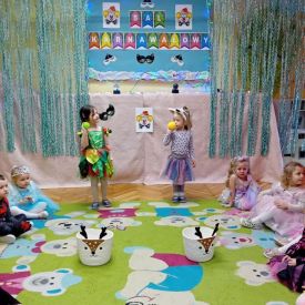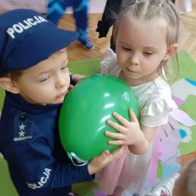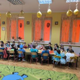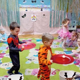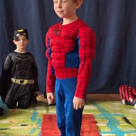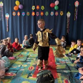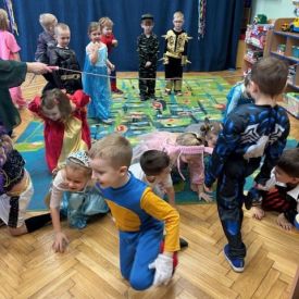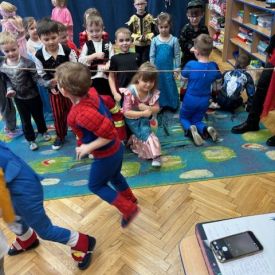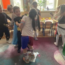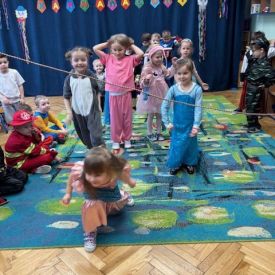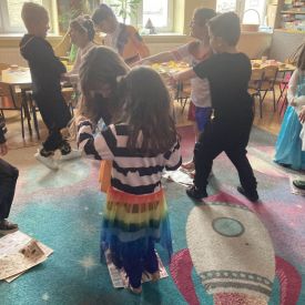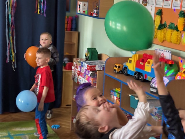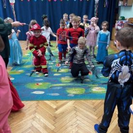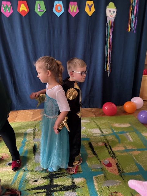 Grupa II „Motylki” uczestniczyła w radosnych zabawach muzyczno-ruchowych, które rozwijały refleks, spostrzegawczość i współpracę. W zabawie „Balonowe wyzwanie” dzieci starały się jak najdłużej utrzymać balony w powietrzu, wykazując się sprytem i zwinnością. Dużo śmiechu przyniosła zabawa „Muzyczne stop”, podczas której dzieci zamierały w bezruchu niczym bajkowe postacie. Motylki doskonale poradziły sobie także w zabawie „Znajdź swoją parę”, ucząc się współdziałania i integracji. Ich energia i spontaniczność sprawiły, że sala wypełniła się prawdziwie karnawałowym klimatem.