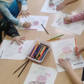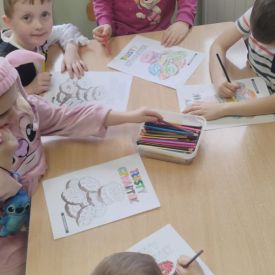 Grupa IV uczestniczyła w dynamicznych zabawach muzyczno-ruchowych oraz konkursach, które wymagały współpracy, refleksu i poczucia rytmu. Dzieci z entuzjazmem brały udział w tanecznych wyzwaniach i wspólnych układach choreograficznych do największych dziecięcych przebojów. Zwieńczeniem dnia była praca plastyczno-techniczna – własnoręcznie wykonane maski karnawałowe. Kolorowe, błyszczące i pełne fantazji stały się wyjątkową pamiątką tego radosnego święta.