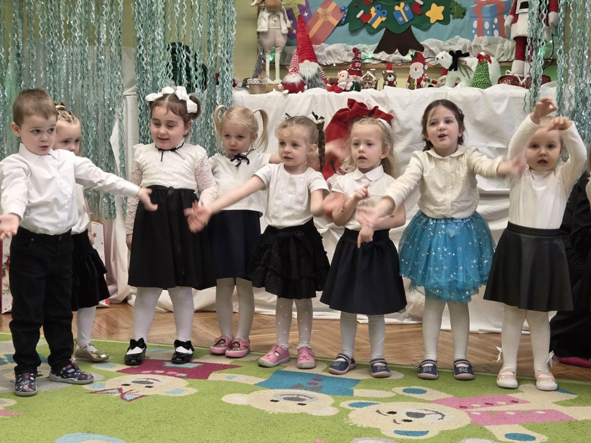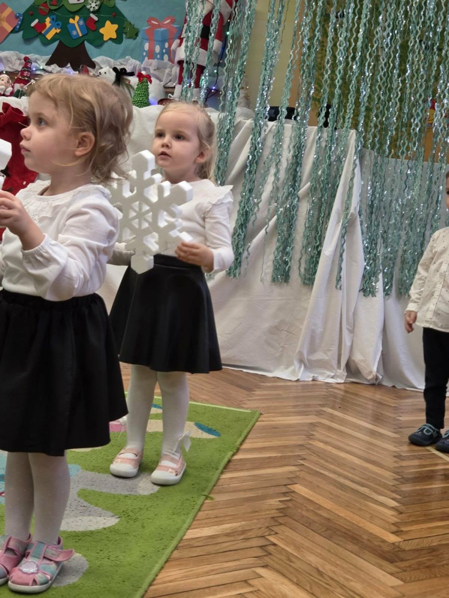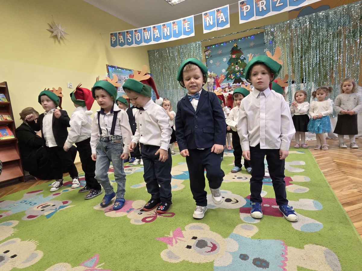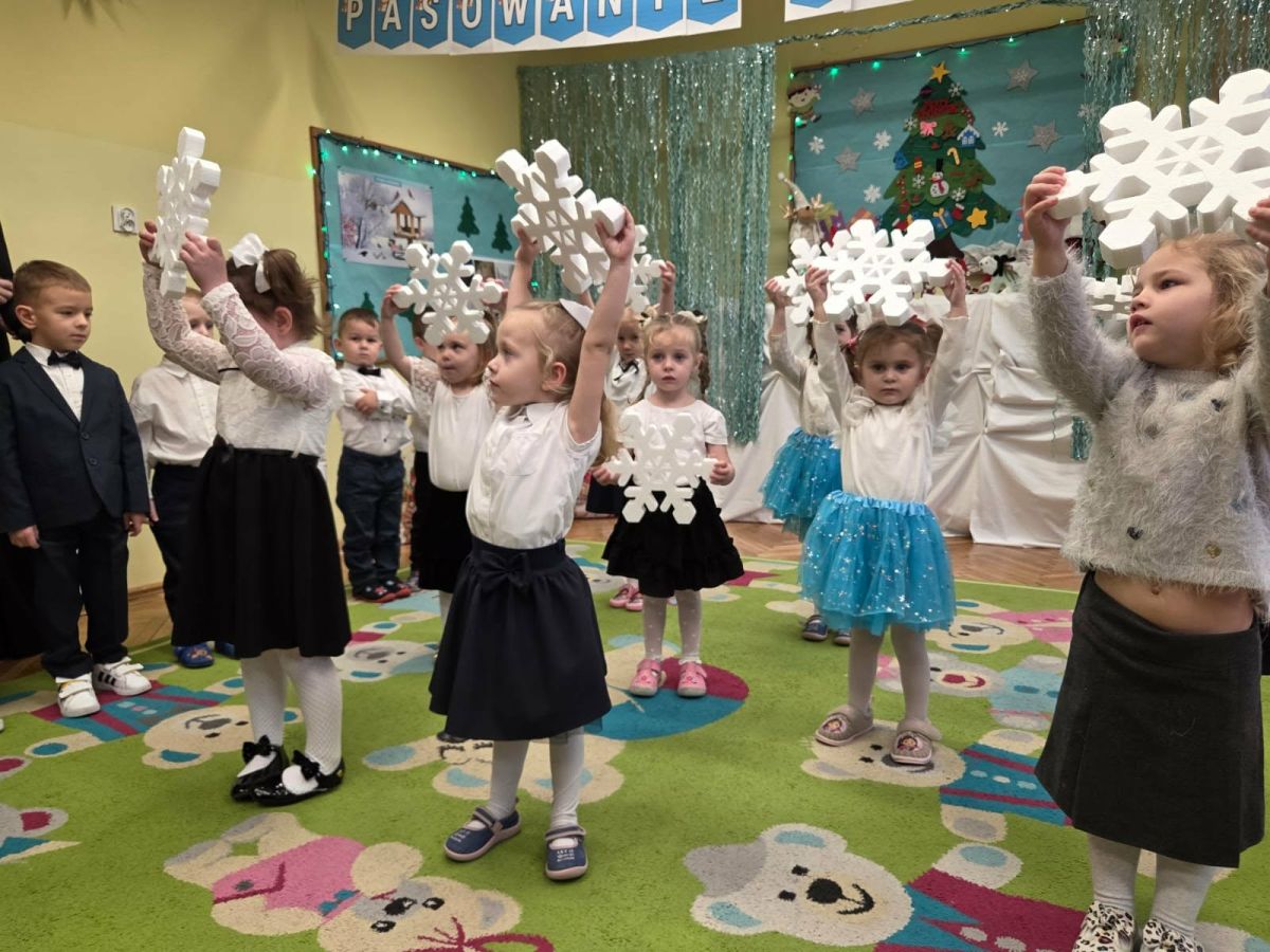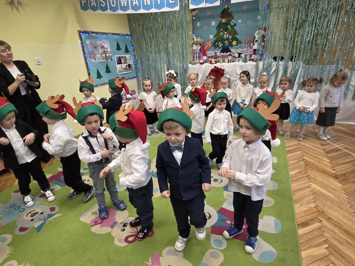 12 grudnia najmłodsza grupa przeżyła wyjątkowy i pełen wzruszeń dzień – swoje pierwsze, prawdziwie wielkie święto: uroczyste Pasowanie na Przedszkolaka. Chłopcy z energią i uśmiechem zaprezentowali „Taniec Reniferków”, a dziewczynki zamieniły się w delikatne Śnieżynki, które swoim tańcem wprowadziły wszystkich w zimowy, magiczny nastrój. Podczas występu zabrzmiały piosenki towarzyszące dzieciom od początku roku – od radosnego powitania „Nasza grupa”, przez „Jadą misie”, „Dobre wychowanie”, skoczne „Do góry i na dół”, patriotyczny „Polak mały”, aż po świąteczny utwór „Mikołaj”.