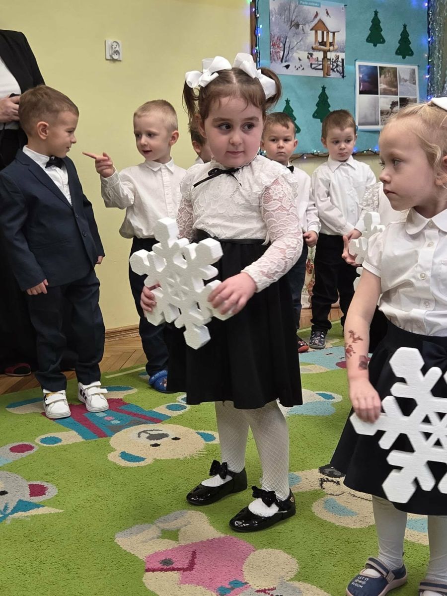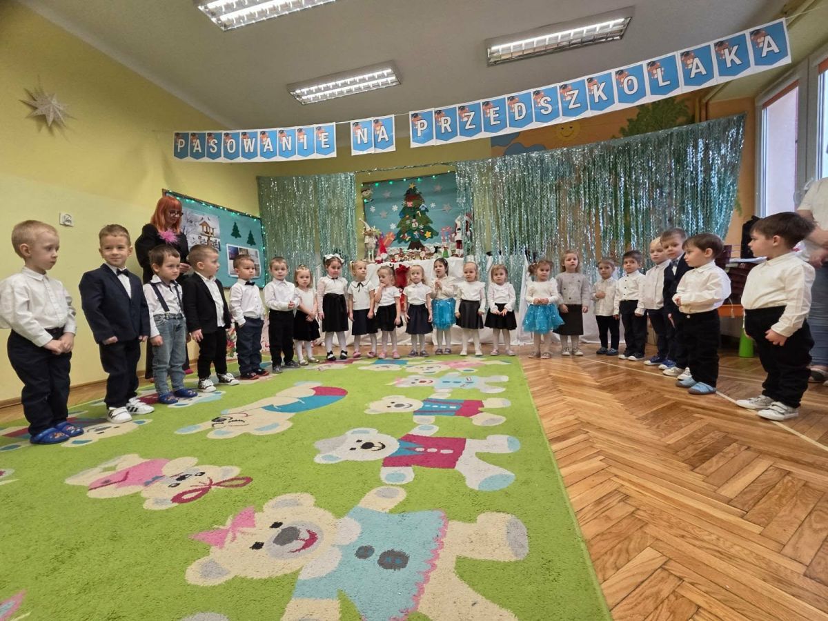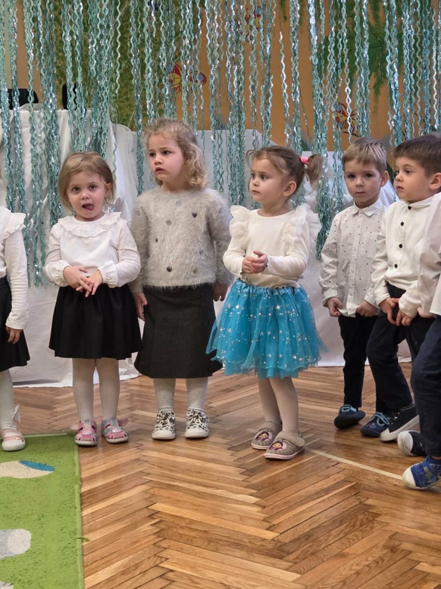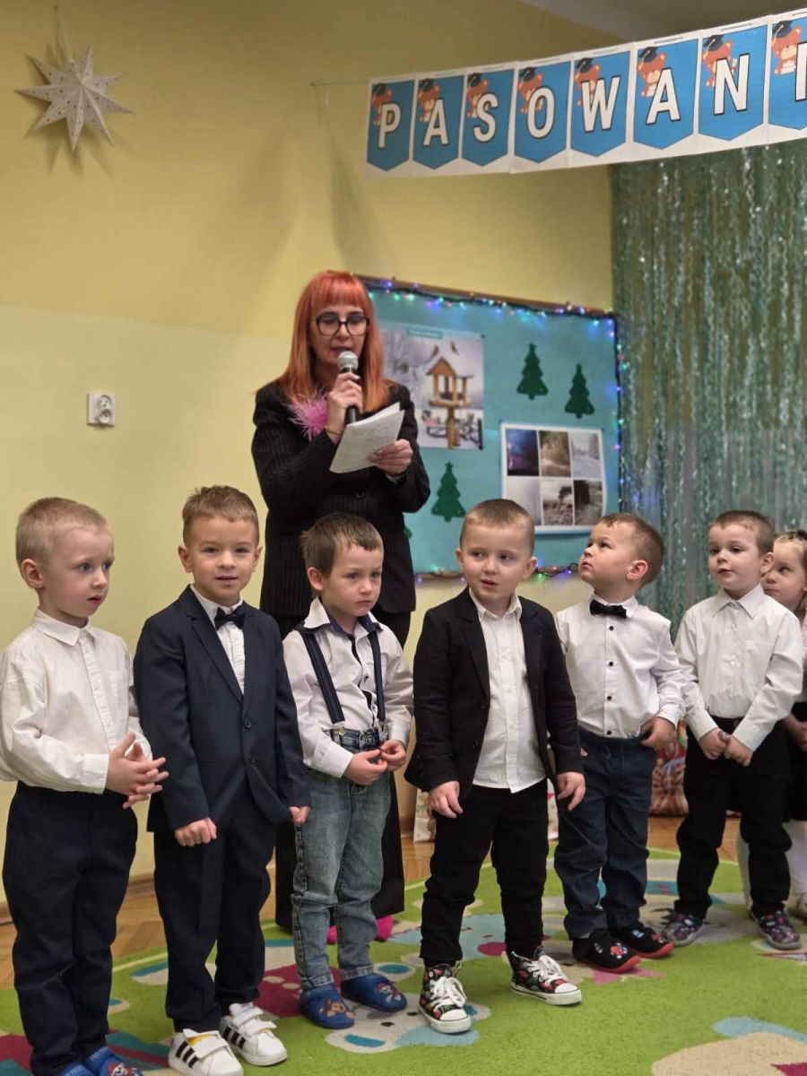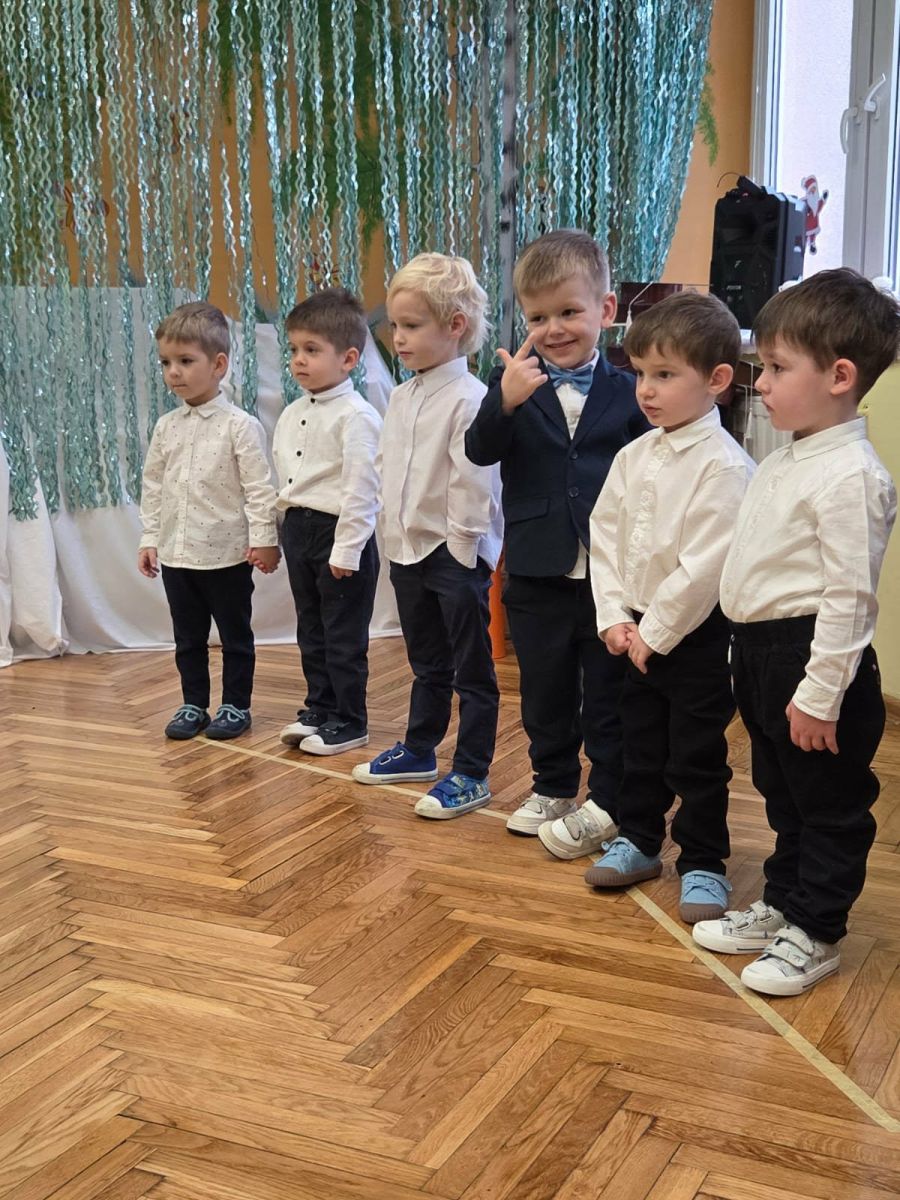 12 grudnia najmłodsza grupa przeżyła wyjątkowy i pełen wzruszeń dzień – swoje pierwsze, prawdziwie wielkie święto: uroczyste Pasowanie na Przedszkolaka. Chłopcy z energią i uśmiechem zaprezentowali „Taniec Reniferków”, a dziewczynki zamieniły się w delikatne Śnieżynki, które swoim tańcem wprowadziły wszystkich w zimowy, magiczny nastrój. Podczas występu zabrzmiały piosenki towarzyszące dzieciom od początku roku – od radosnego powitania „Nasza grupa”, przez „Jadą misie”, „Dobre wychowanie”, skoczne „Do góry i na dół”, patriotyczny „Polak mały”, aż po świąteczny utwór „Mikołaj”.