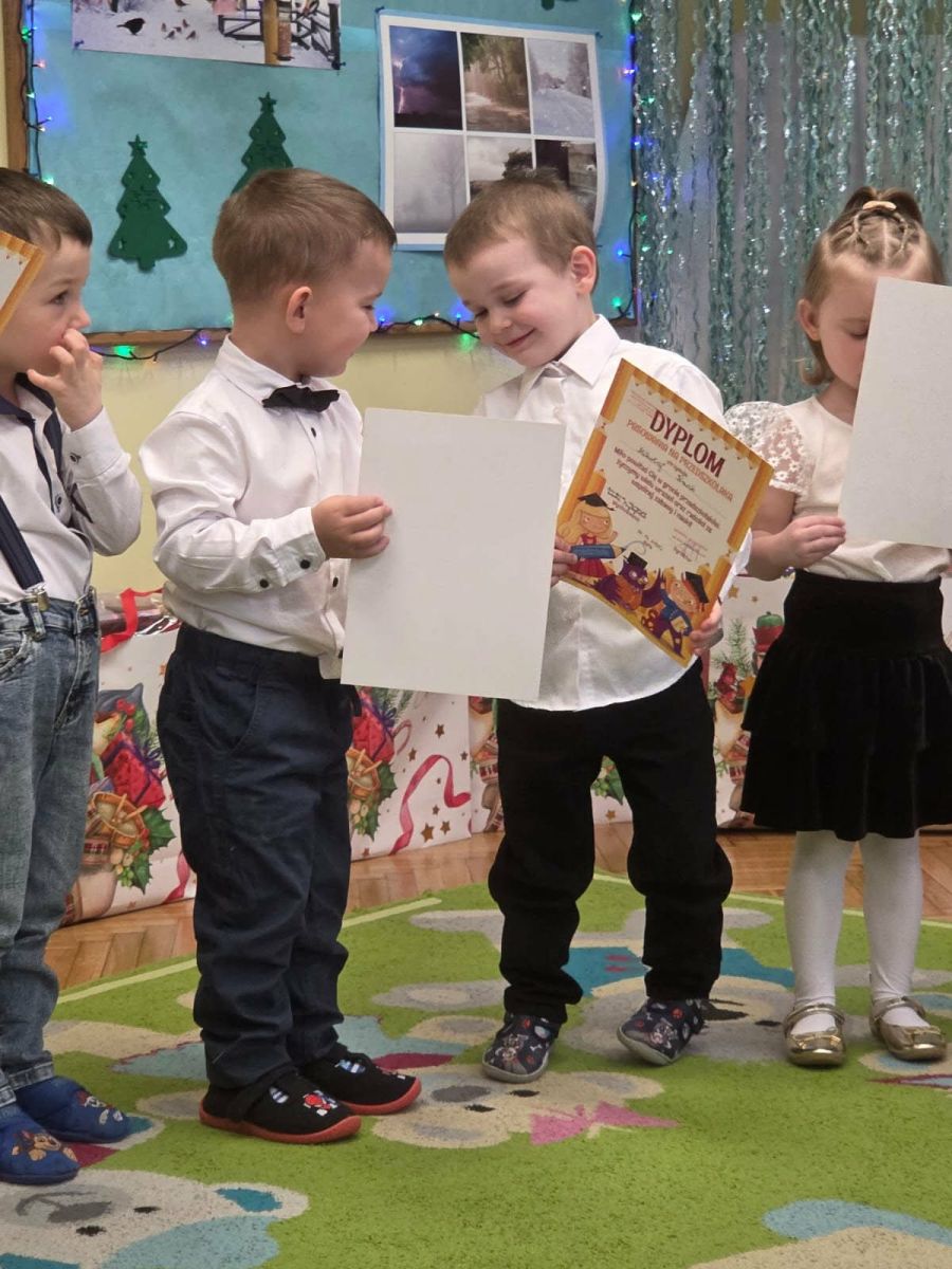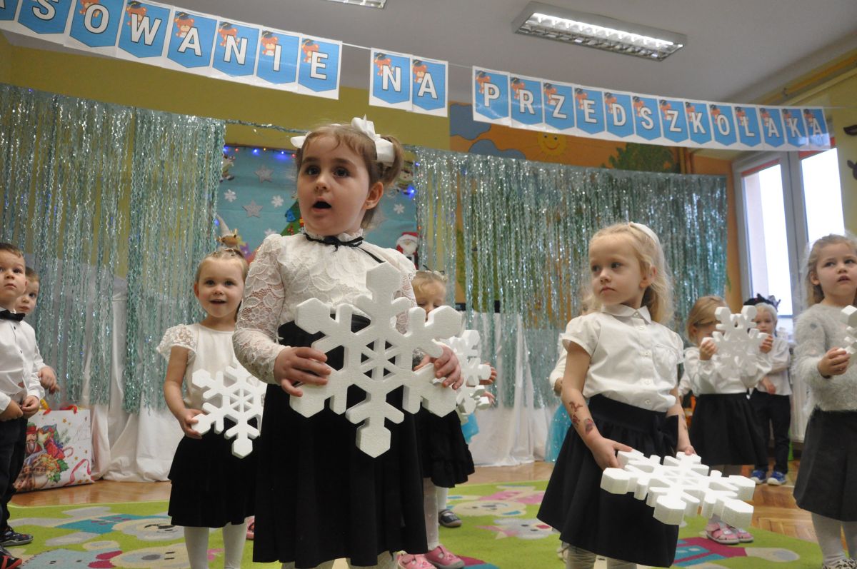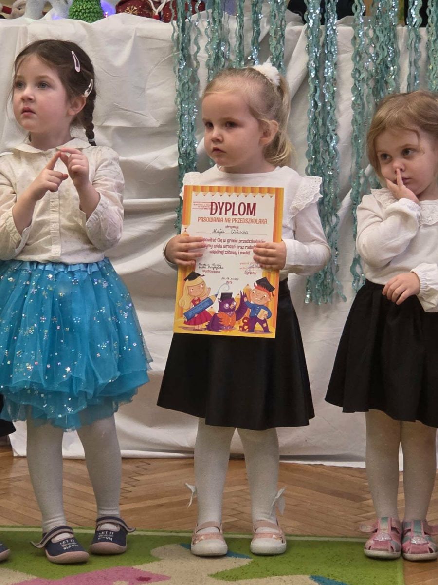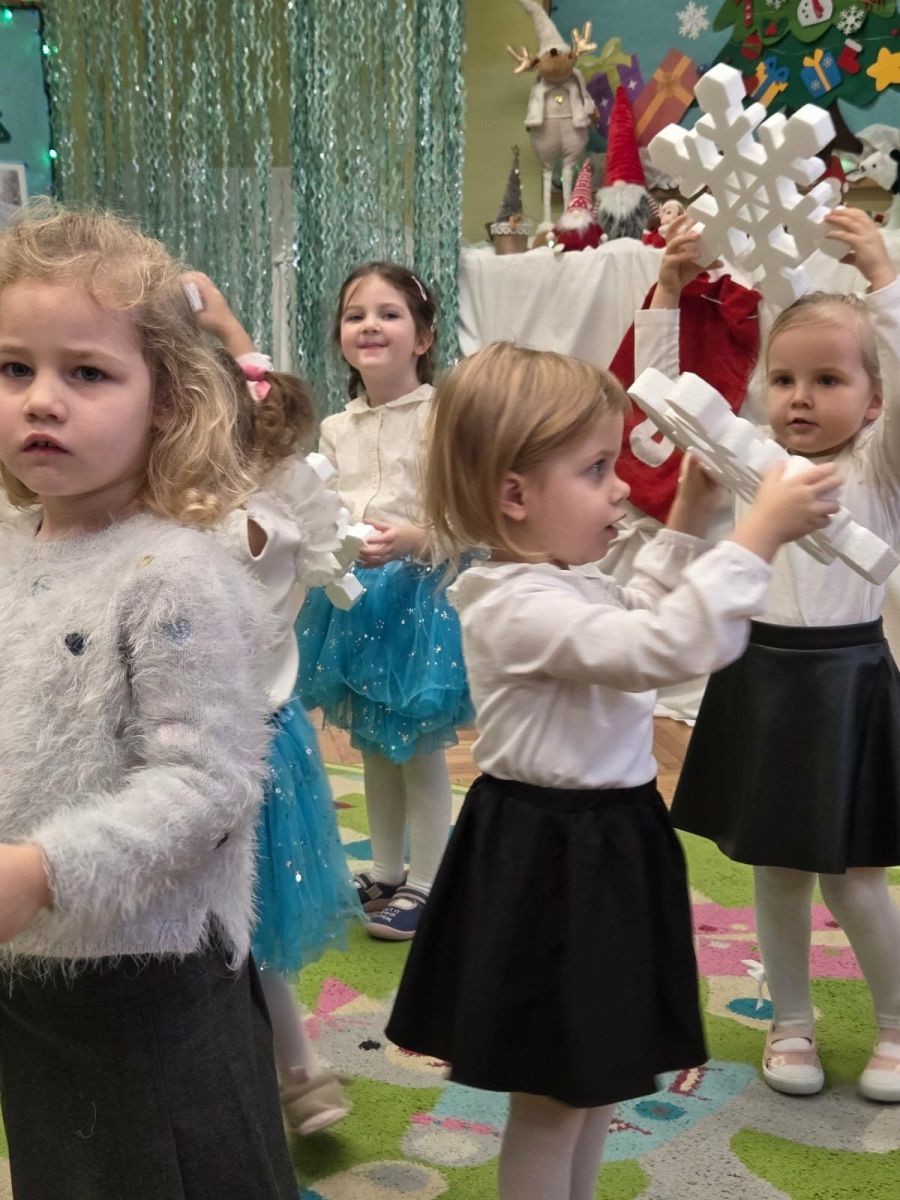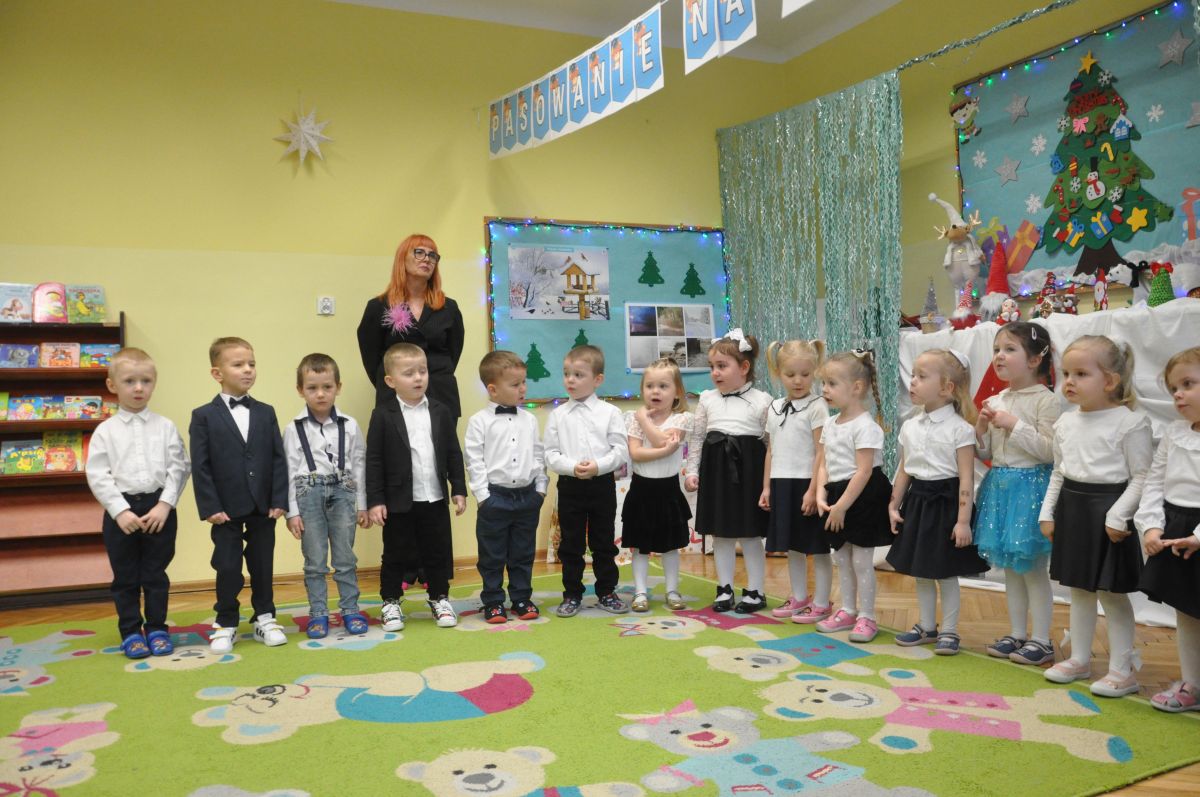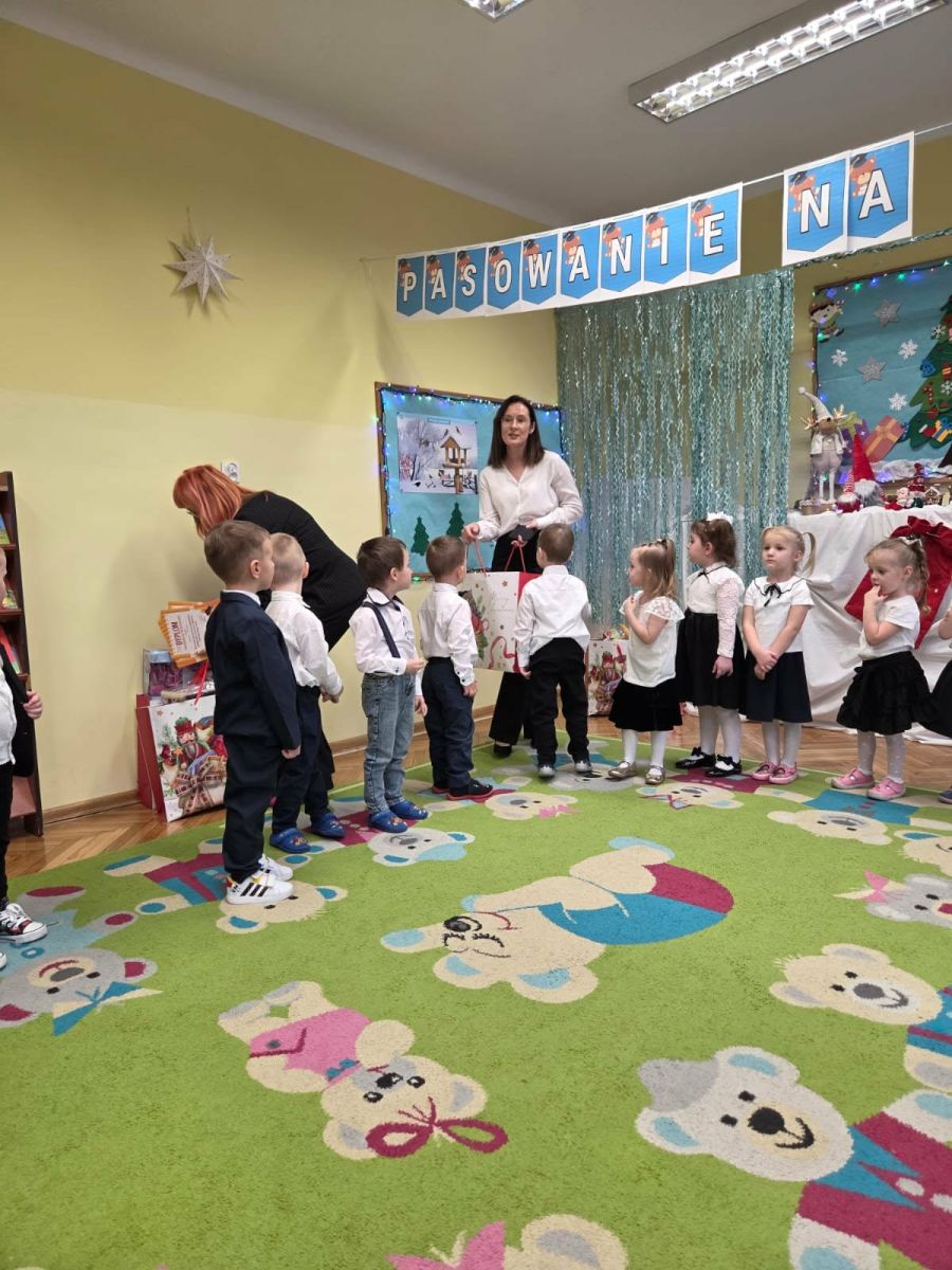12 grudnia najmłodsza grupa przeżyła wyjątkowy i pełen wzruszeń dzień – swoje pierwsze, prawdziwie wielkie święto: uroczyste Pasowanie na Przedszkolaka. Chłopcy z energią i uśmiechem zaprezentowali „Taniec Reniferków”, a dziewczynki zamieniły się w delikatne Śnieżynki, które swoim tańcem wprowadziły wszystkich w zimowy, magiczny nastrój. Podczas występu zabrzmiały piosenki towarzyszące dzieciom od początku roku – od radosnego powitania „Nasza grupa”, przez „Jadą misie”, „Dobre wychowanie”, skoczne „Do góry i na dół”, patriotyczny „Polak mały”, aż po świąteczny utwór „Mikołaj”.
