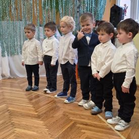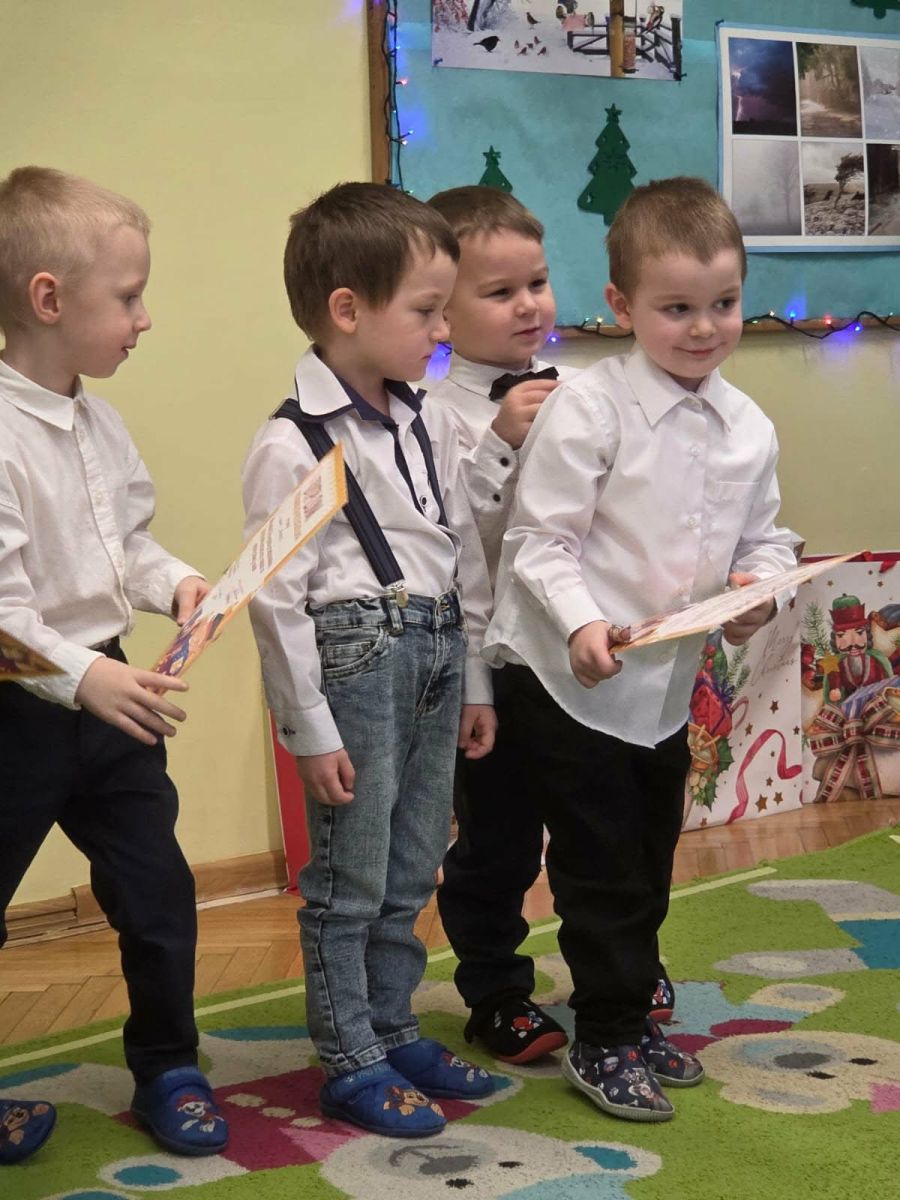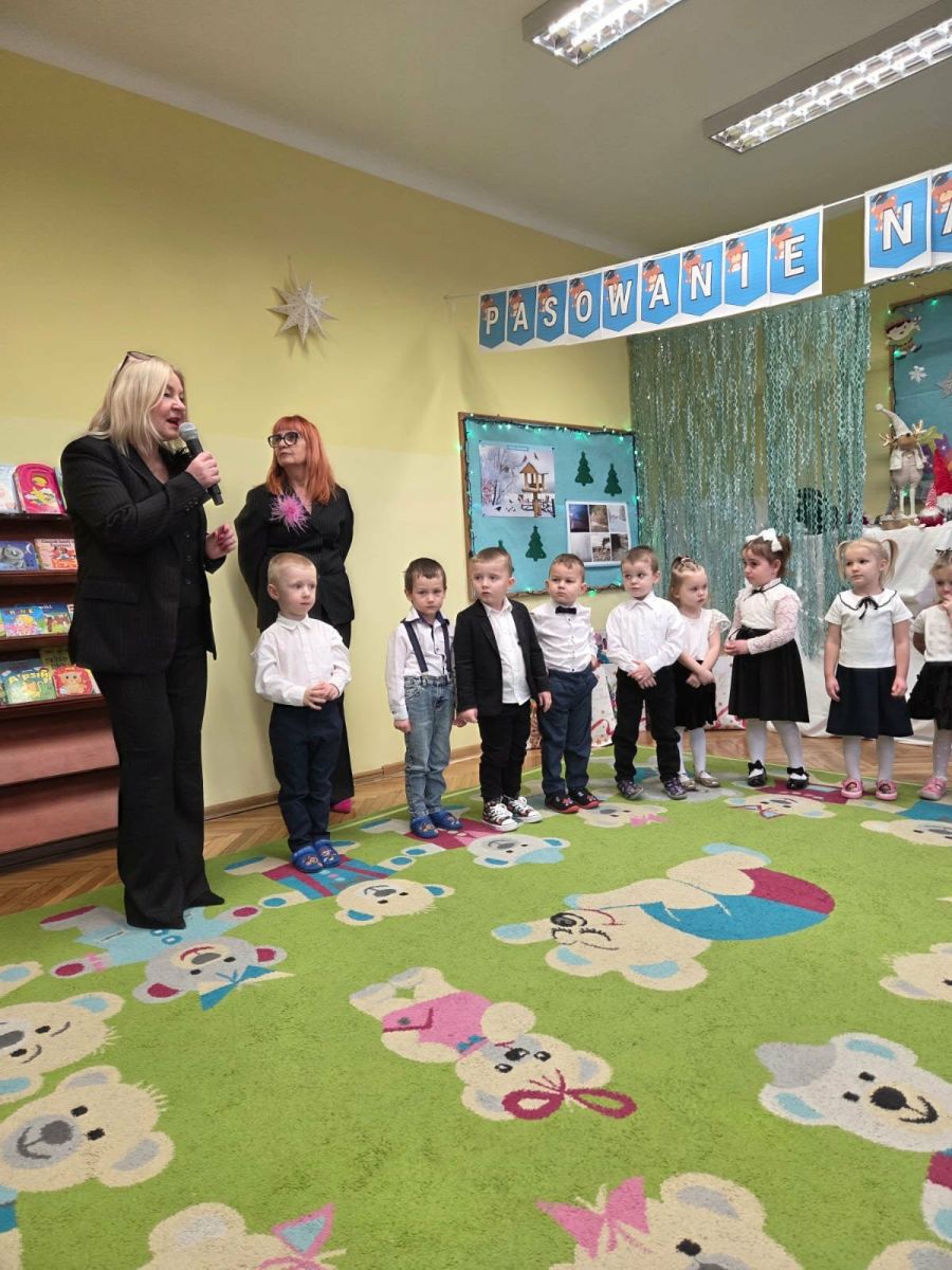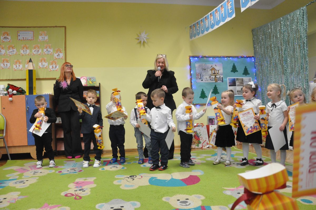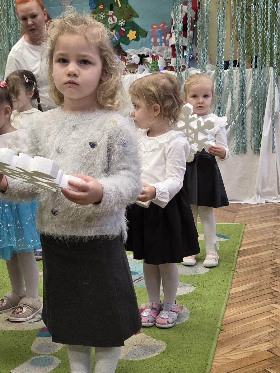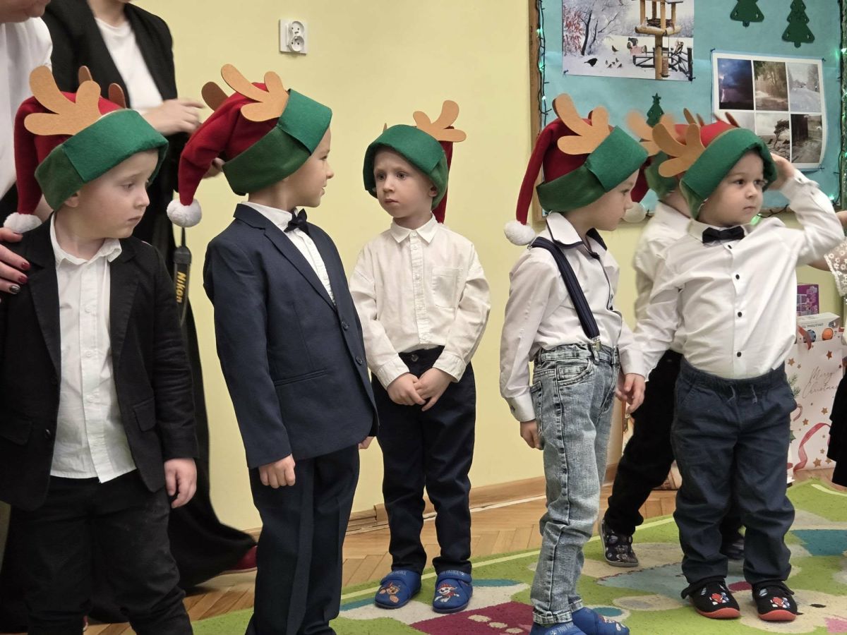 12 grudnia najmłodsza grupa przeżyła wyjątkowy i pełen wzruszeń dzień – swoje pierwsze, prawdziwie wielkie święto: uroczyste Pasowanie na Przedszkolaka. Chłopcy z energią i uśmiechem zaprezentowali „Taniec Reniferków”, a dziewczynki zamieniły się w delikatne Śnieżynki, które swoim tańcem wprowadziły wszystkich w zimowy, magiczny nastrój. Podczas występu zabrzmiały piosenki towarzyszące dzieciom od początku roku – od radosnego powitania „Nasza grupa”, przez „Jadą misie”, „Dobre wychowanie”, skoczne „Do góry i na dół”, patriotyczny „Polak mały”, aż po świąteczny utwór „Mikołaj”.