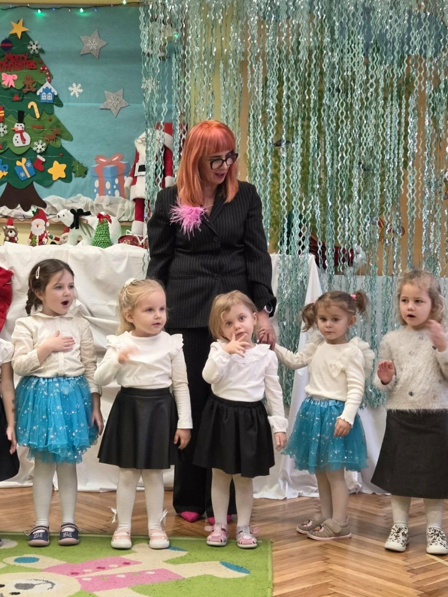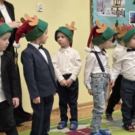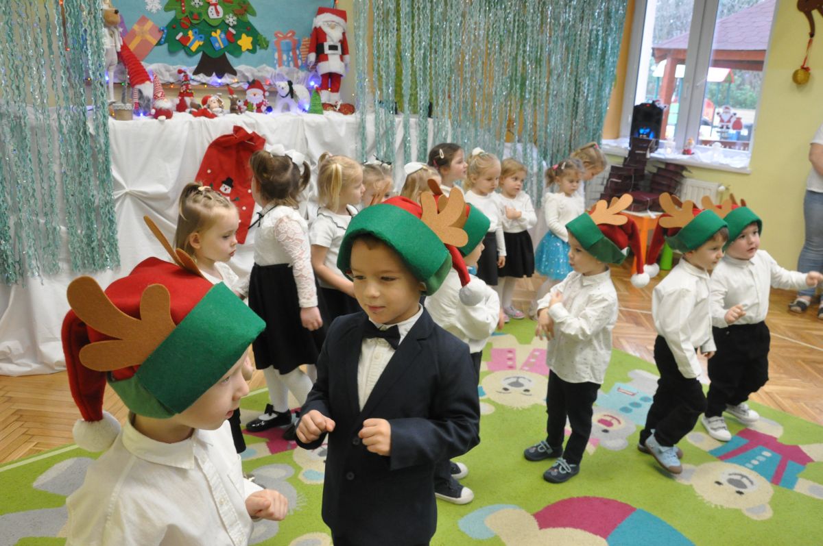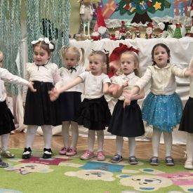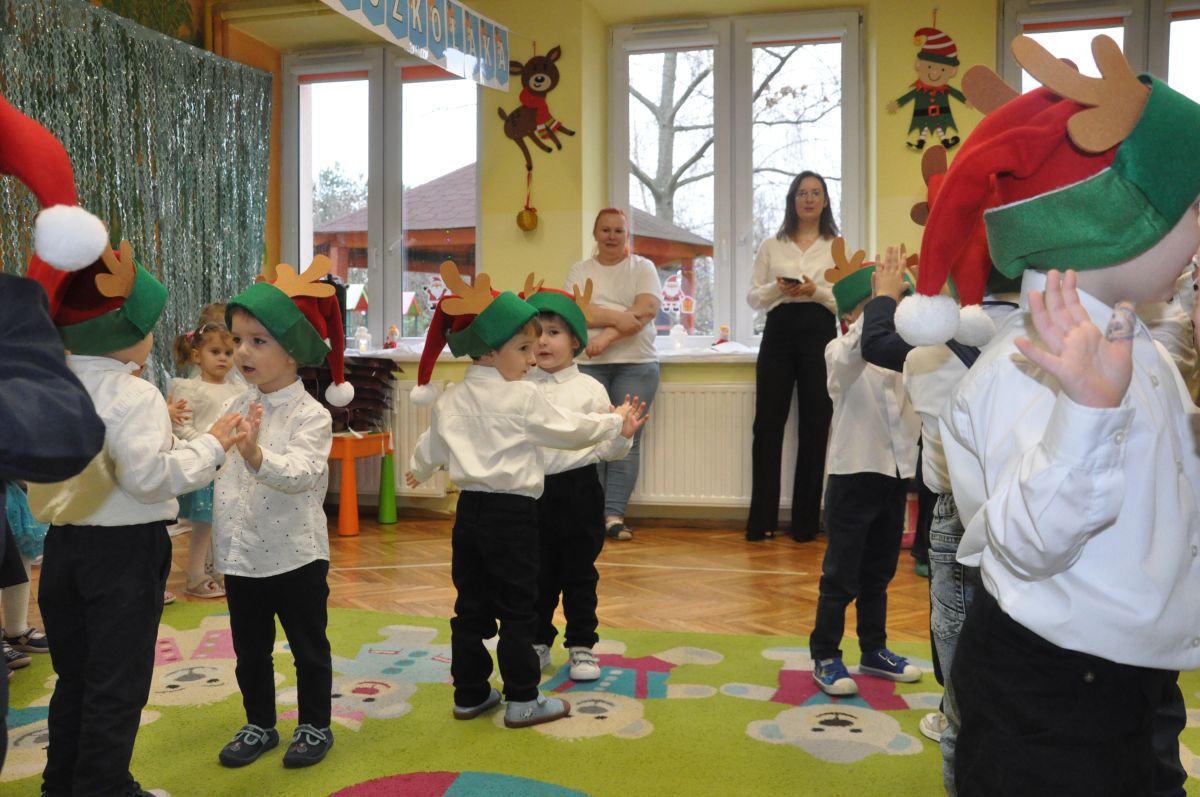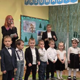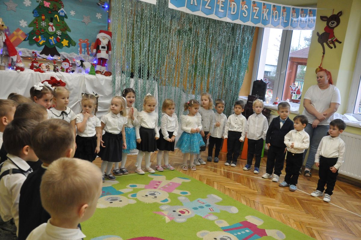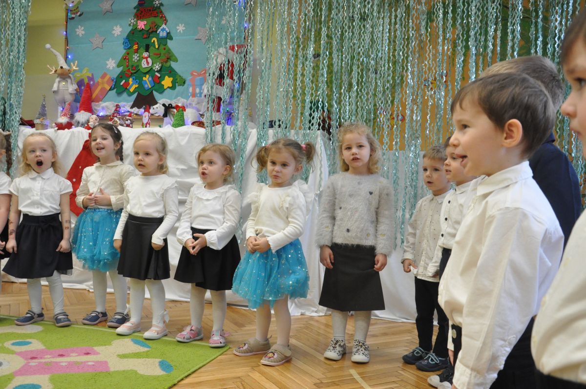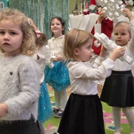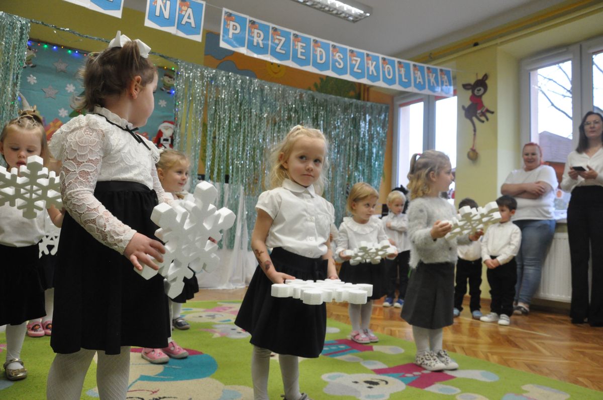 12 grudnia najmłodsza grupa przeżyła wyjątkowy i pełen wzruszeń dzień – swoje pierwsze, prawdziwie wielkie święto: uroczyste Pasowanie na Przedszkolaka. Chłopcy z energią i uśmiechem zaprezentowali „Taniec Reniferków”, a dziewczynki zamieniły się w delikatne Śnieżynki, które swoim tańcem wprowadziły wszystkich w zimowy, magiczny nastrój. Podczas występu zabrzmiały piosenki towarzyszące dzieciom od początku roku – od radosnego powitania „Nasza grupa”, przez „Jadą misie”, „Dobre wychowanie”, skoczne „Do góry i na dół”, patriotyczny „Polak mały”, aż po świąteczny utwór „Mikołaj”.