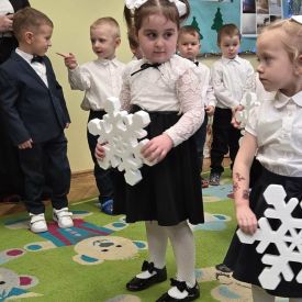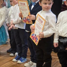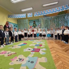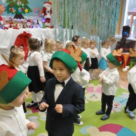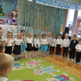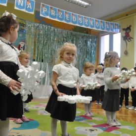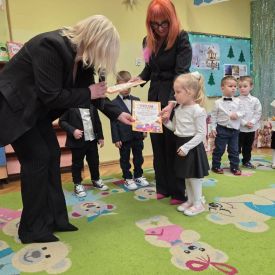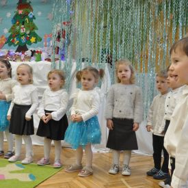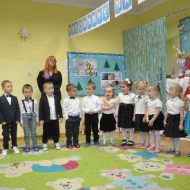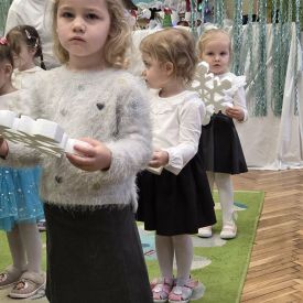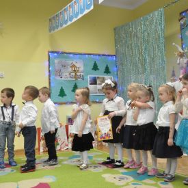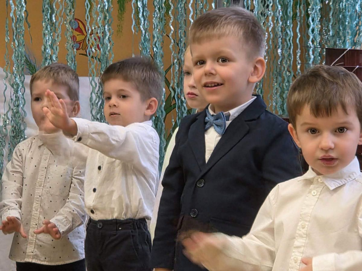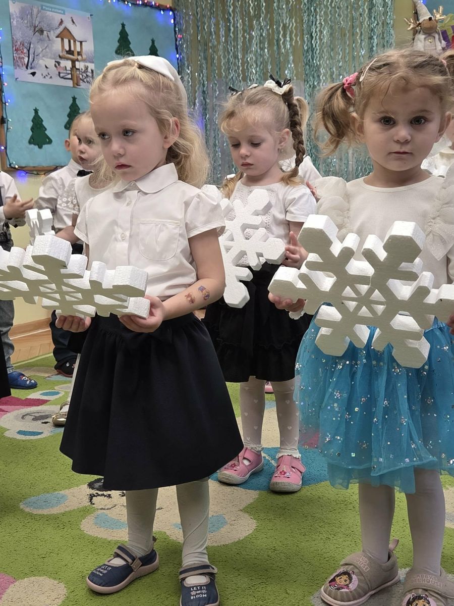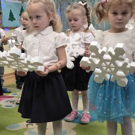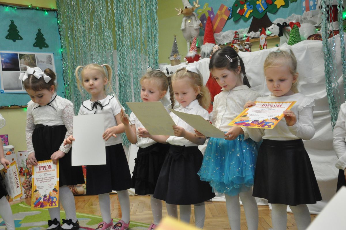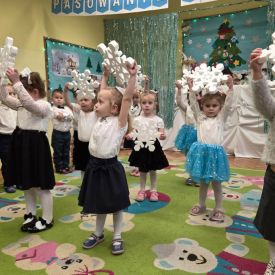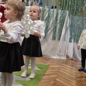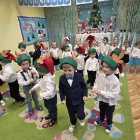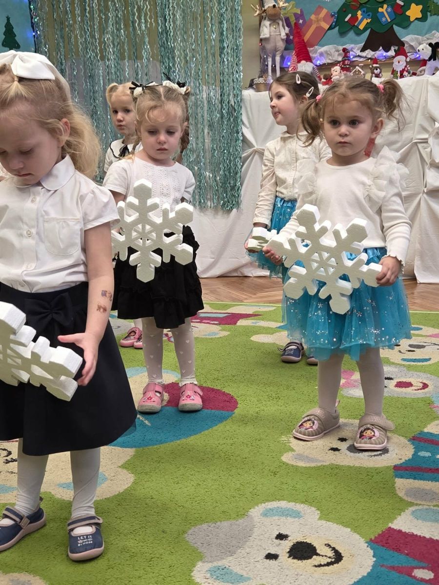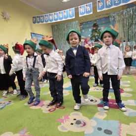 12 grudnia najmłodsza grupa przeżyła wyjątkowy i pełen wzruszeń dzień – swoje pierwsze, prawdziwie wielkie święto: uroczyste Pasowanie na Przedszkolaka. Chłopcy z energią i uśmiechem zaprezentowali „Taniec Reniferków”, a dziewczynki zamieniły się w delikatne Śnieżynki, które swoim tańcem wprowadziły wszystkich w zimowy, magiczny nastrój. Podczas występu zabrzmiały piosenki towarzyszące dzieciom od początku roku – od radosnego powitania „Nasza grupa”, przez „Jadą misie”, „Dobre wychowanie”, skoczne „Do góry i na dół”, patriotyczny „Polak mały”, aż po świąteczny utwór „Mikołaj”.