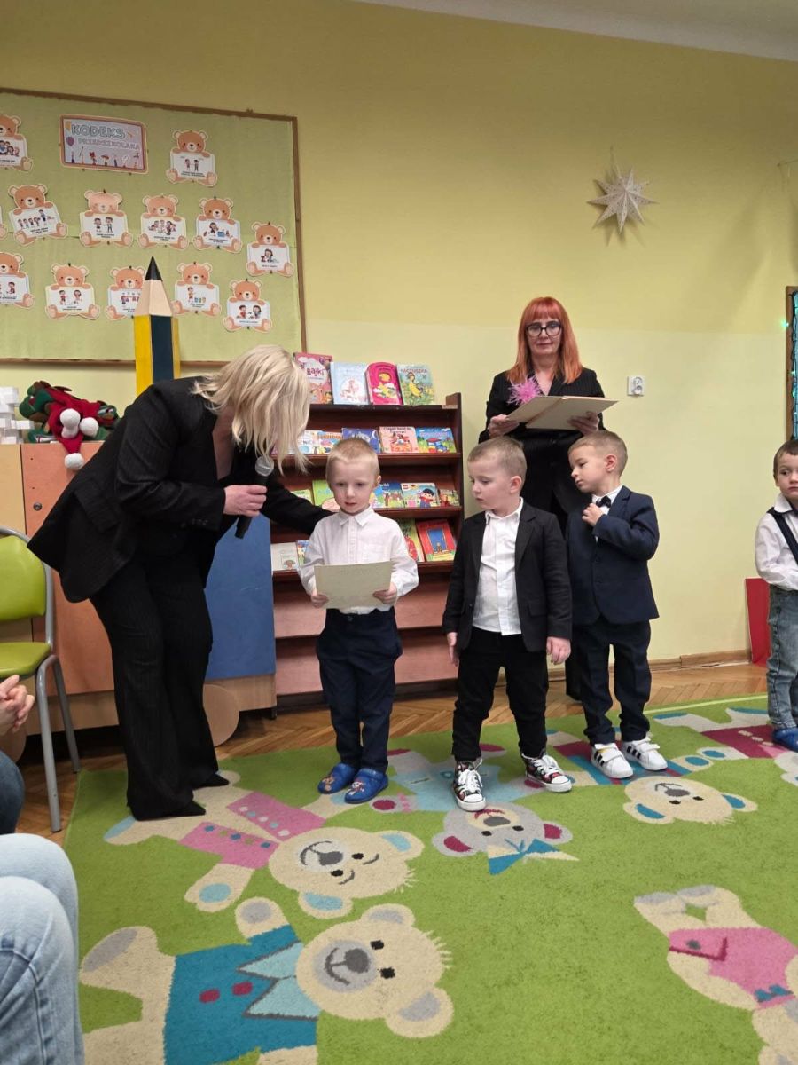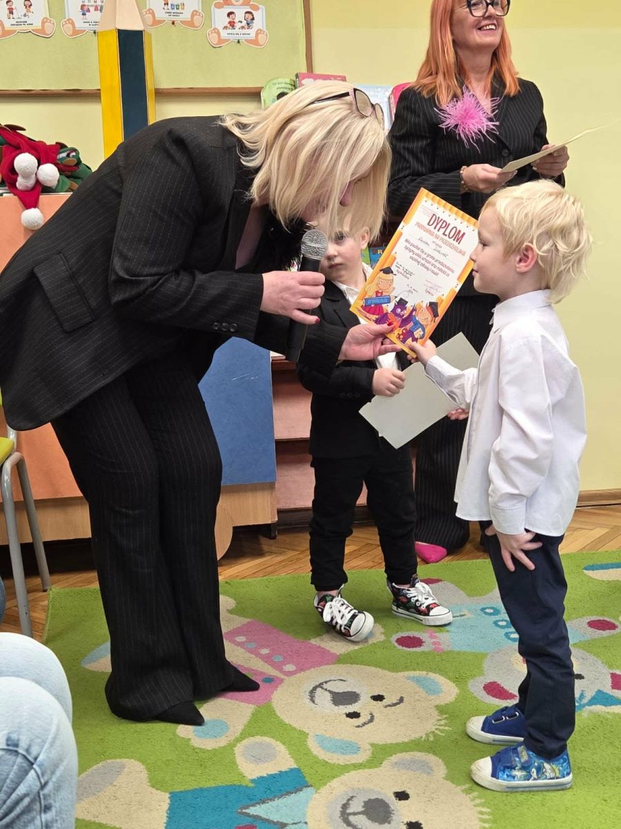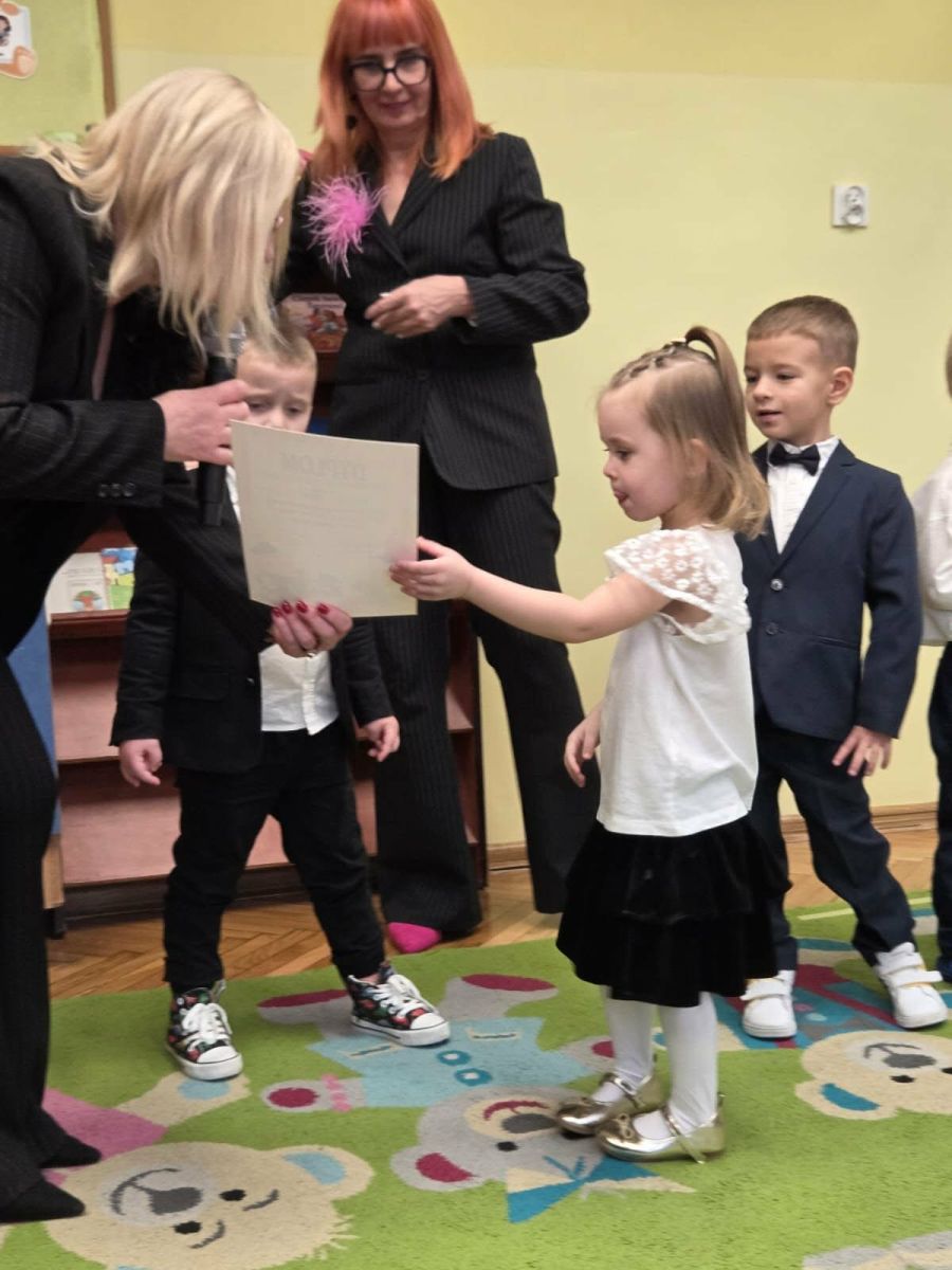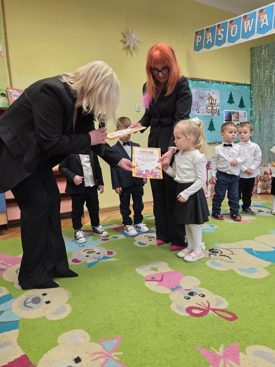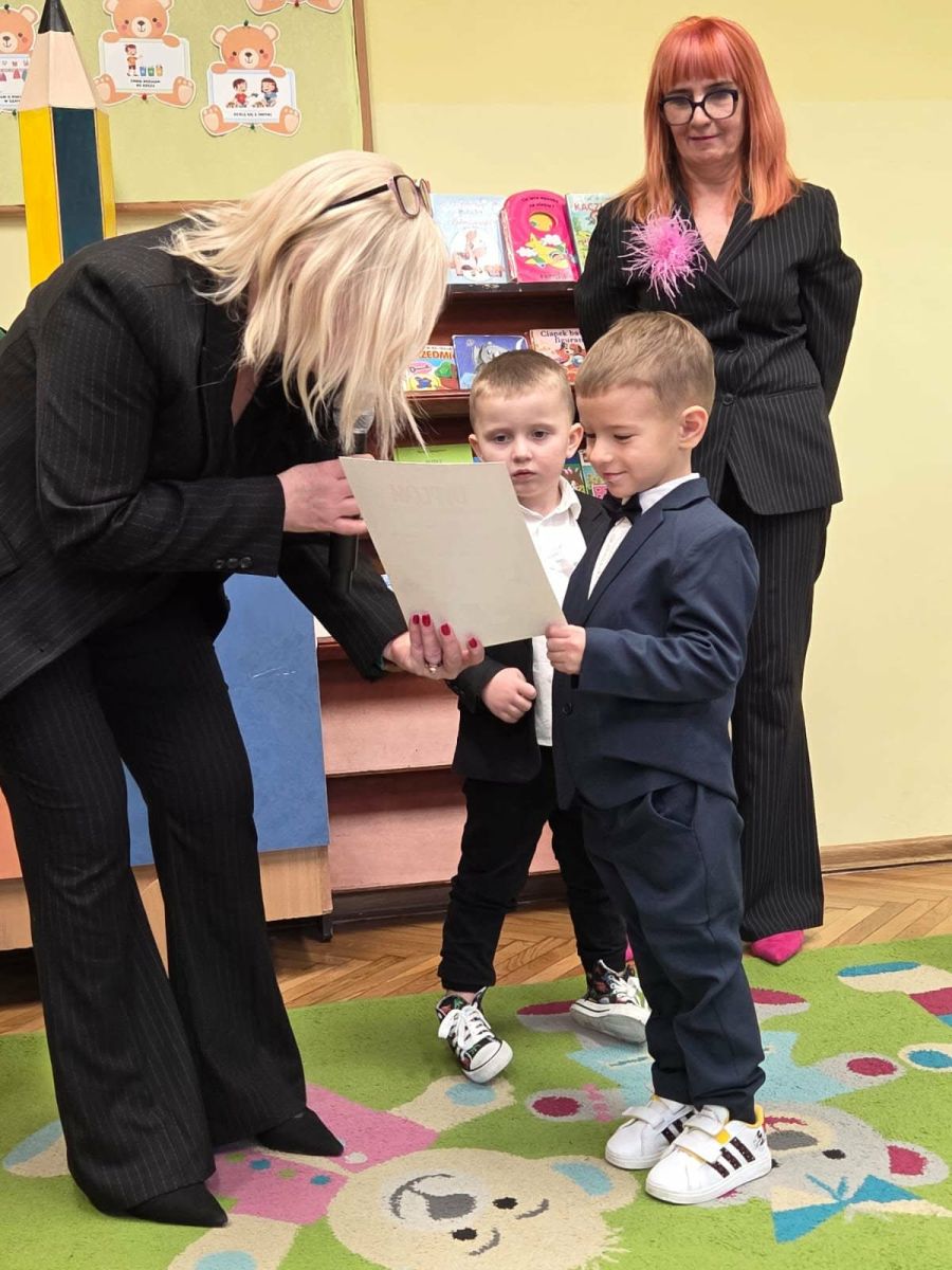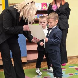 Najważniejszym momentem uroczystości było symboliczne pasowanie dokonane przez panią dyrektor – chwila, która oficjalnie wprowadziła maluchy do grona prawdziwych przedszkolaków. Po występie każdy z nich otrzymał pamiątkowy dyplom, biret oraz upominki przygotowane przez rodziców. Dodatkowo pani dyrektor podarowała dzieciom cztery torby pełne zabawek, które sprawiły przedszkolakom ogromną radość. Uśmiech i duma towarzyszyły zarówno dzieciom, jak i ich bliskim.
