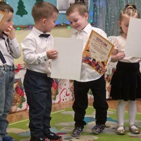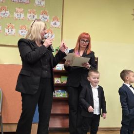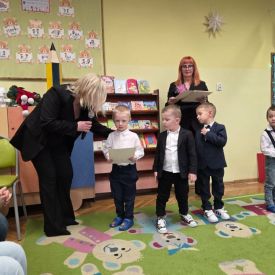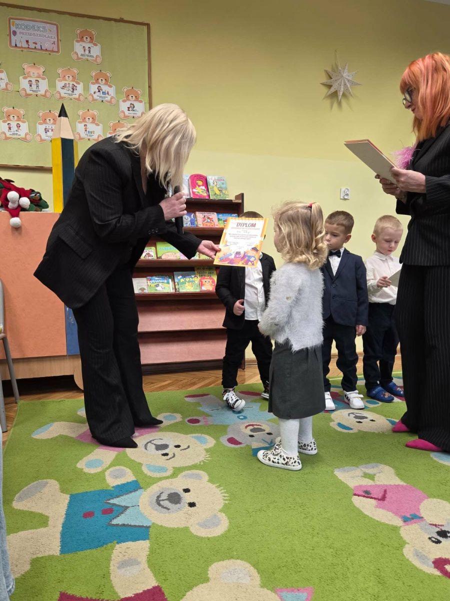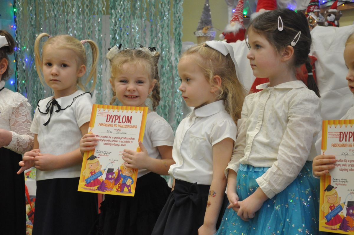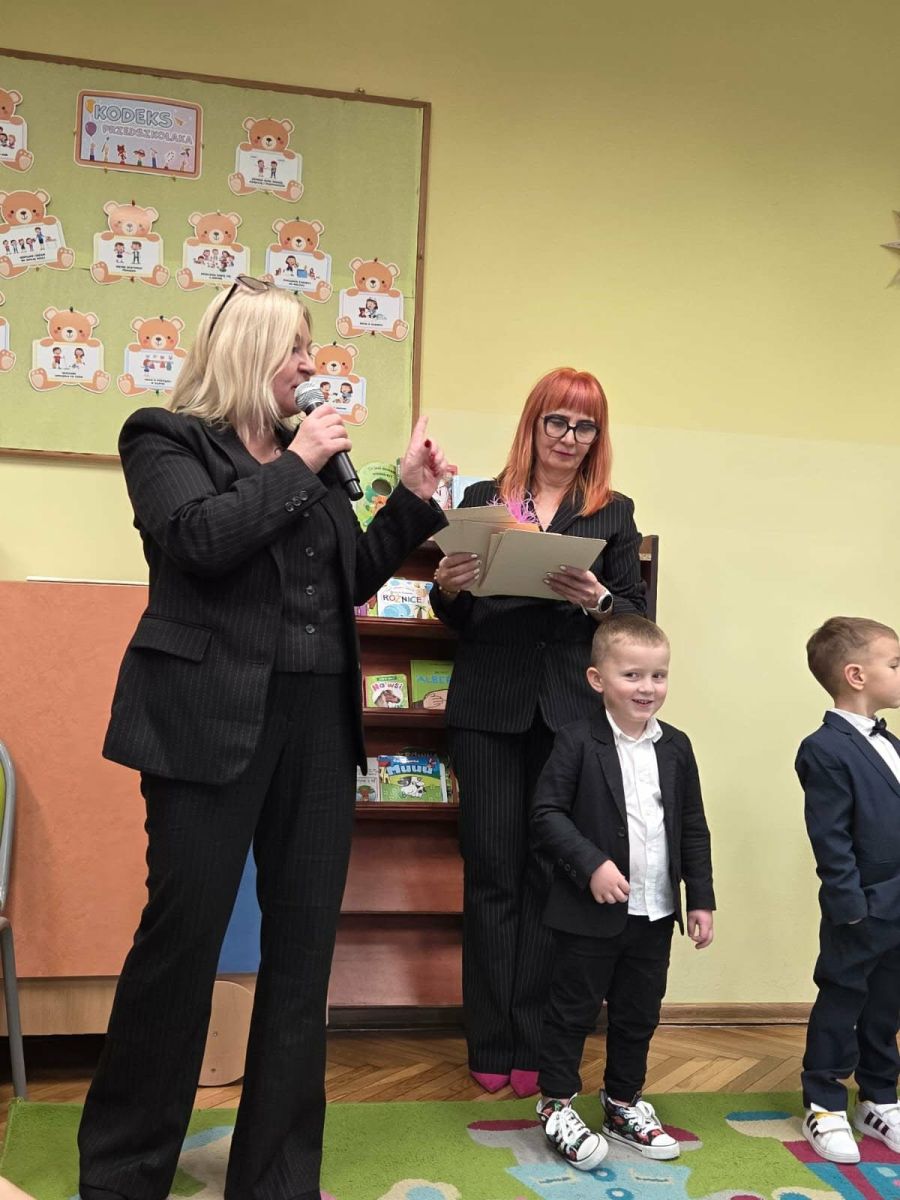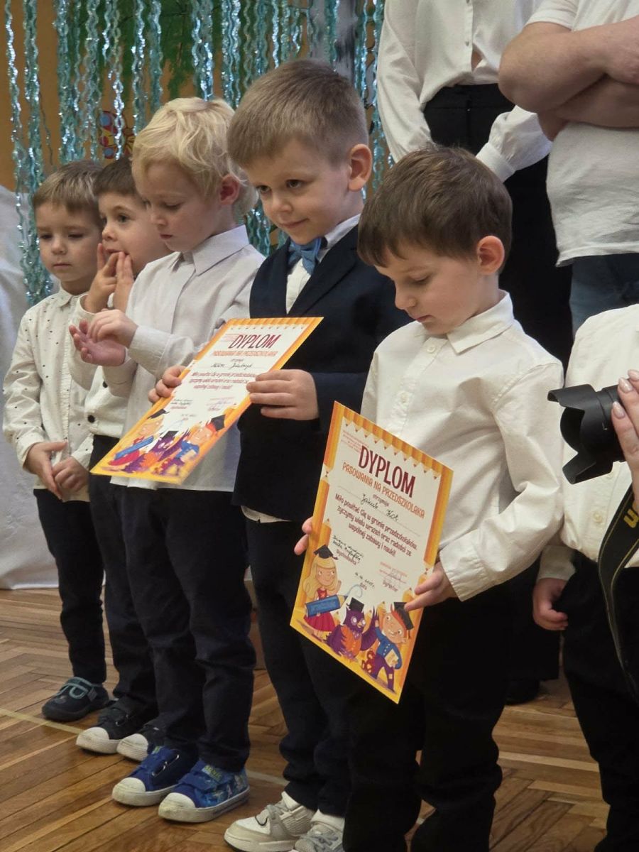 Najważniejszym momentem uroczystości było symboliczne pasowanie dokonane przez panią dyrektor – chwila, która oficjalnie wprowadziła maluchy do grona prawdziwych przedszkolaków. Po występie każdy z nich otrzymał pamiątkowy dyplom, biret oraz upominki przygotowane przez rodziców. Dodatkowo pani dyrektor podarowała dzieciom cztery torby pełne zabawek, które sprawiły przedszkolakom ogromną radość. Uśmiech i duma towarzyszyły zarówno dzieciom, jak i ich bliskim.