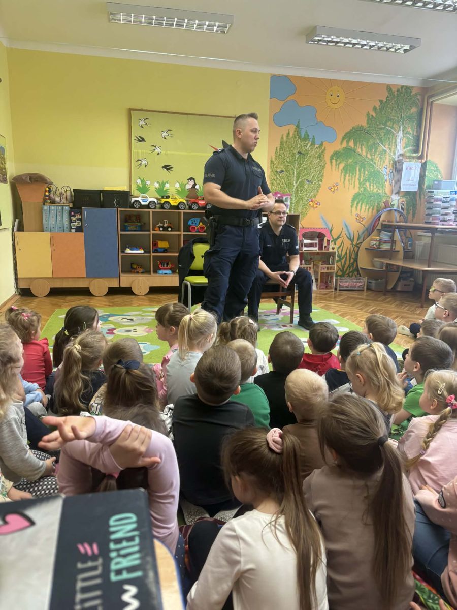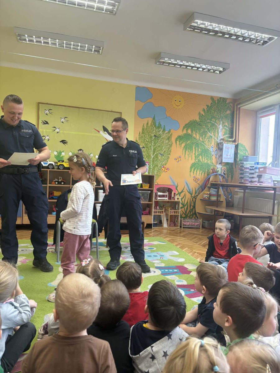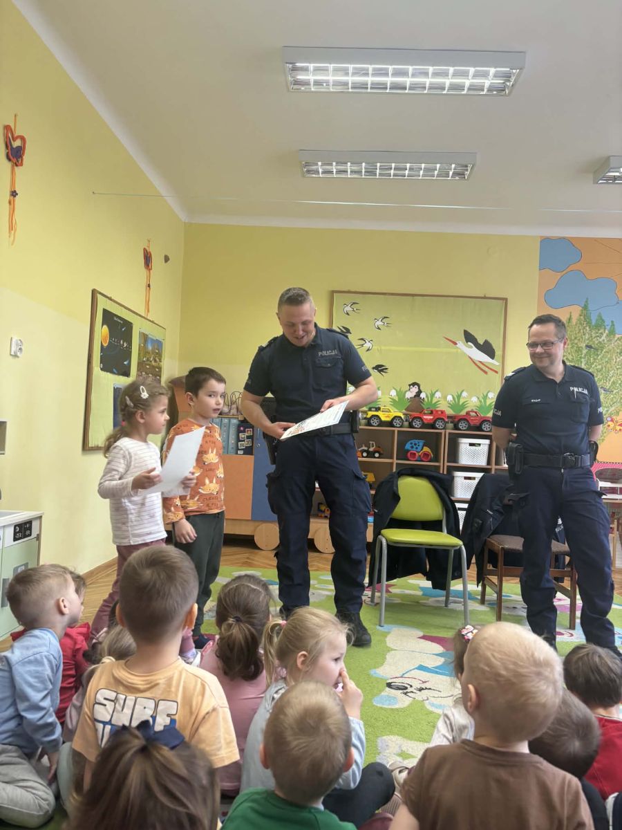 Spotkanie było cenną lekcją, podczas której dzieci poznały wzorce właściwego zachowania się na ulicy i utrwaliły zasady bezpieczeństwa. Na zakończenie, w podziękowaniu za przeprowadzenie prelekcji, przedszkolaki wręczyły policjantom przygotowane dyplomy, wyrażając wdzięczność za poświęcony czas i przekazaną wiedzę.