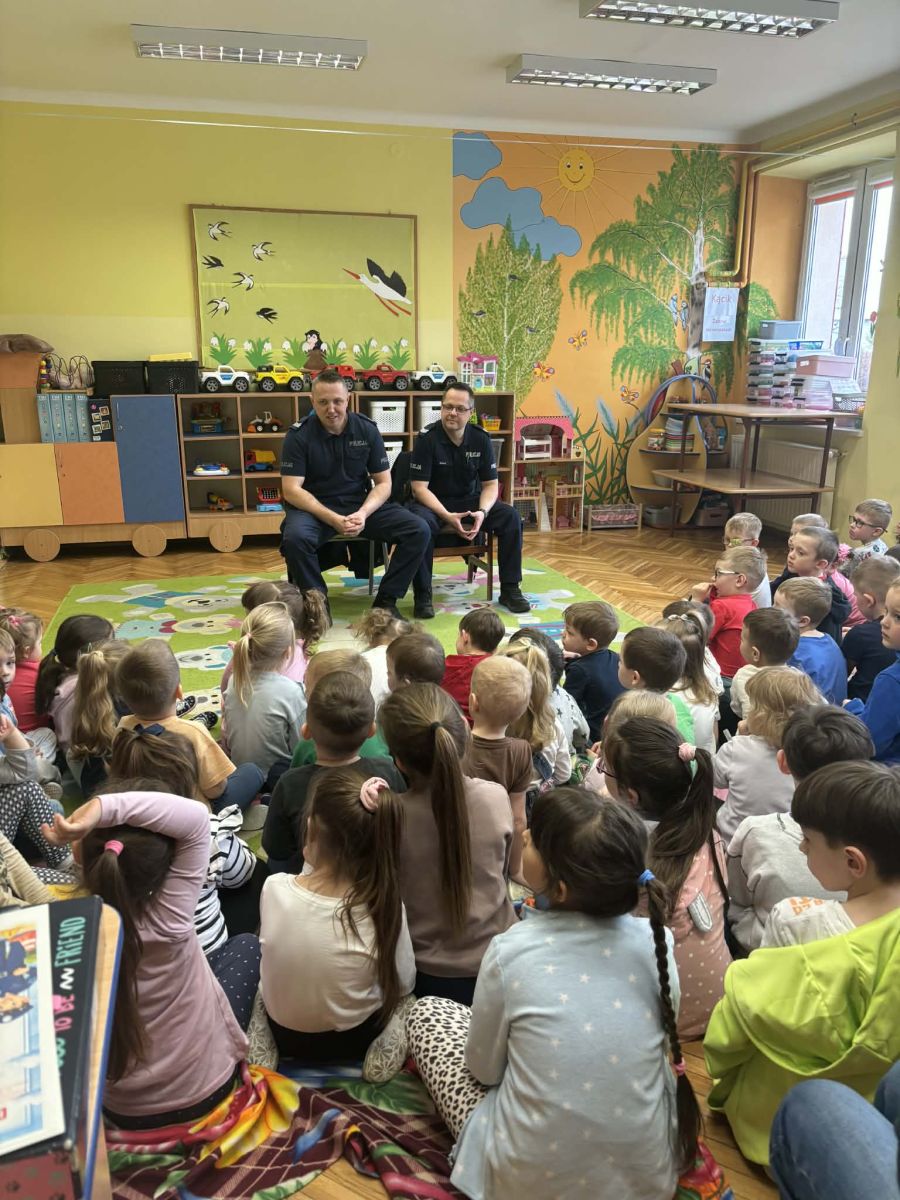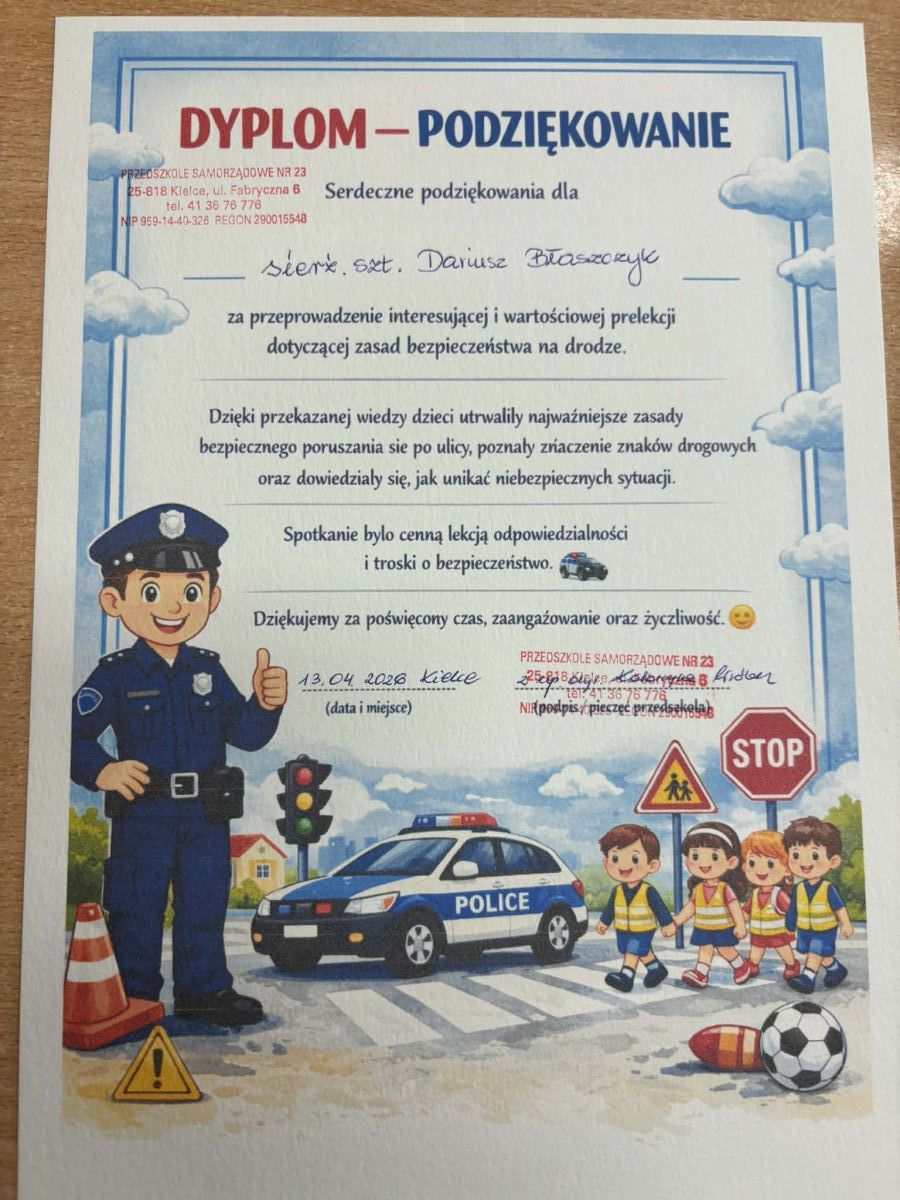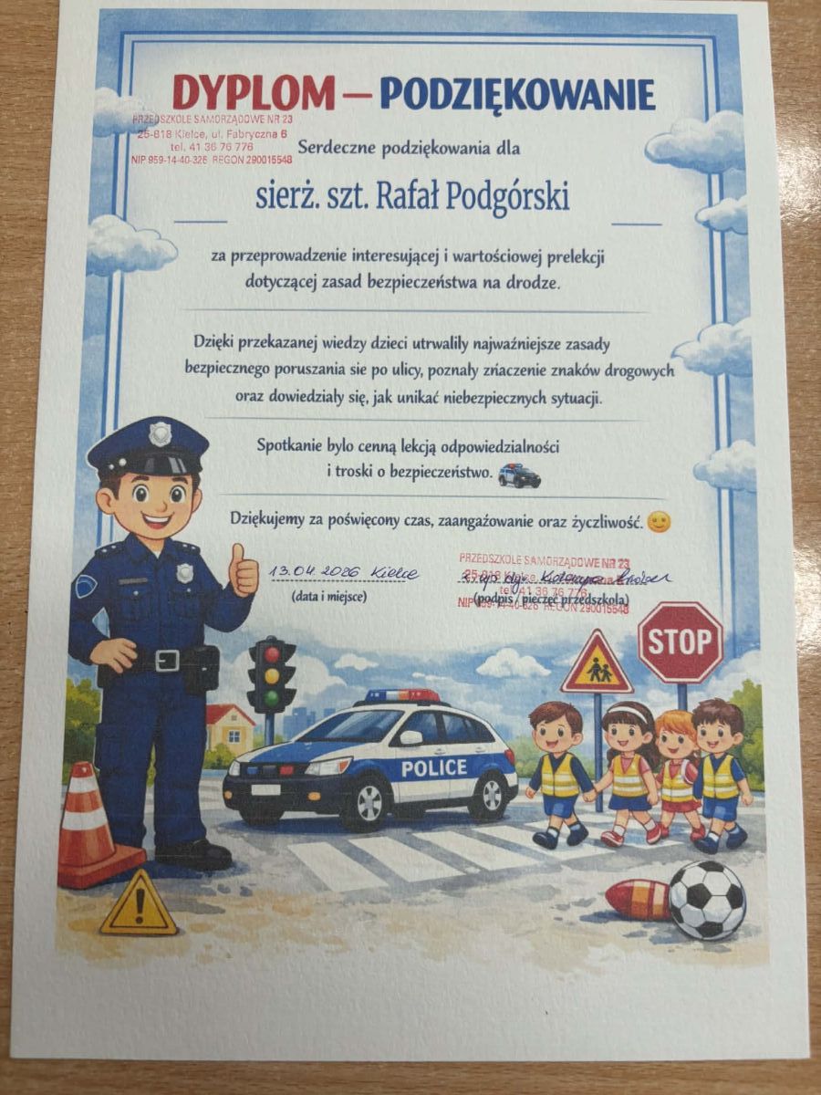 Serdeczne podziękowania składamy Panu sierż. szt. Rafałowi Podgórskiemu oraz Panu sierż. szt. Dariuszowi Błaszczykowi z II Komisariatu Policji w Kielcach za przeprowadzenie interesującej i pouczającej prelekcji. Dziękujemy za poświęcony czas, przekazaną wiedzę oraz kształtowanie u dzieci właściwych nawyków związanych z bezpieczeństwem na drodze.