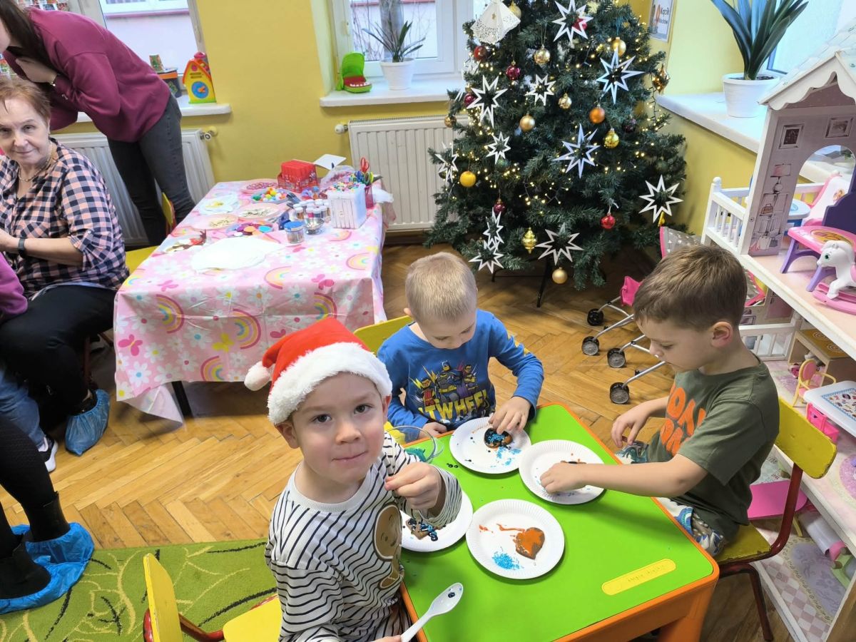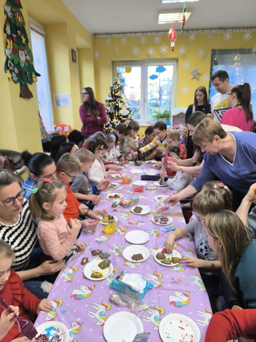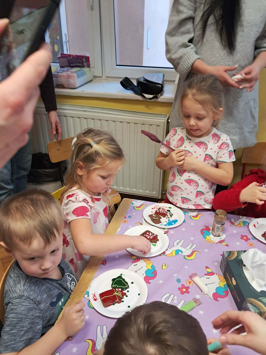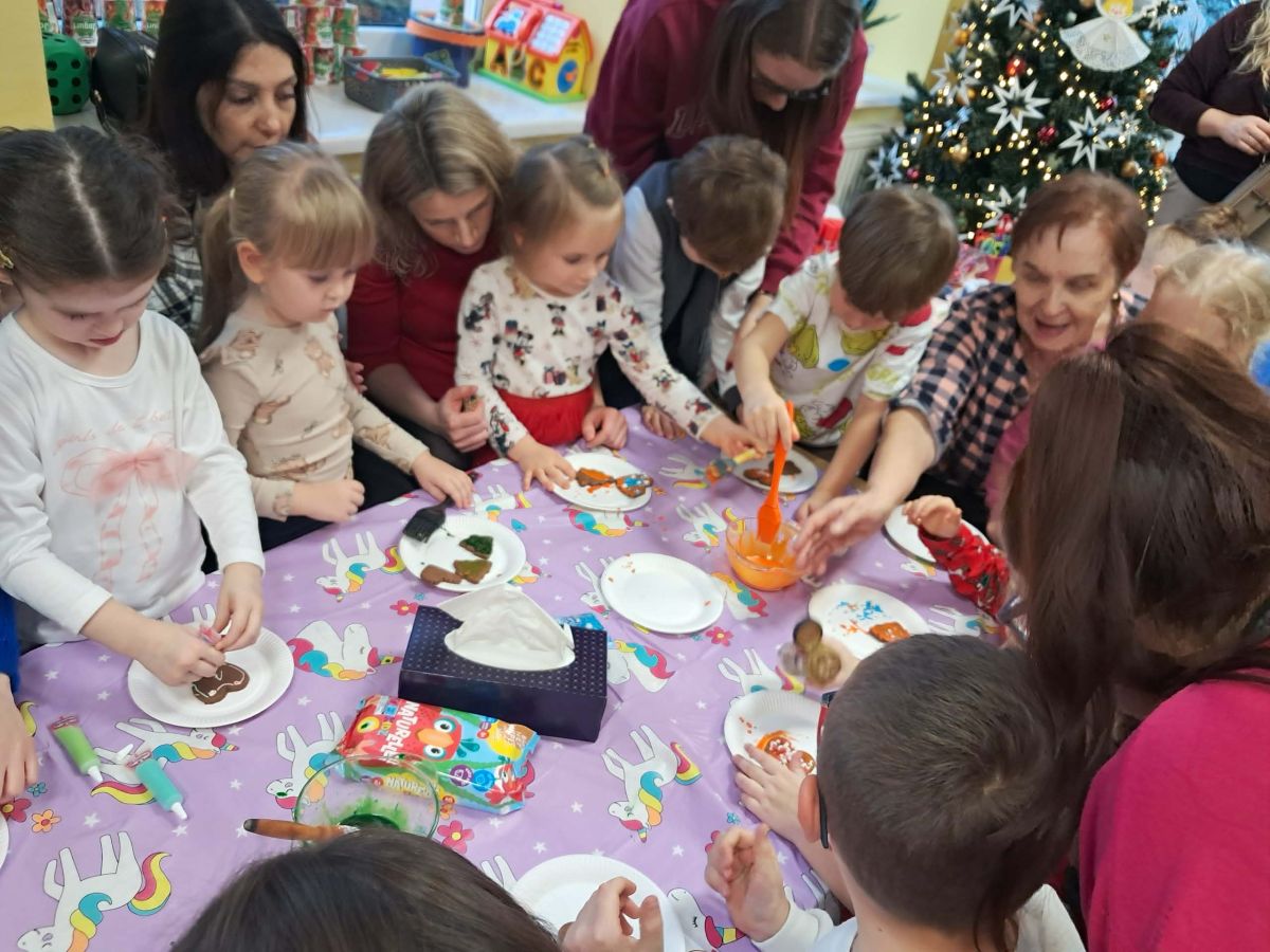 „Świeć gwiazdeczko, świeć…” – świąteczny hit zespołu Arka Noego porwał do tańca zarówno dzieci, jak i rodziców. Po prezentacji piosenek i pastorałek wszyscy z ogromnym zaangażowaniem przystąpili do dekorowania pierniczków, upieczonych specjalnie na tę okazję przez mamę Kornelii – Panią Mariannę Bucką. Kolorowe lukry, posypki i pisaki cukrowe zachęcały małych artystów kulinarnych do twórczej pracy.