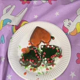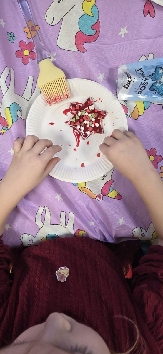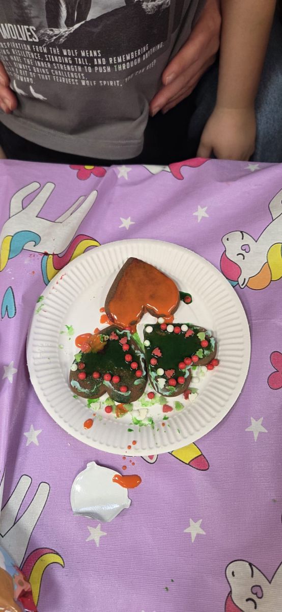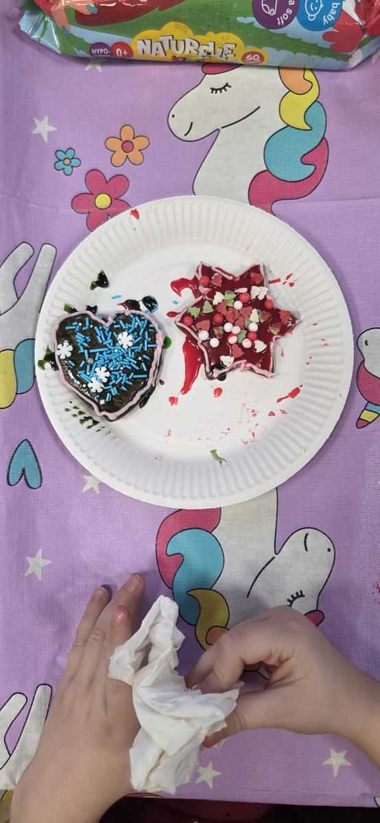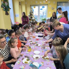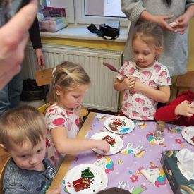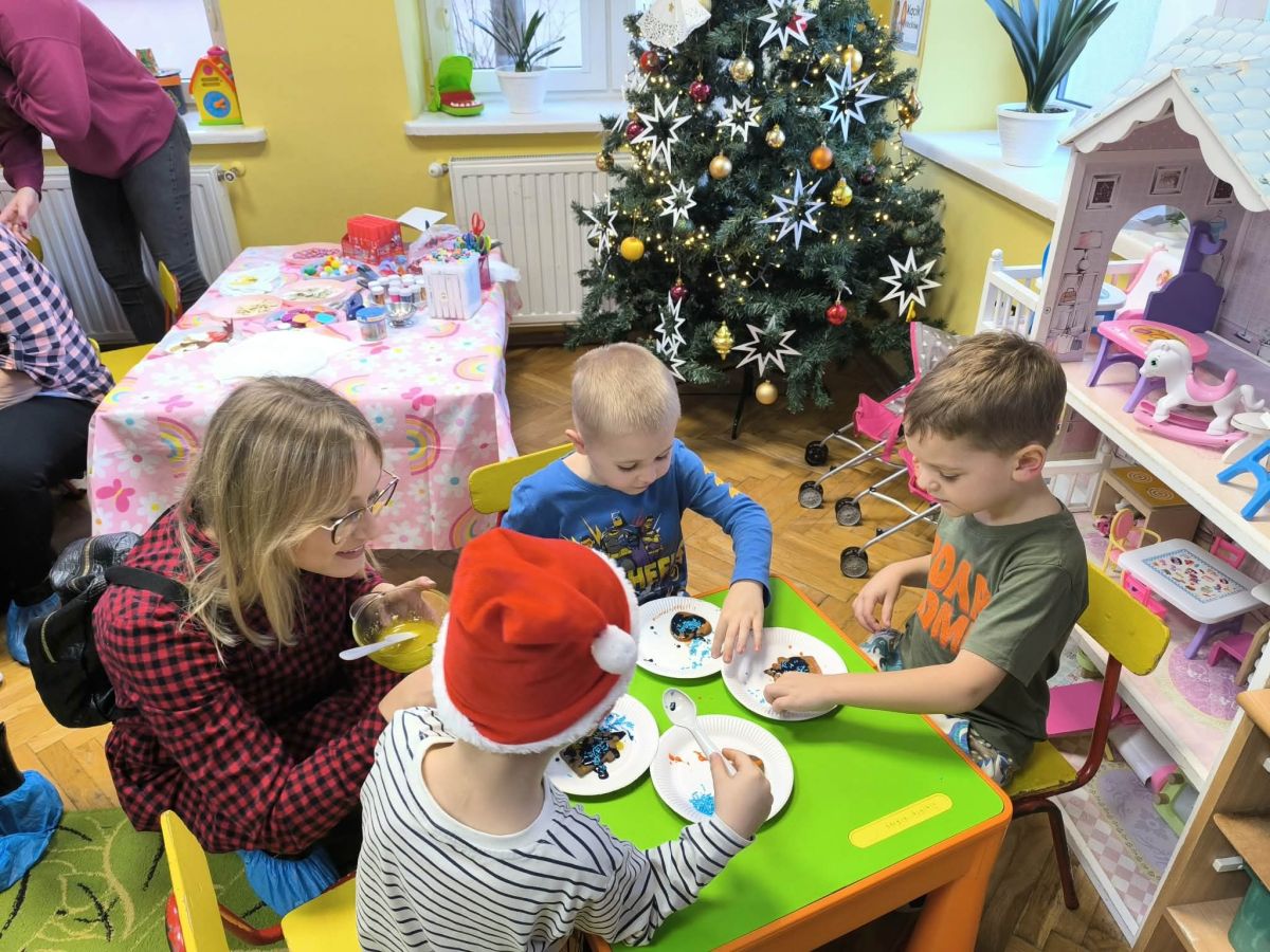 „Świeć gwiazdeczko, świeć…” – świąteczny hit zespołu Arka Noego porwał do tańca zarówno dzieci, jak i rodziców. Po prezentacji piosenek i pastorałek wszyscy z ogromnym zaangażowaniem przystąpili do dekorowania pierniczków, upieczonych specjalnie na tę okazję przez mamę Kornelii – Panią Mariannę Bucką. Kolorowe lukry, posypki i pisaki cukrowe zachęcały małych artystów kulinarnych do twórczej pracy.