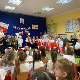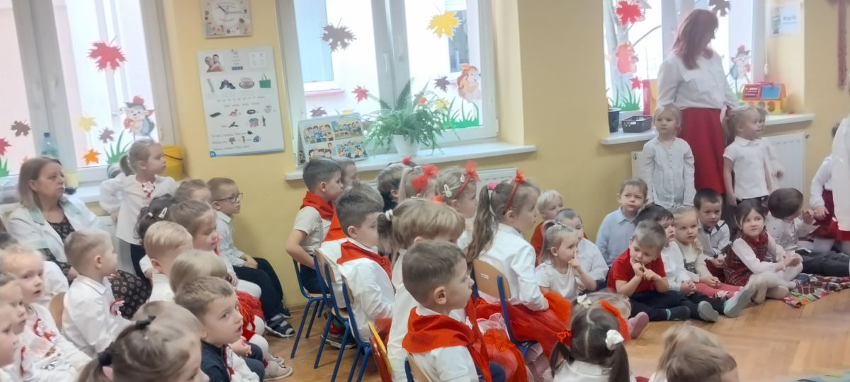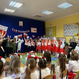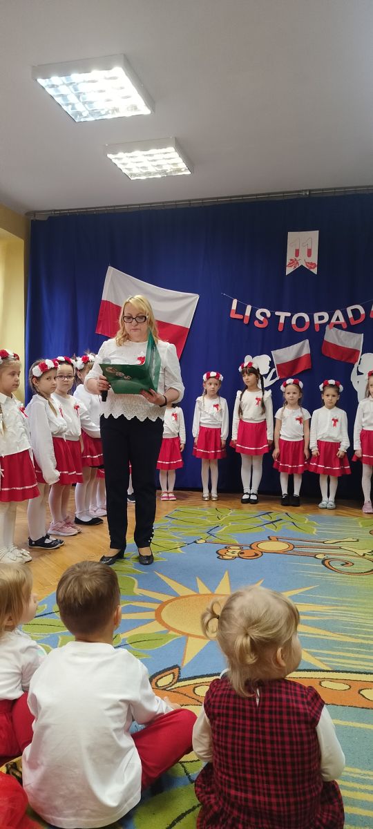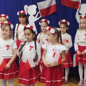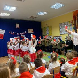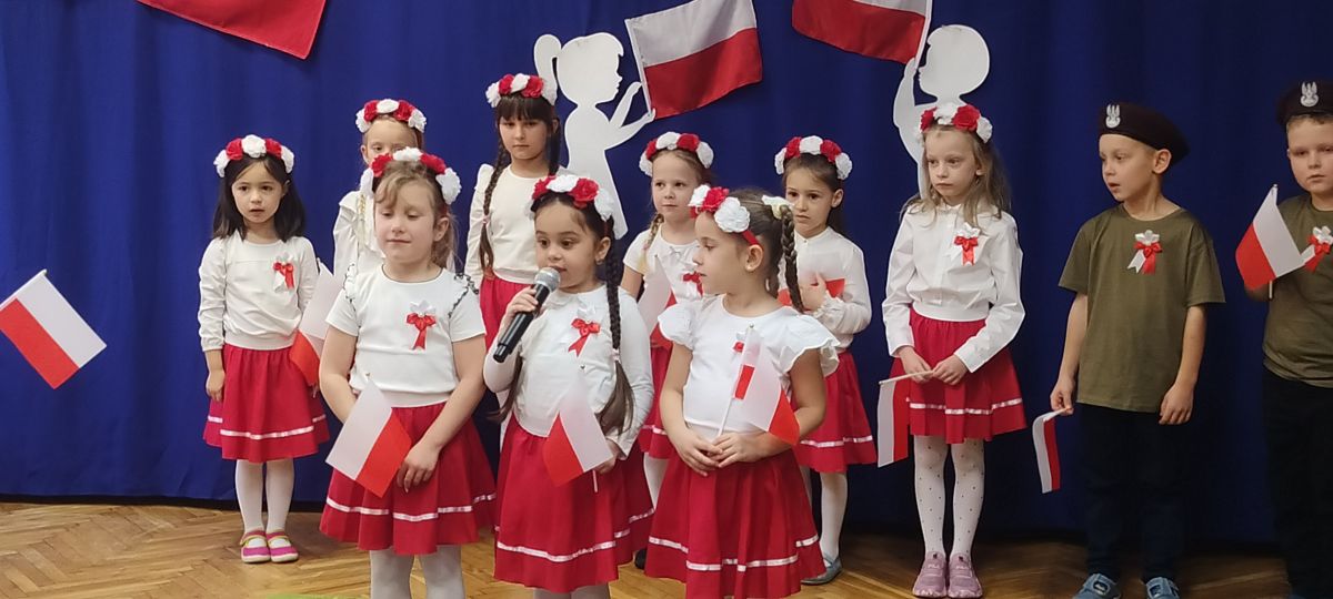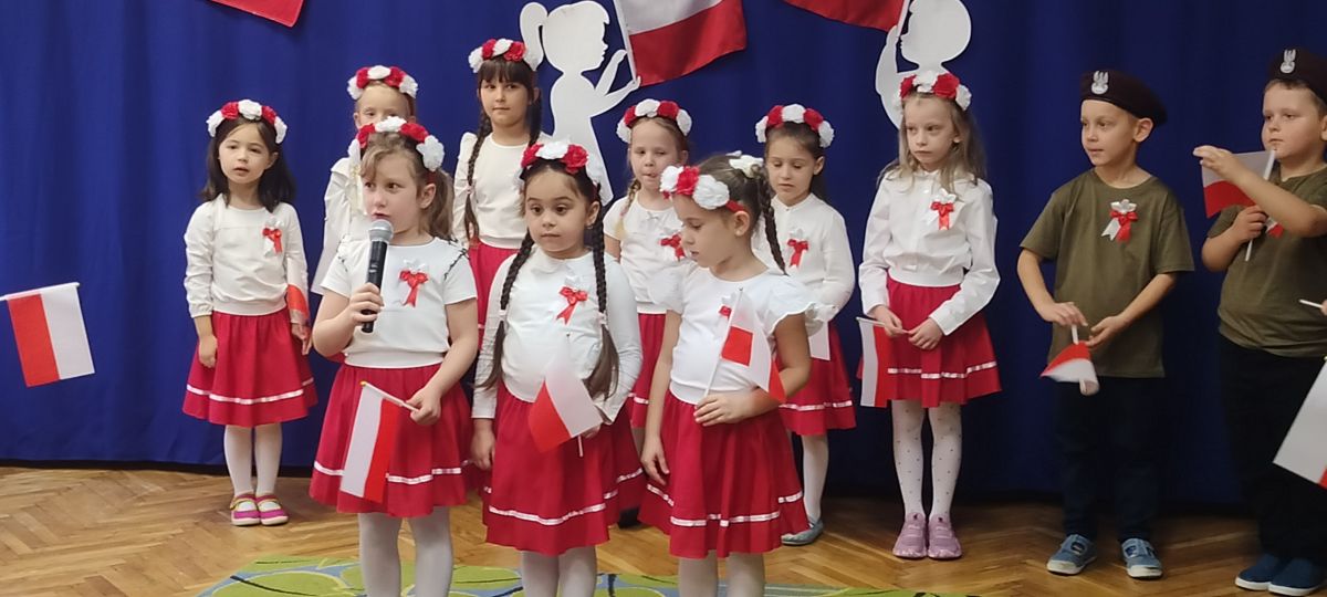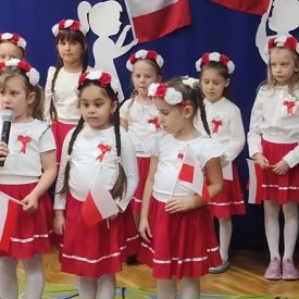Kolejnym punktem programu była część przygotowana przez grupę „Sówki”. Mali artyści przedstawili historię utraty i odzyskania niepodległości w formie krótkiego montażu słowno-muzycznego, który przybliżył najważniejsze wydarzenia z dziejów naszego kraju. Grupa zaprezentowała wiersze: „Barwy ojczyste” oraz „Co to jest Polska?”, w których dzieci z dumą podkreślały rolę symboli narodowych oraz piękno ojczystej ziemi. W dalszej części programu dzieci śpiewały pieśni patriotyczne: