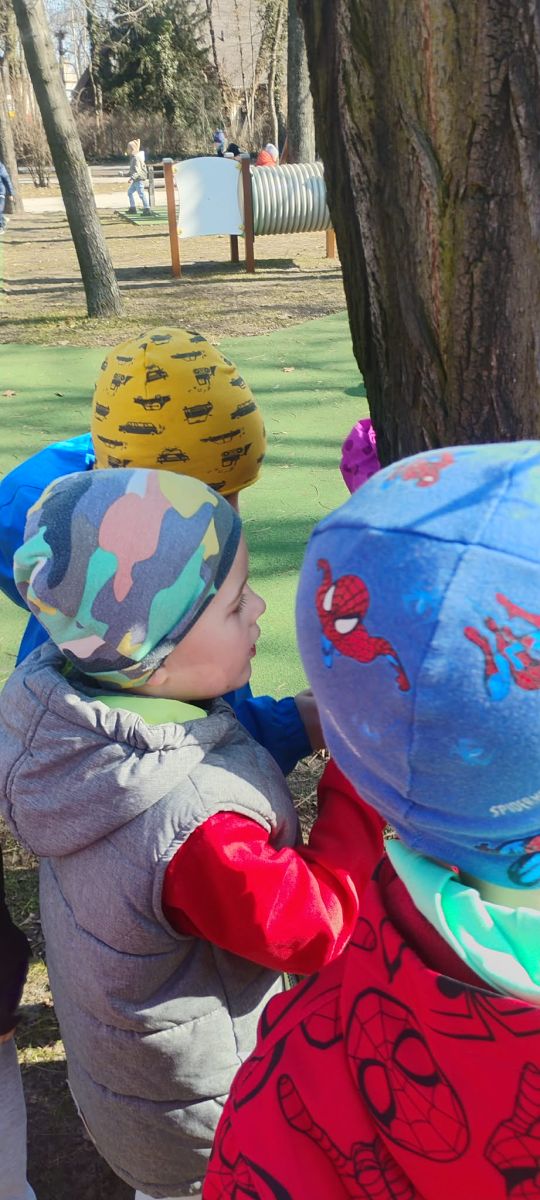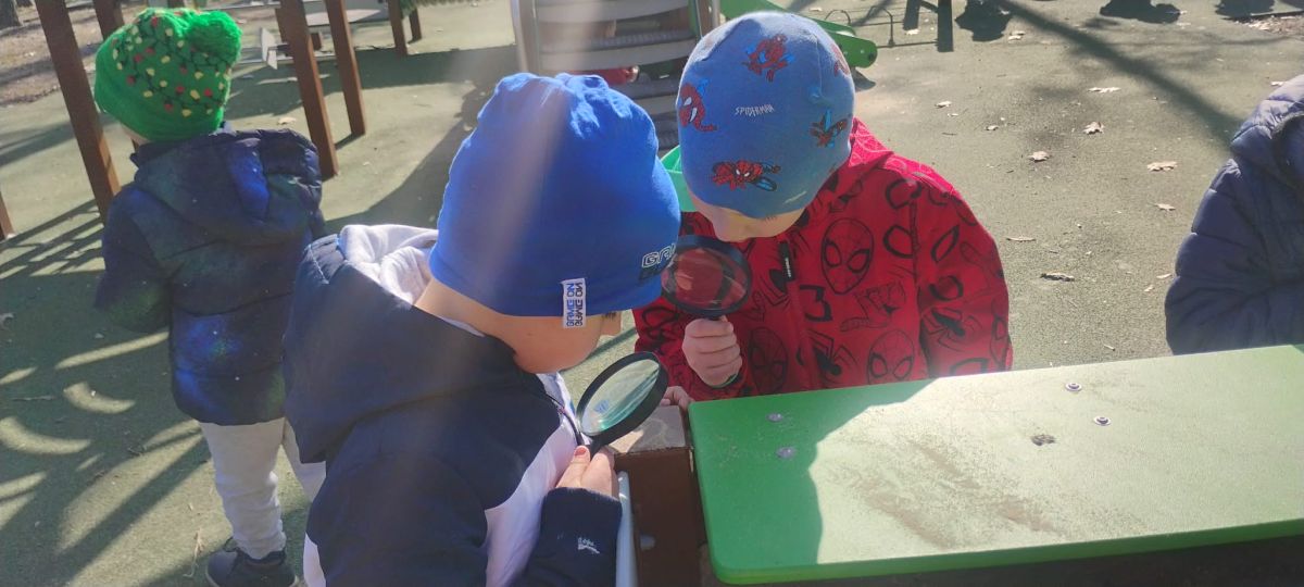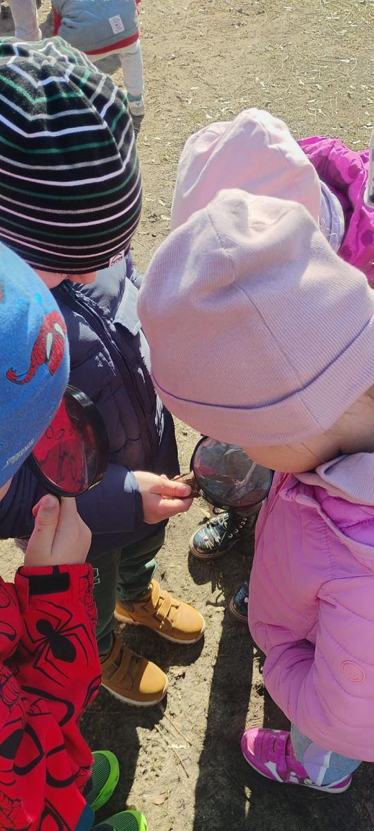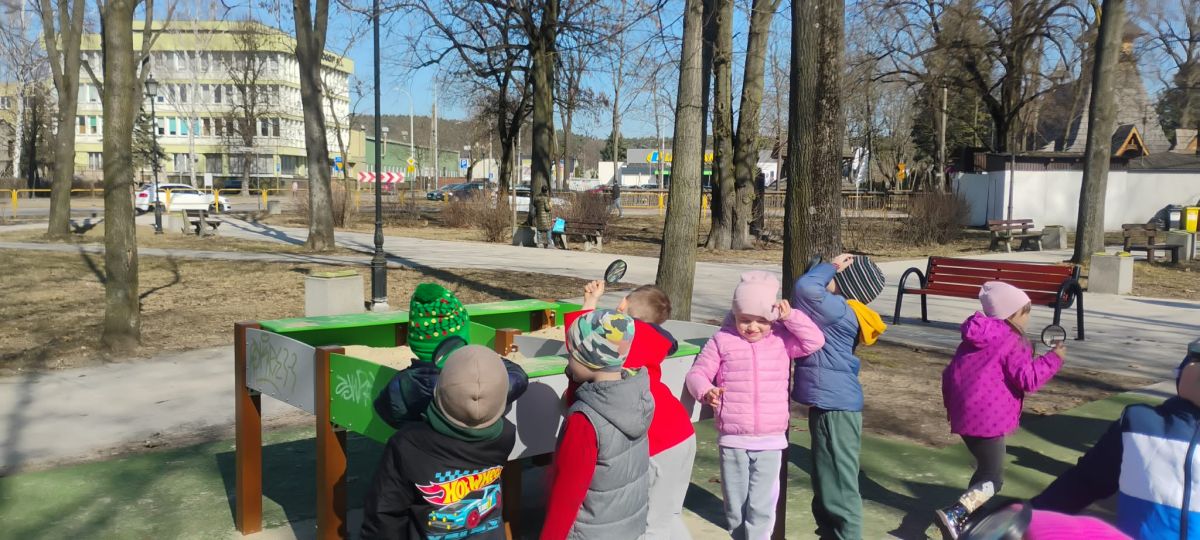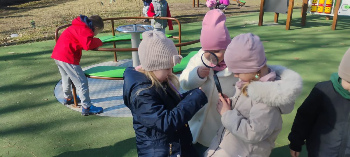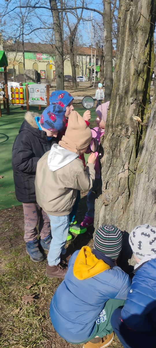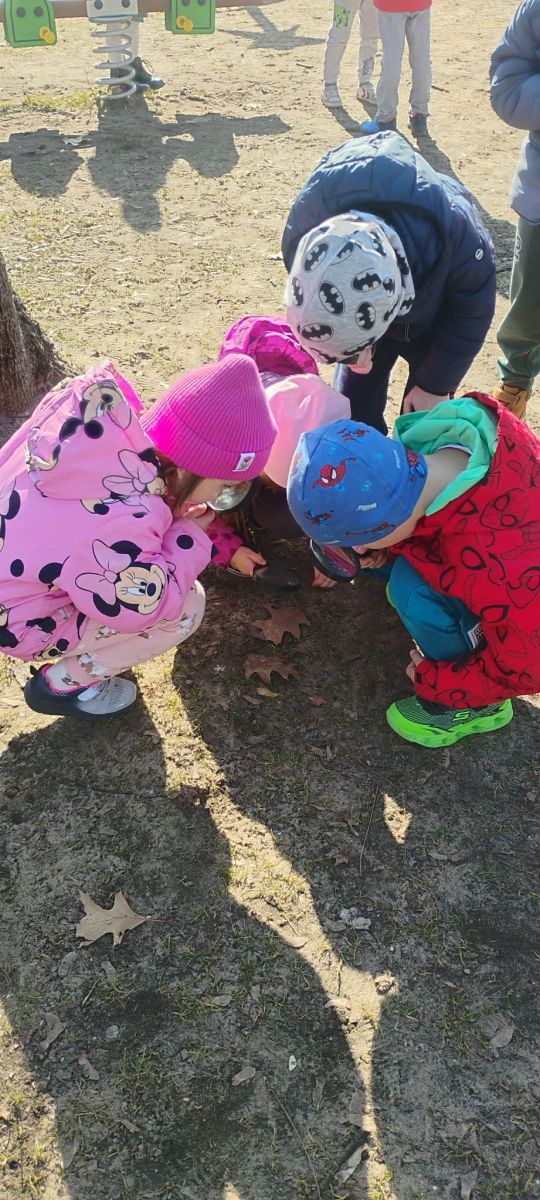 Dzieci z ciekawością rozglądały się wokół, próbując odnaleźć pierwsze oznaki nadchodzącej pory roku. Wyruszyły na plac przedszkolny oraz na spacer w okolicy przedszkola, gdzie – niczym mali odkrywcy – obserwowały przyrodę przez lupy oraz zaznaczały swoje spostrzeżenia na „kartach tropiciela przedwiośnia”.