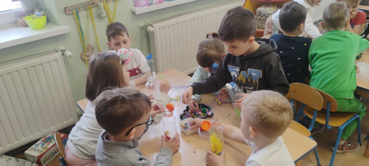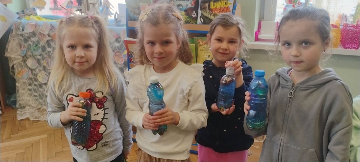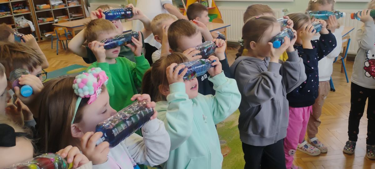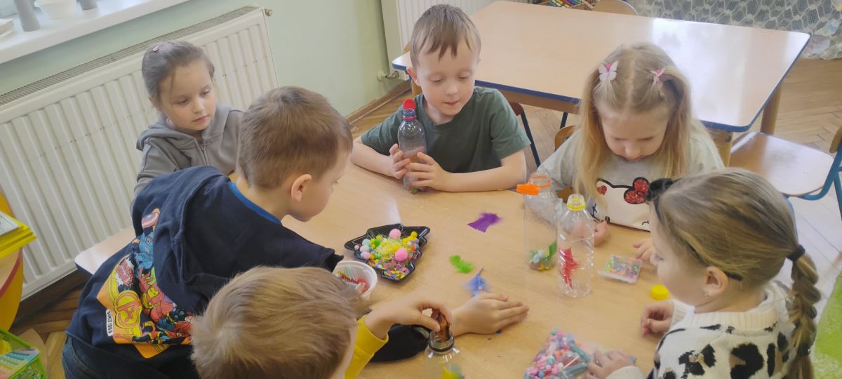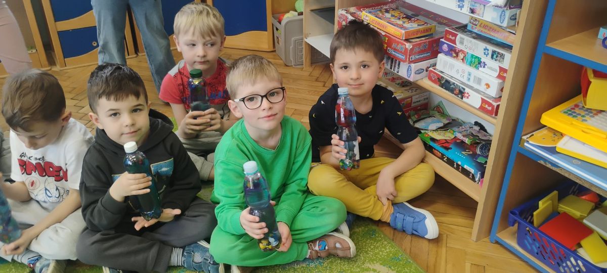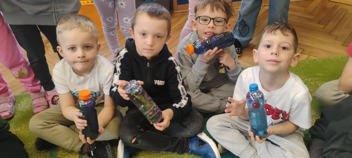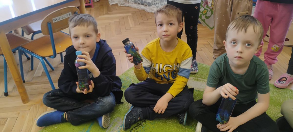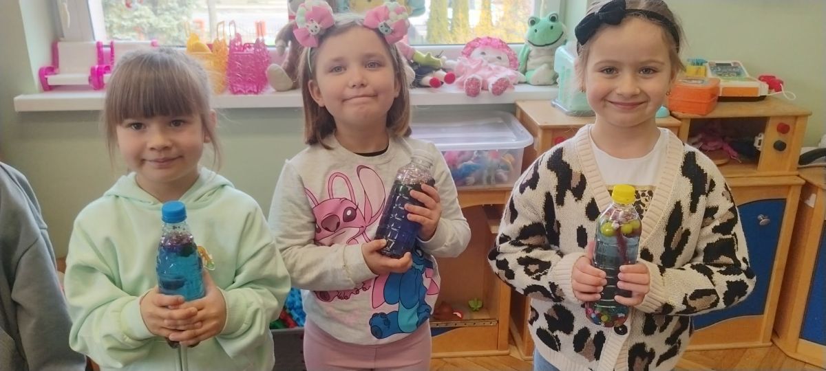 Nie zabrakło również twórczych działań – dzieci wykonały butelki sensoryczne, przez które oglądały świat w zupełnie nowy sposób. Kolorowe refleksy i ruch sprawiły, że otoczenie wydawało się jeszcze bardziej niezwykłe i pełne tajemnic.