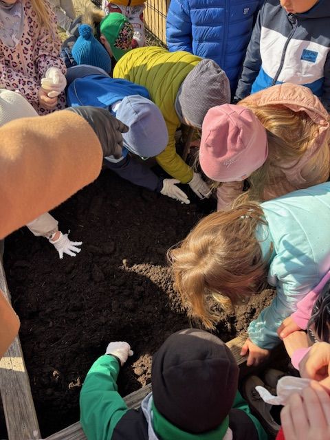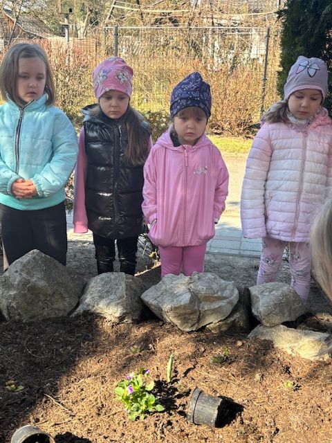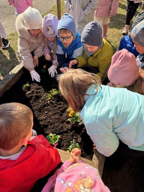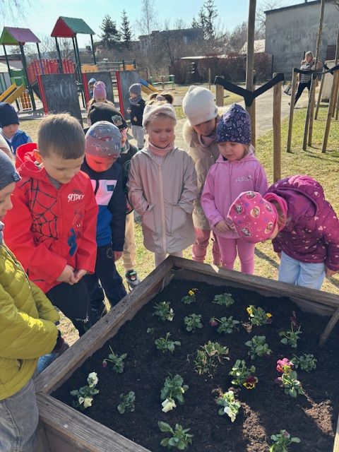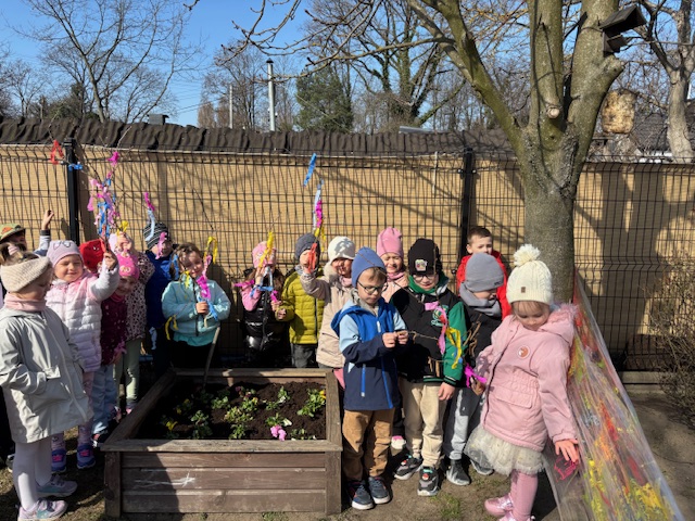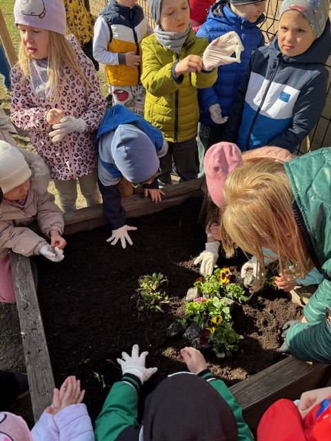 Przedszkolaki wcieliły się także w rolę małych ogrodników i z wielkim zaangażowaniem sadziły kwiaty. Była to nie tylko świetna zabawa, ale także ważna lekcja troski o przyrodę oraz cierpliwego oczekiwania na efekty swojej pracy.