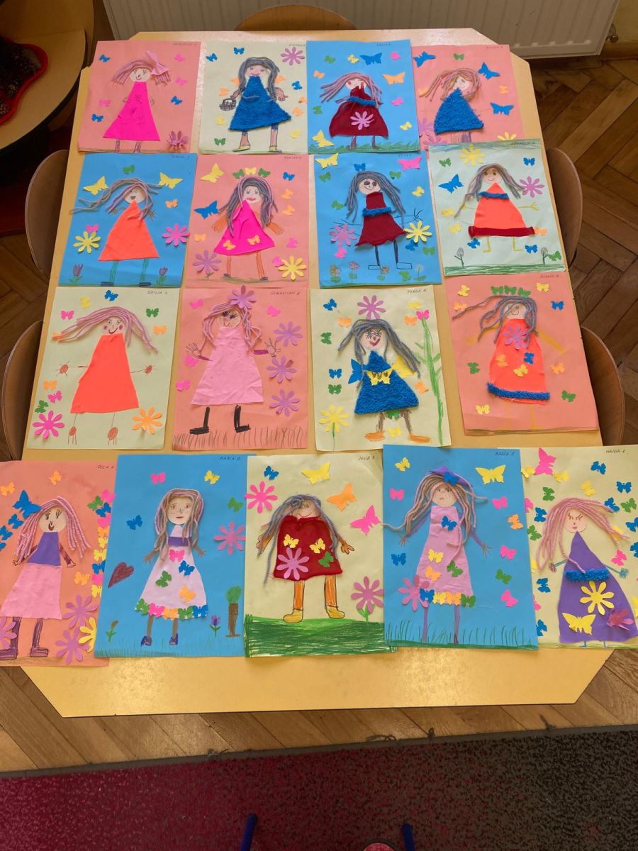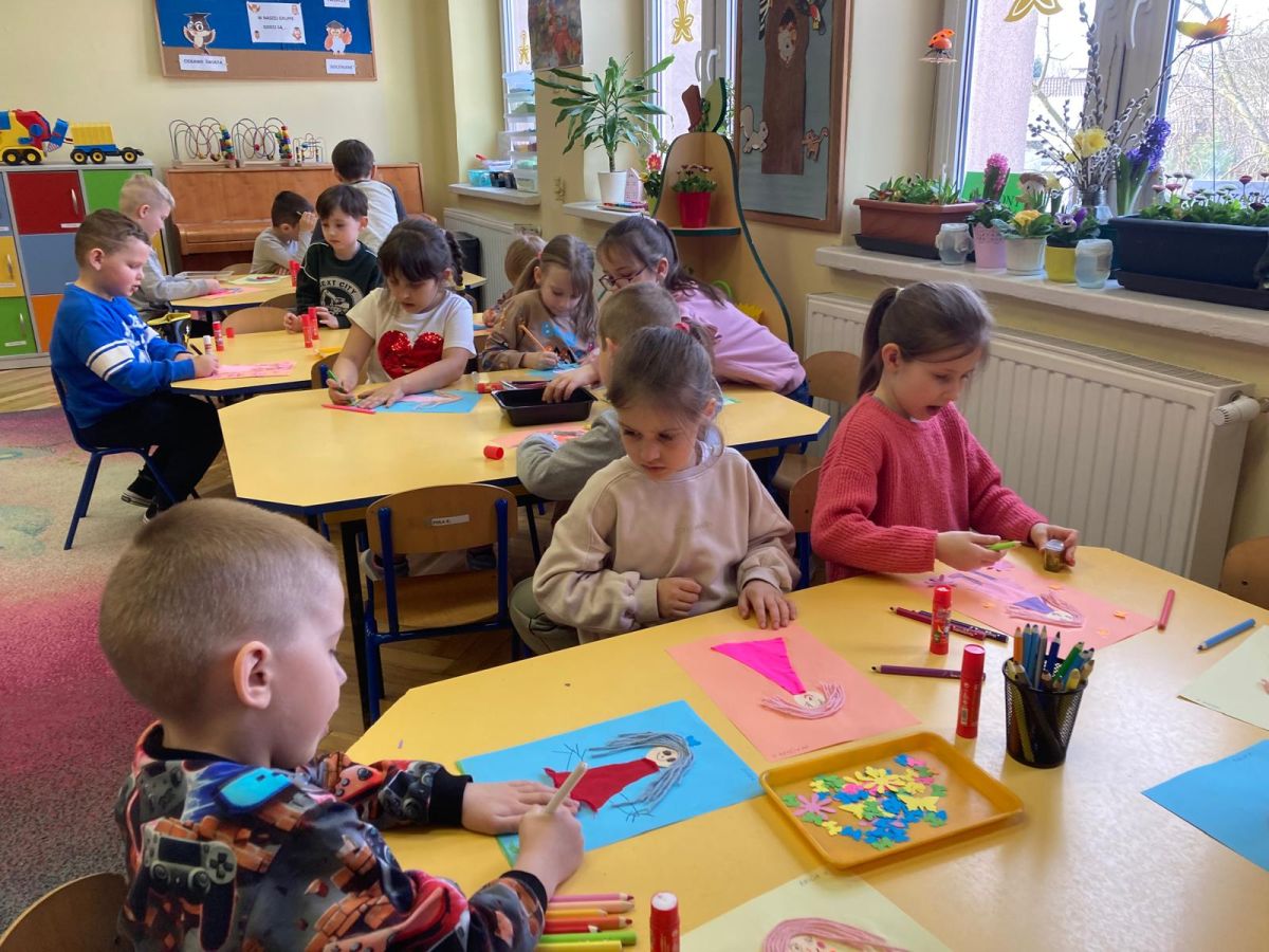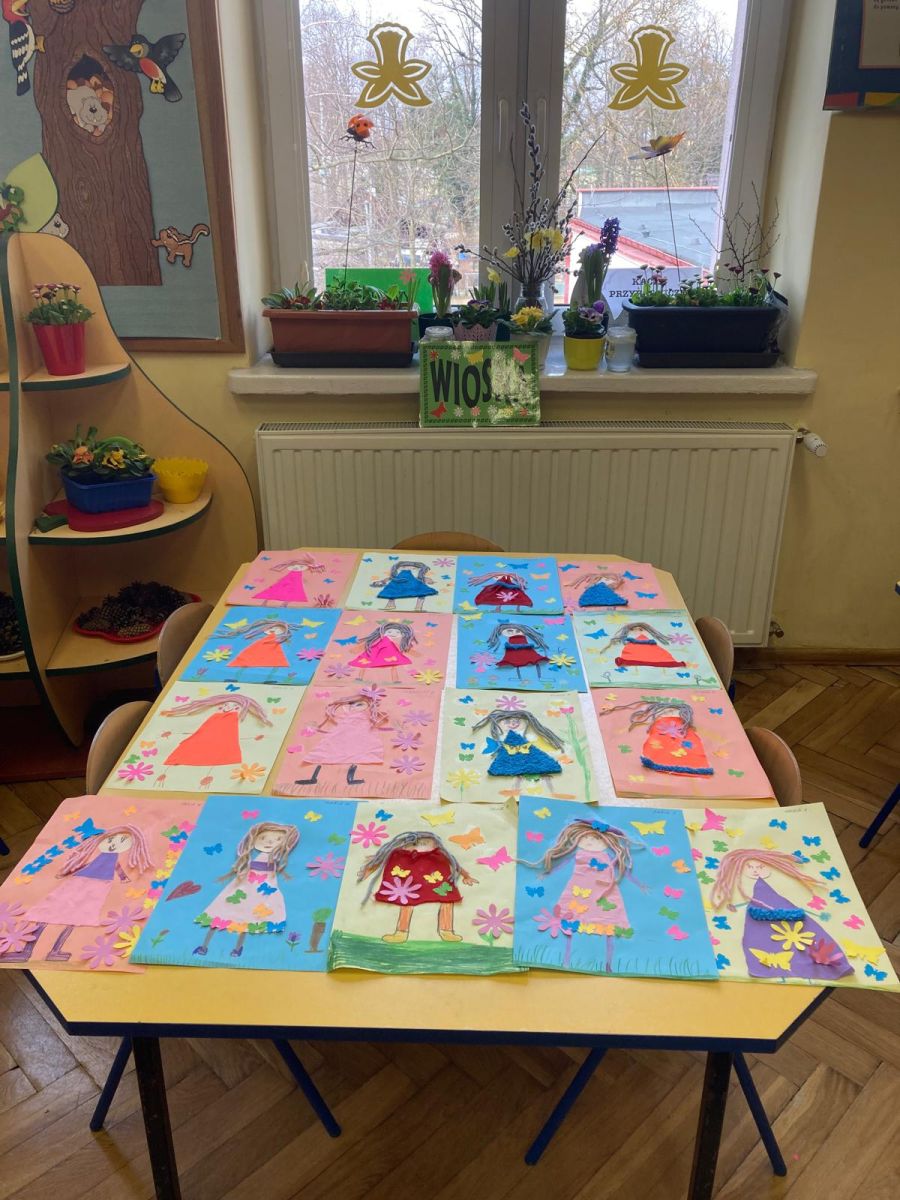Nie zabrakło również aktywności plastycznej. Dzieci wykonały pracę pt. „Pani Wiosna”, wykorzystując różnorodne materiały i kolory. Ich prace były pełne barw, pomysłowości i dziecięcej wyobraźni, a każda z nich przedstawiała wiosnę w wyjątkowy sposób.