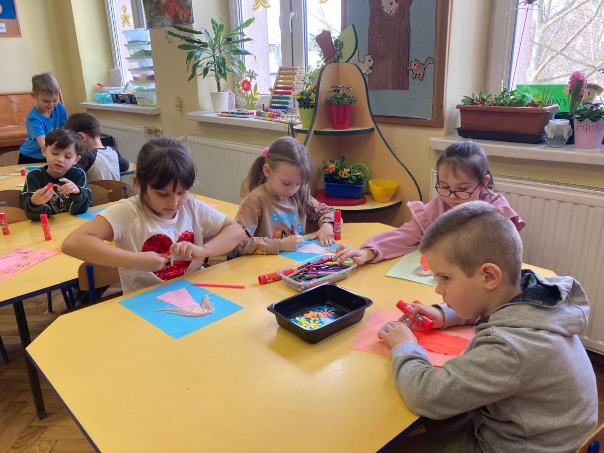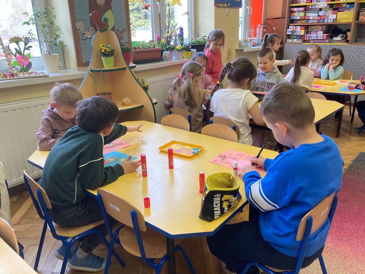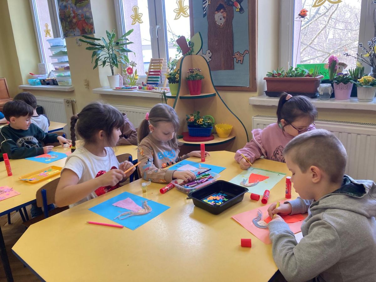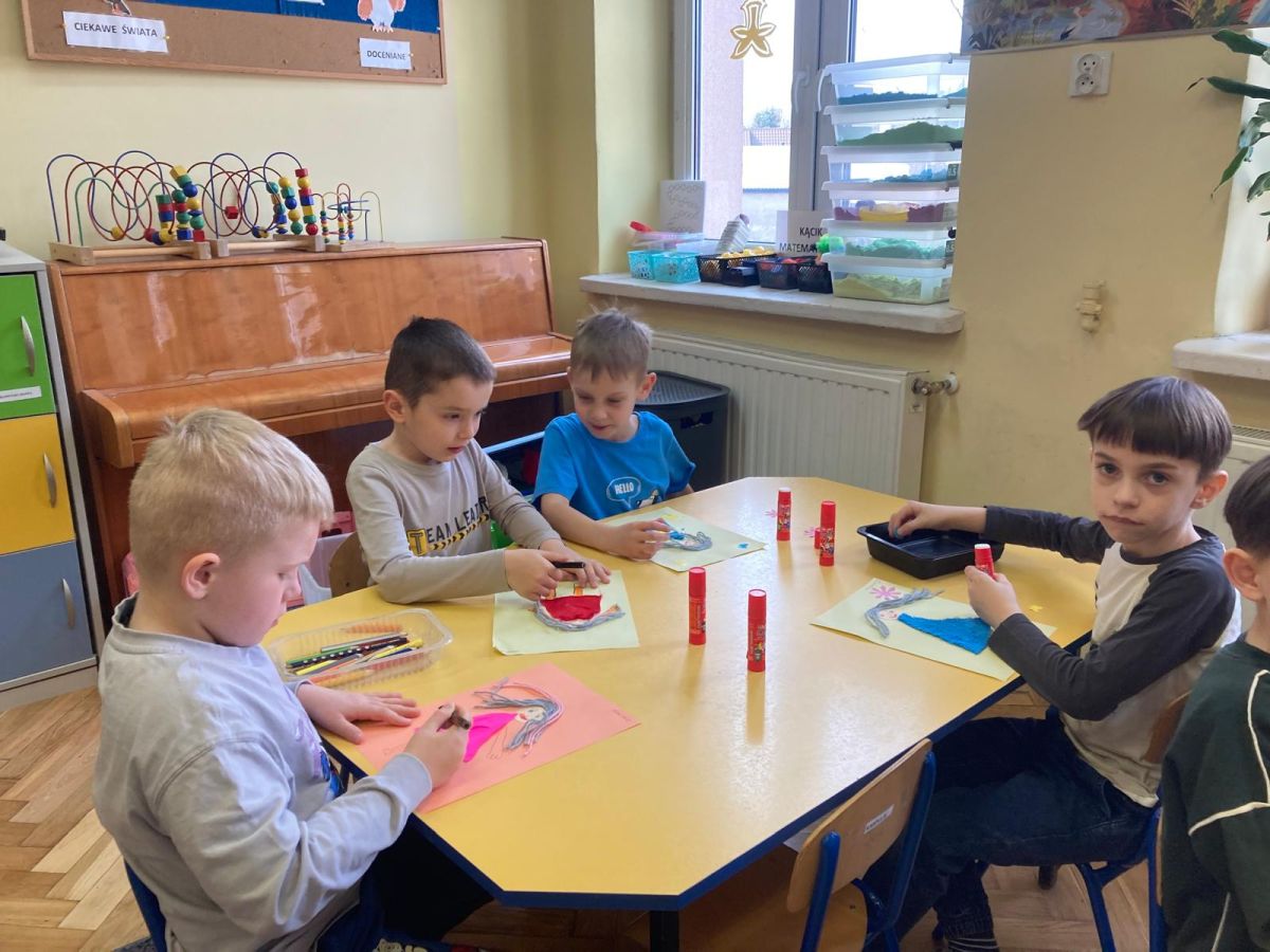 Nie zabrakło również aktywności plastycznej. Dzieci wykonały pracę pt. „Pani Wiosna”, wykorzystując różnorodne materiały i kolory. Ich prace były pełne barw, pomysłowości i dziecięcej wyobraźni, a każda z nich przedstawiała wiosnę w wyjątkowy sposób.