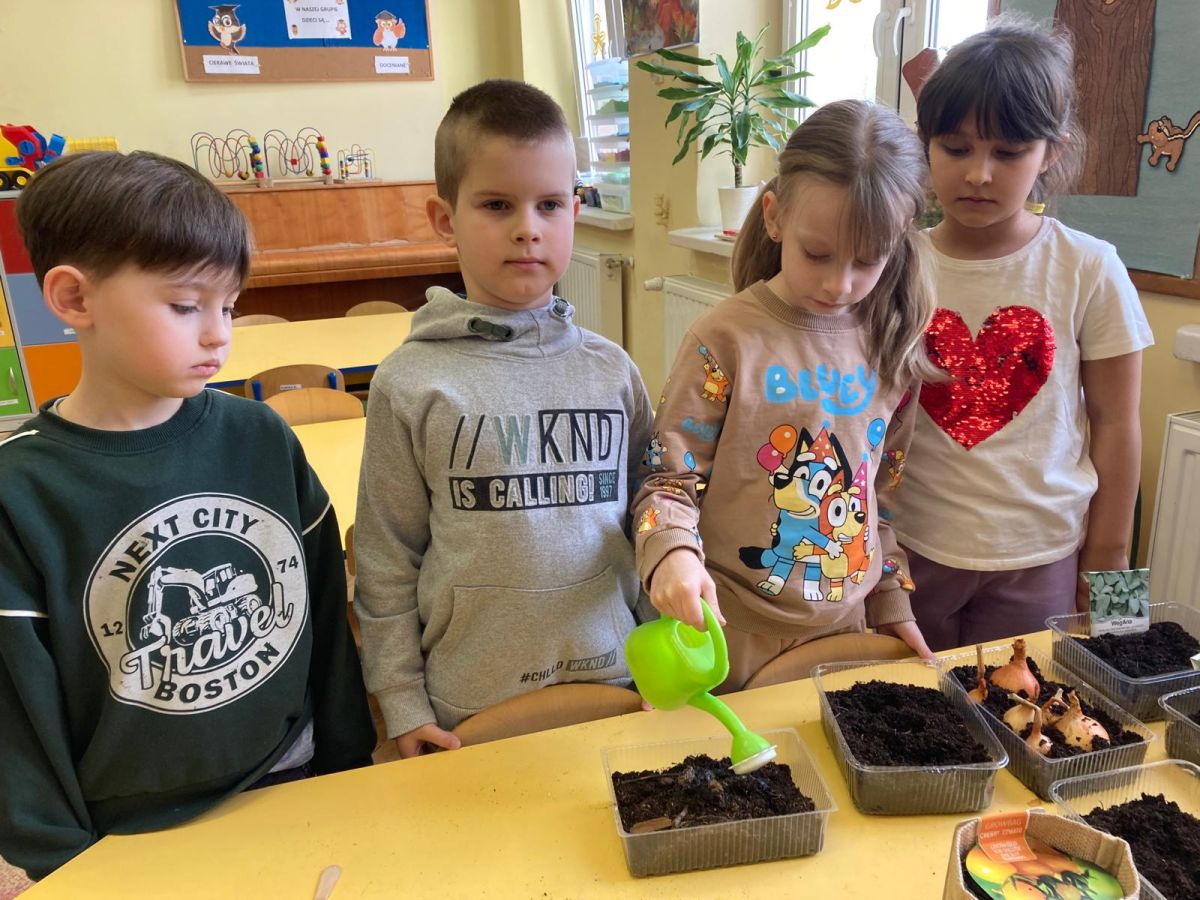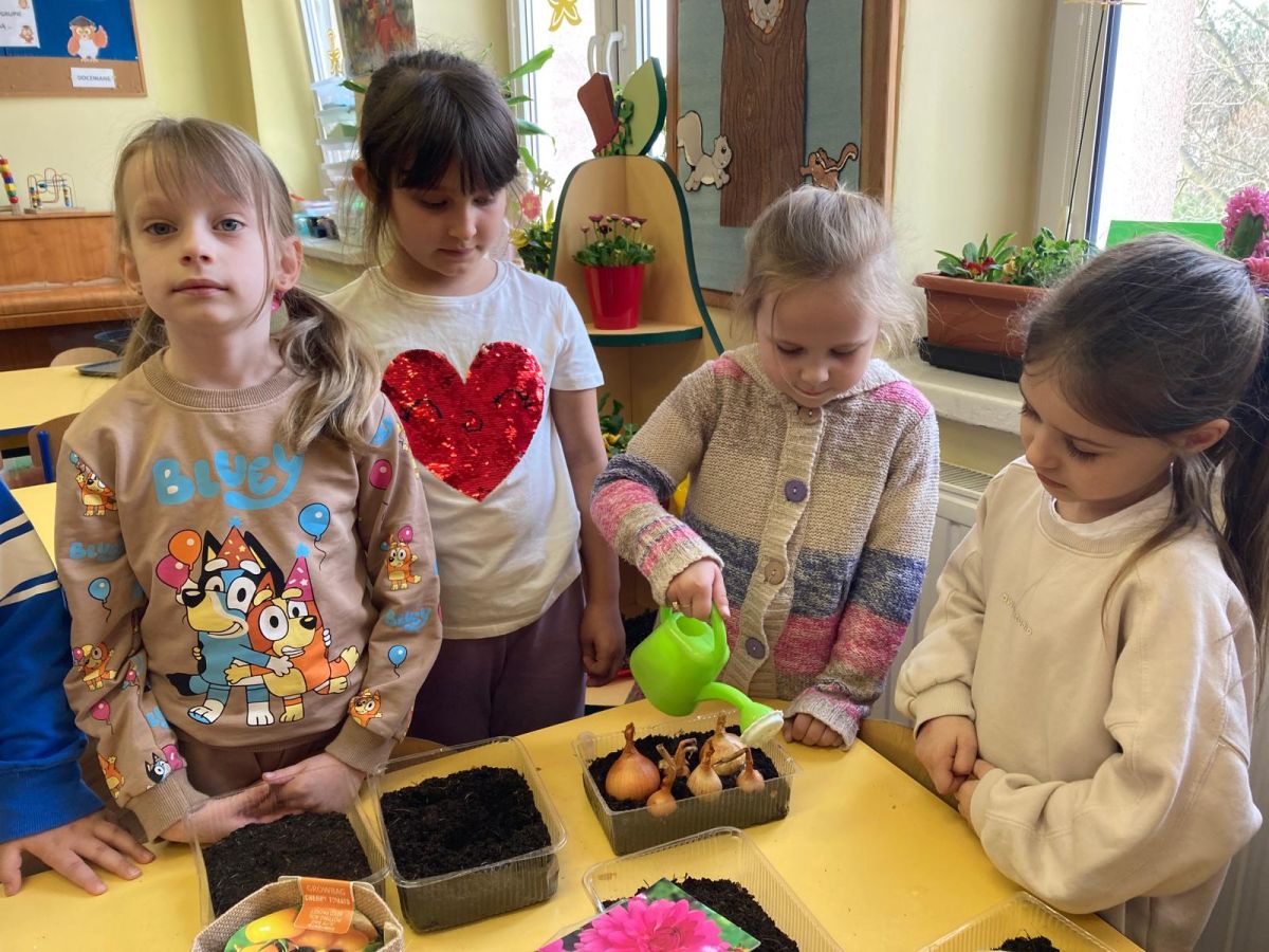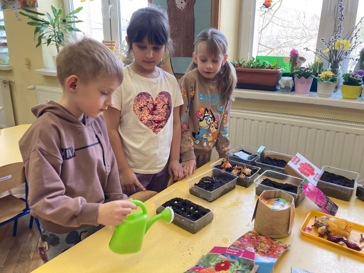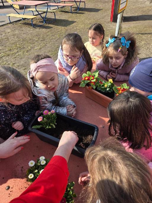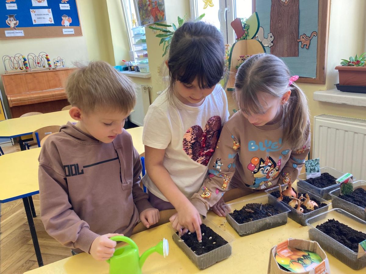 Następnie przedszkolaki z zaangażowaniem przystąpiły do działań ogrodniczych. Dzieci sadziły wiosenne kwiaty, cebulę oraz wysiewały nasiona warzyw i ziół. Każde z nich mogło poczuć się jak prawdziwy ogrodnik, ucząc się jednocześnie odpowiedzialności i troski o rośliny. Z zainteresowaniem obserwowały, jak wygląda proces sadzenia i siania, z niecierpliwością czekając na pierwsze efekty swojej pracy.