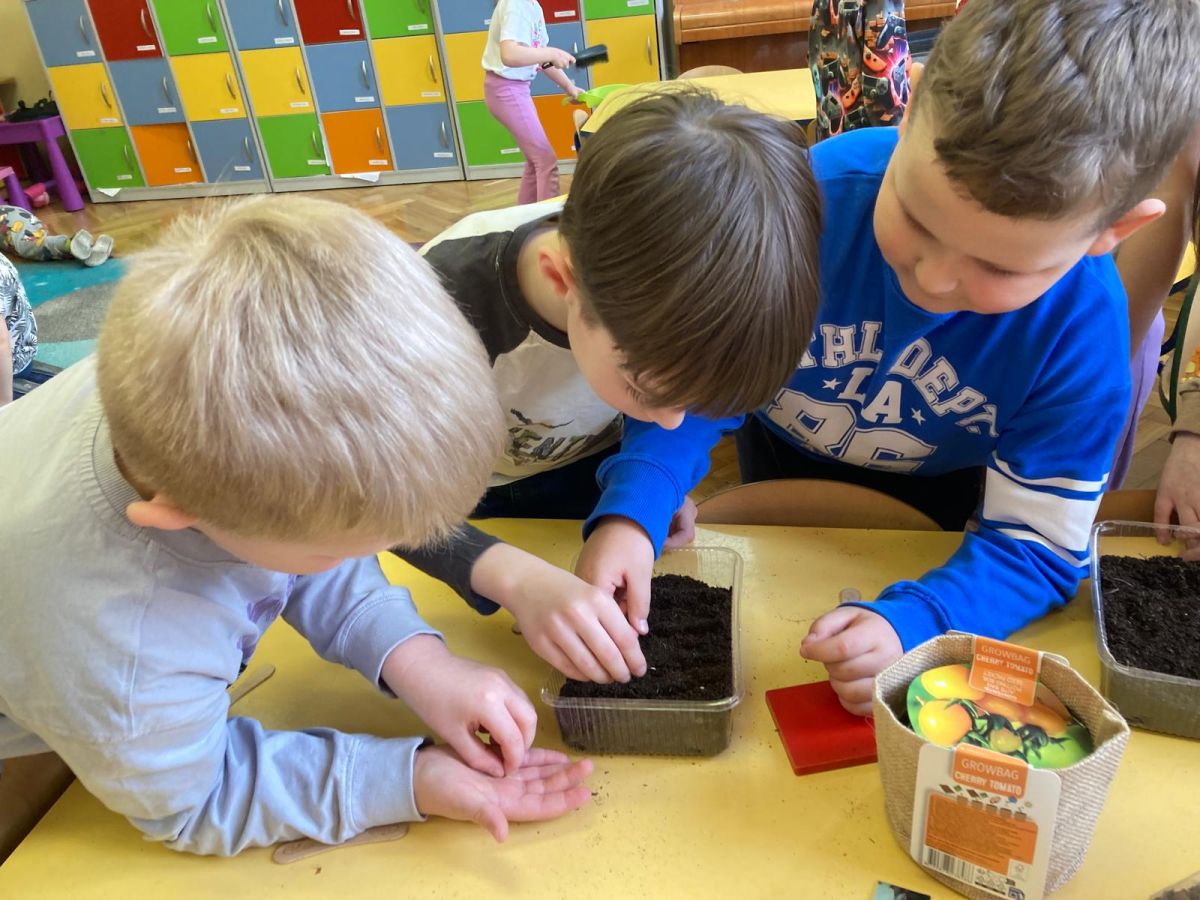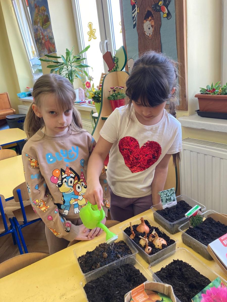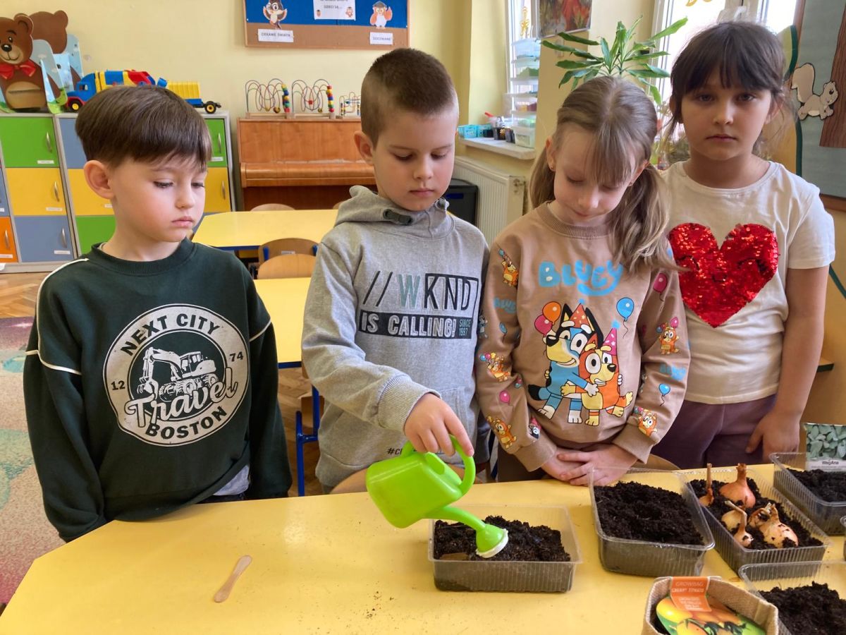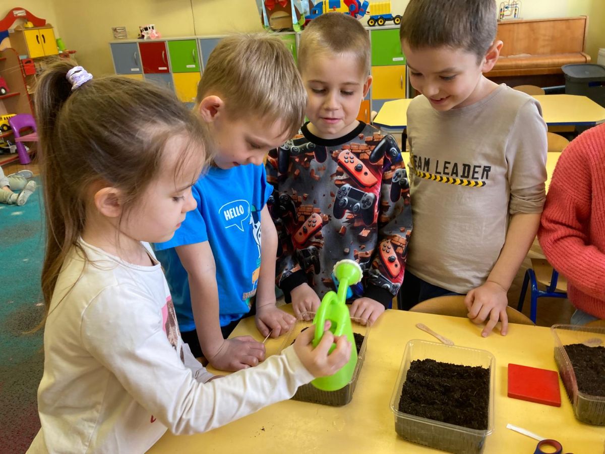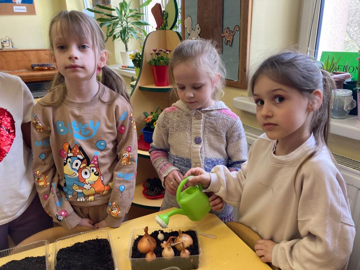 Następnie przedszkolaki z zaangażowaniem przystąpiły do działań ogrodniczych. Dzieci sadziły wiosenne kwiaty, cebulę oraz wysiewały nasiona warzyw i ziół. Każde z nich mogło poczuć się jak prawdziwy ogrodnik, ucząc się jednocześnie odpowiedzialności i troski o rośliny. Z zainteresowaniem obserwowały, jak wygląda proces sadzenia i siania, z niecierpliwością czekając na pierwsze efekty swojej pracy.