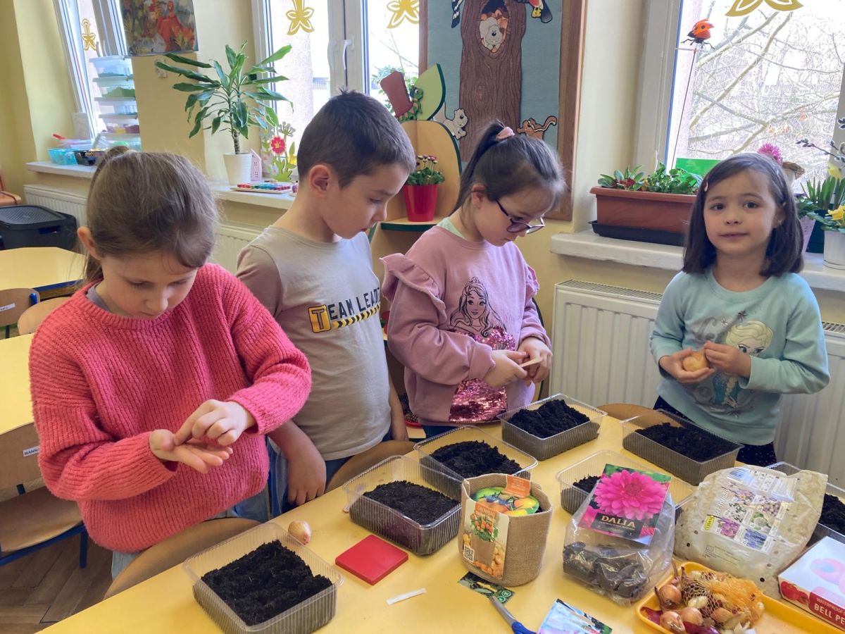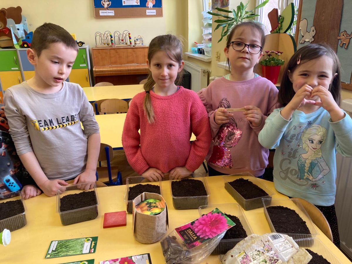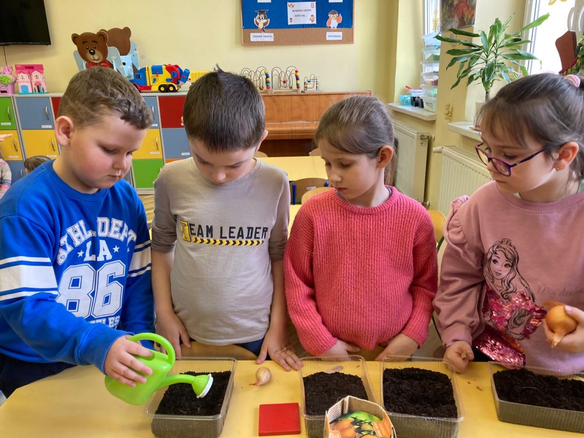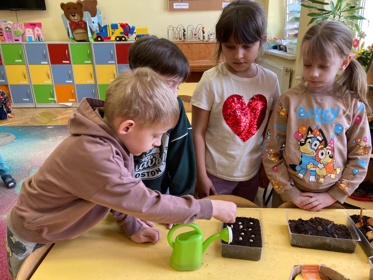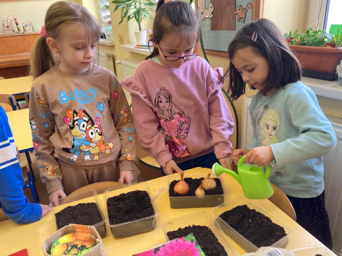 Następnie przedszkolaki z zaangażowaniem przystąpiły do działań ogrodniczych. Dzieci sadziły wiosenne kwiaty, cebulę oraz wysiewały nasiona warzyw i ziół. Każde z nich mogło poczuć się jak prawdziwy ogrodnik, ucząc się jednocześnie odpowiedzialności i troski o rośliny. Z zainteresowaniem obserwowały, jak wygląda proces sadzenia i siania, z niecierpliwością czekając na pierwsze efekty swojej pracy.
