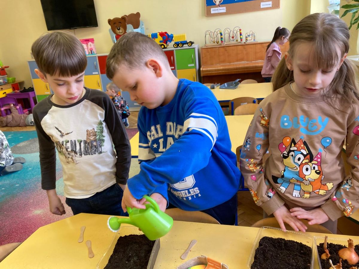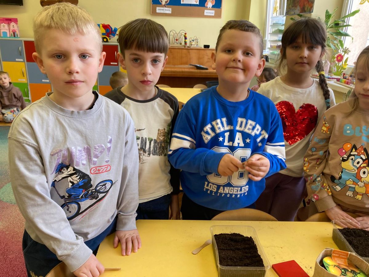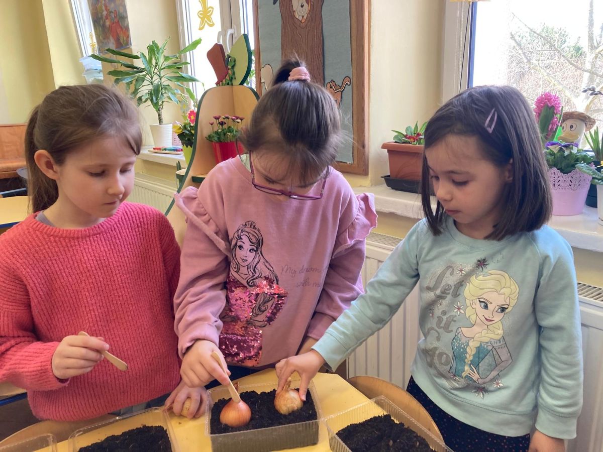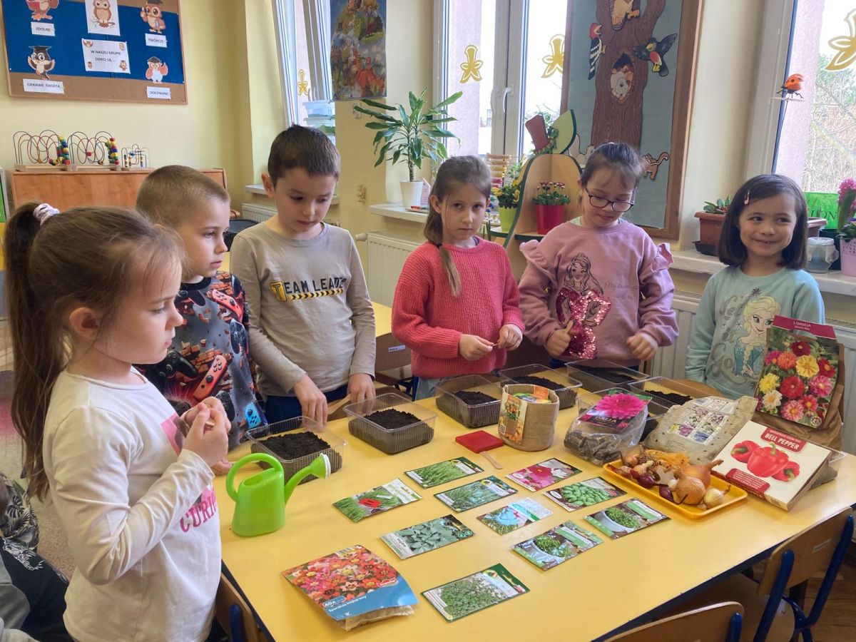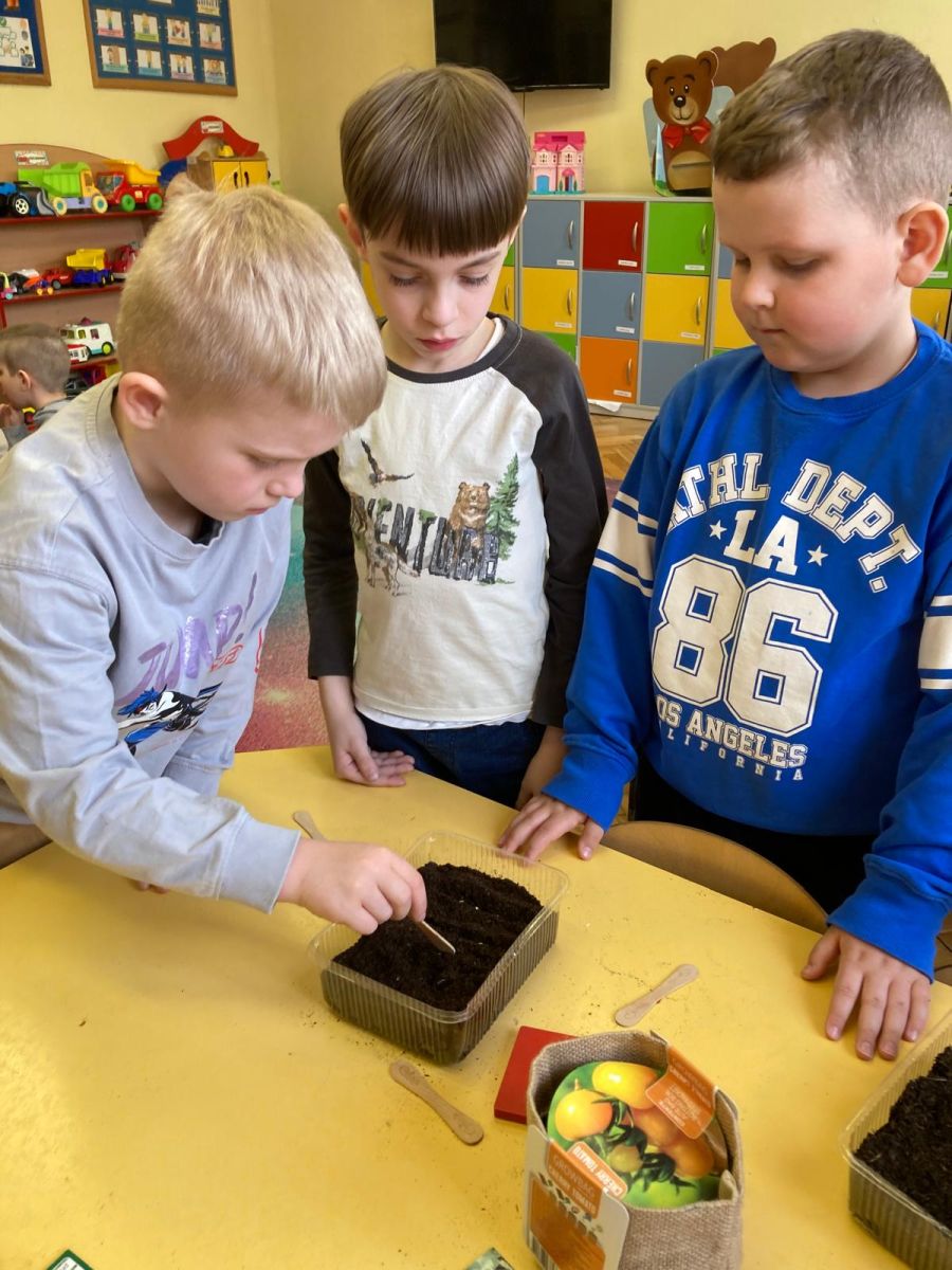 Następnie przedszkolaki z zaangażowaniem przystąpiły do działań ogrodniczych. Dzieci sadziły wiosenne kwiaty, cebulę oraz wysiewały nasiona warzyw i ziół. Każde z nich mogło poczuć się jak prawdziwy ogrodnik, ucząc się jednocześnie odpowiedzialności i troski o rośliny. Z zainteresowaniem obserwowały, jak wygląda proces sadzenia i siania, z niecierpliwością czekając na pierwsze efekty swojej pracy.