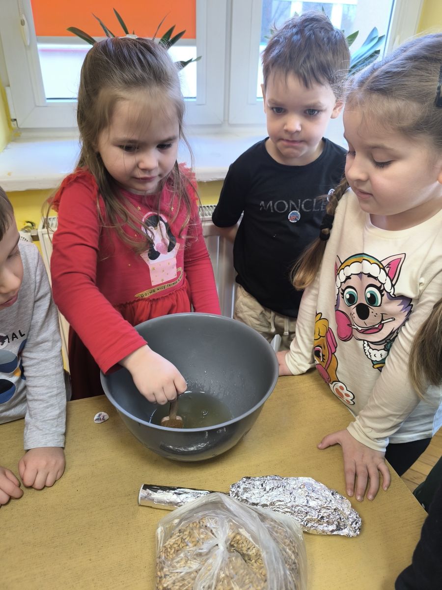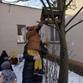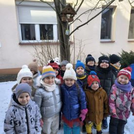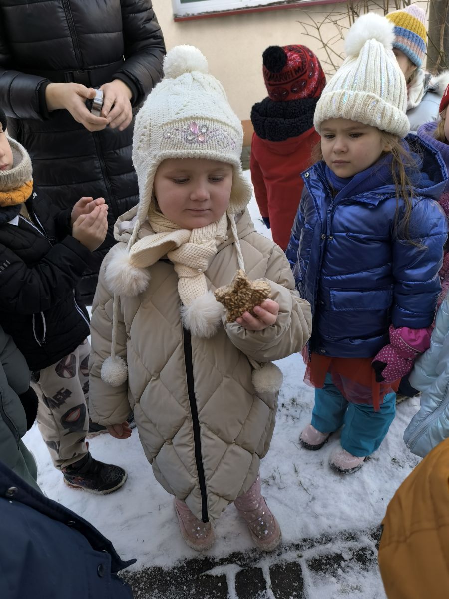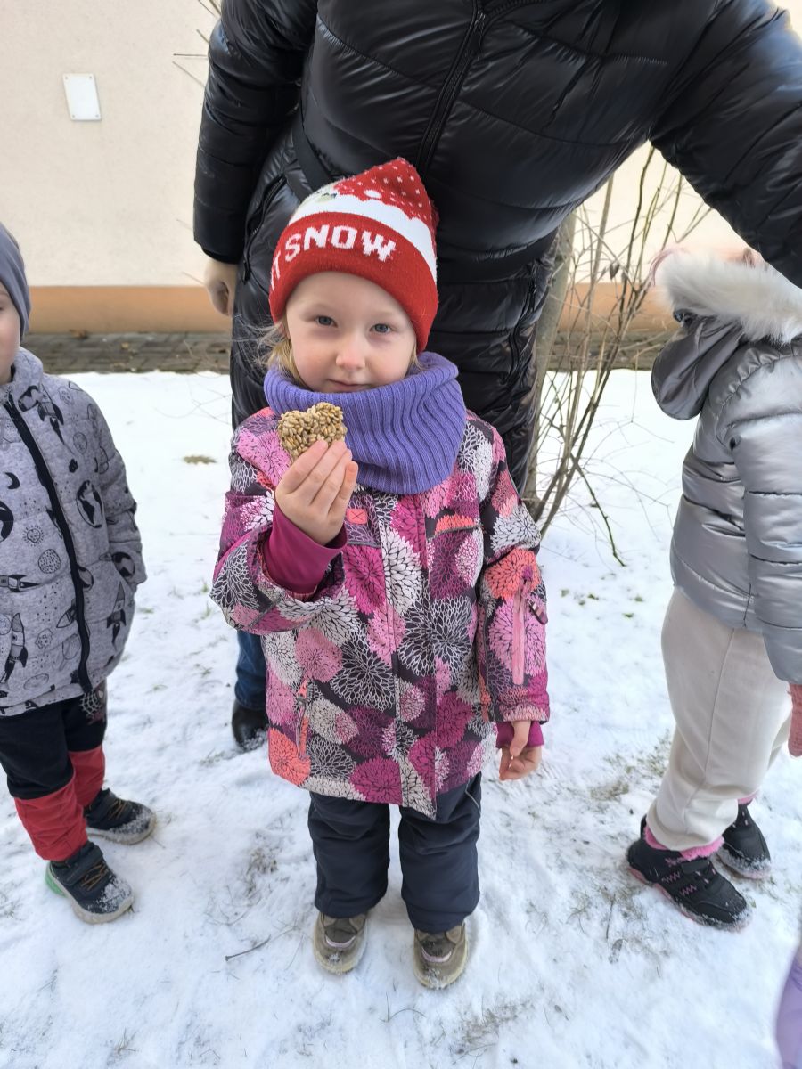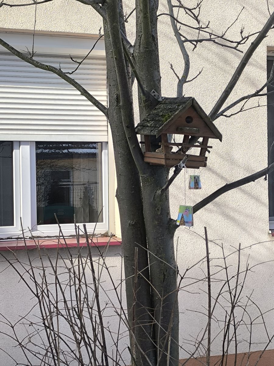 W minionym tygodniu grupa „Motylki” samodzielnie wykonała zawieszki z ziaren dla naszych małych, skrzydlatych przyjaciół. Następnie dzieci zawiesiły je w karmniku, który mogą obserwować z okna sali. Od tej pory codziennie z zainteresowaniem śledzą, jak przylatujące ptaki korzystają z przygotowanego przez nich pokarmu.