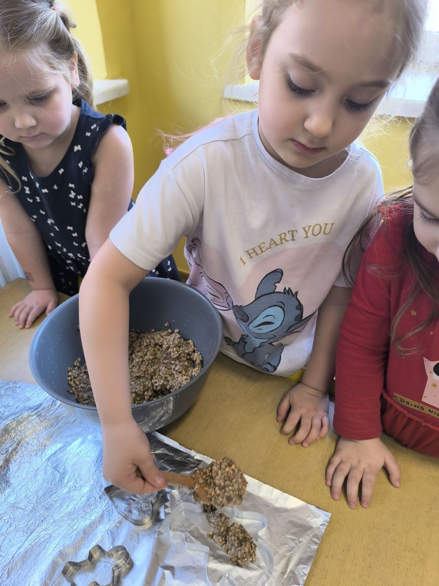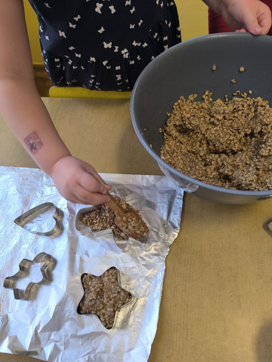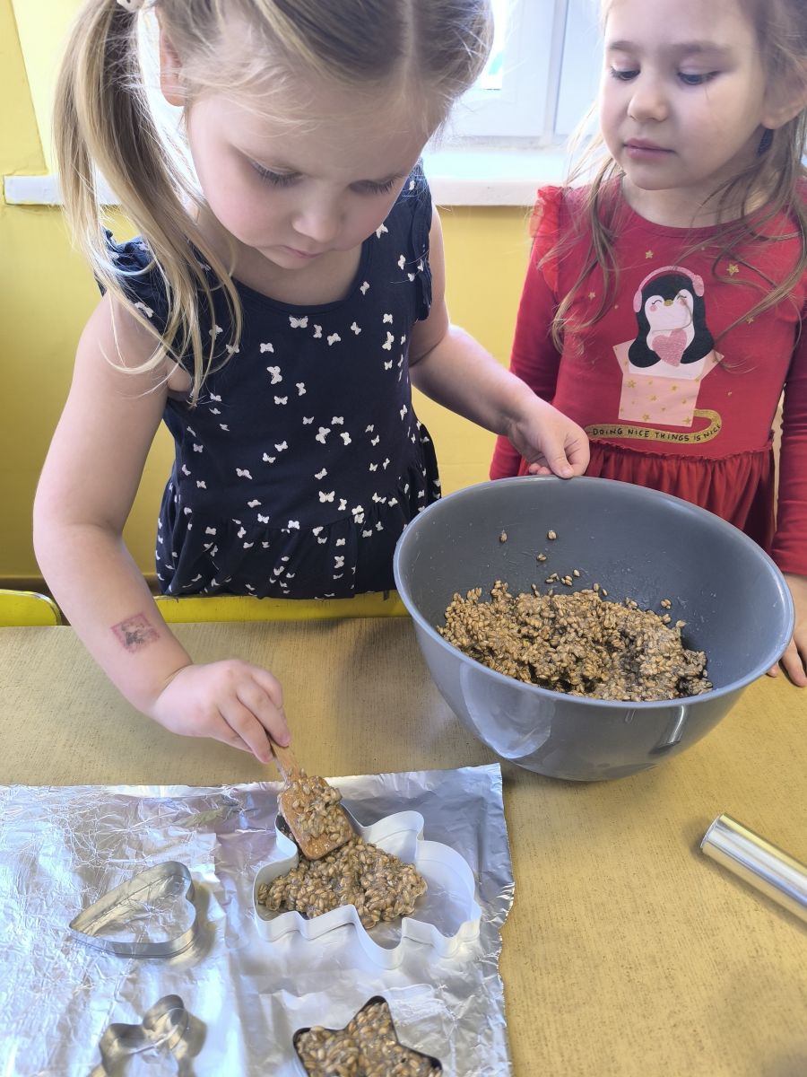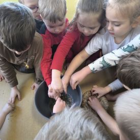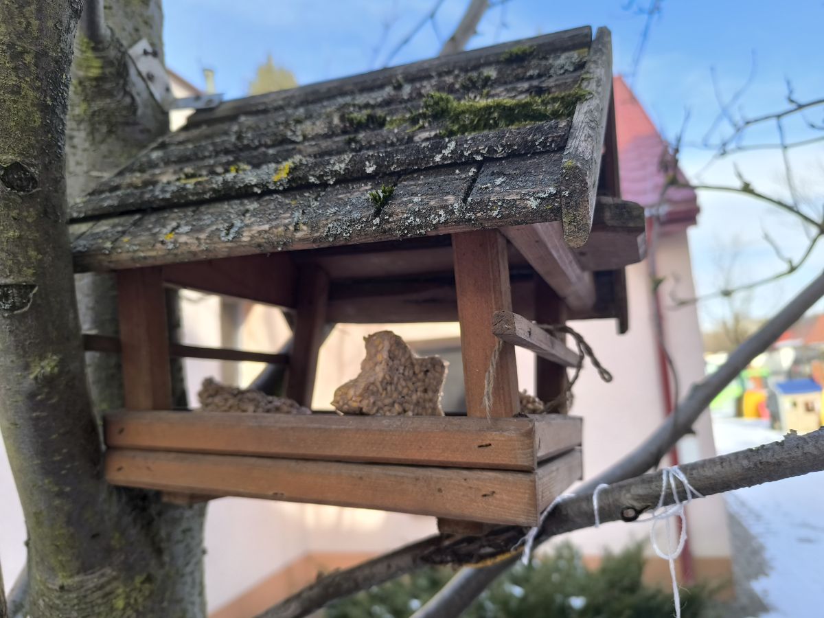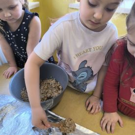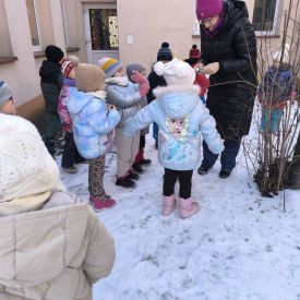 W minionym tygodniu grupa „Motylki” samodzielnie wykonała zawieszki z ziaren dla naszych małych, skrzydlatych przyjaciół. Następnie dzieci zawiesiły je w karmniku, który mogą obserwować z okna sali. Od tej pory codziennie z zainteresowaniem śledzą, jak przylatujące ptaki korzystają z przygotowanego przez nich pokarmu.