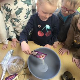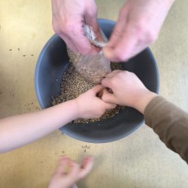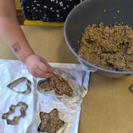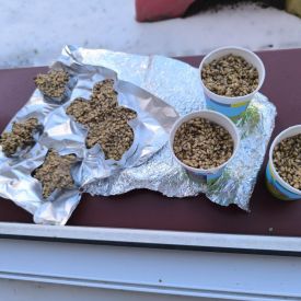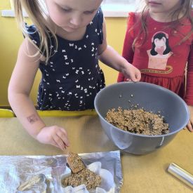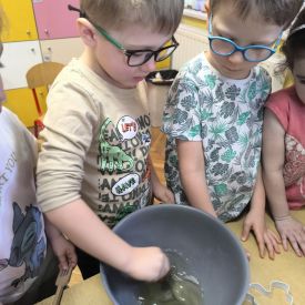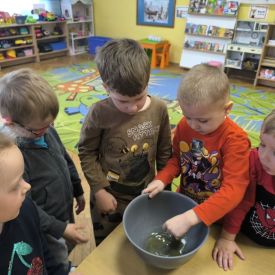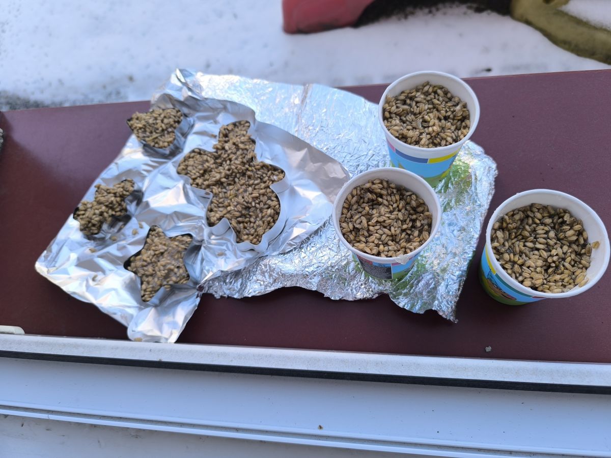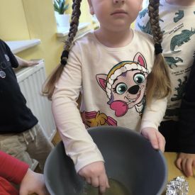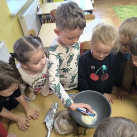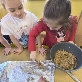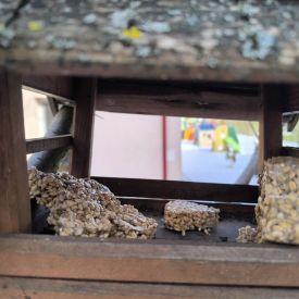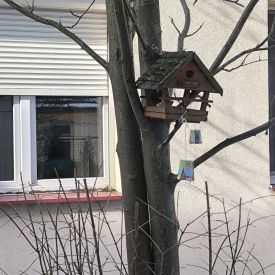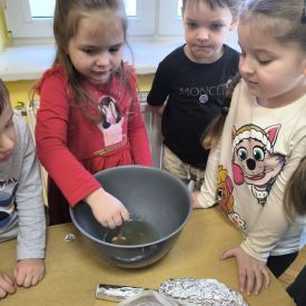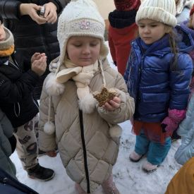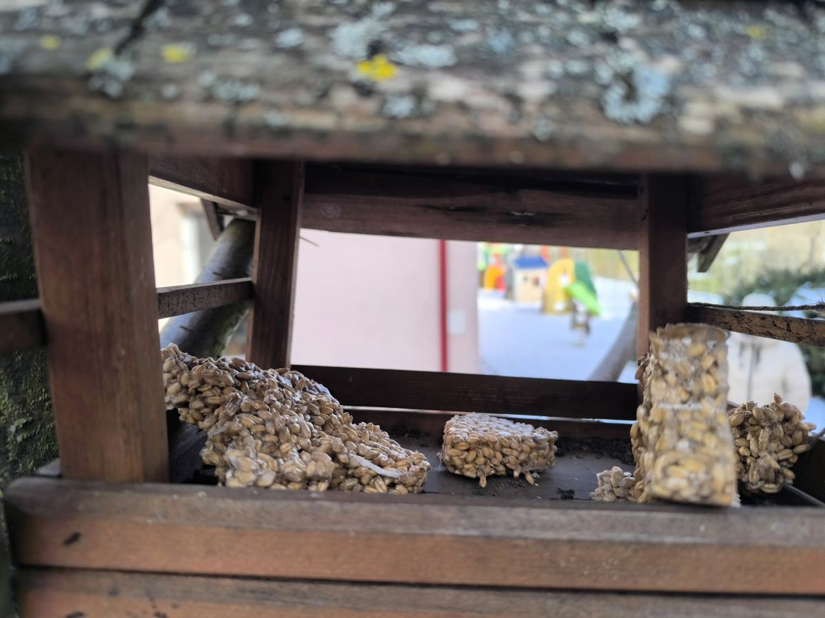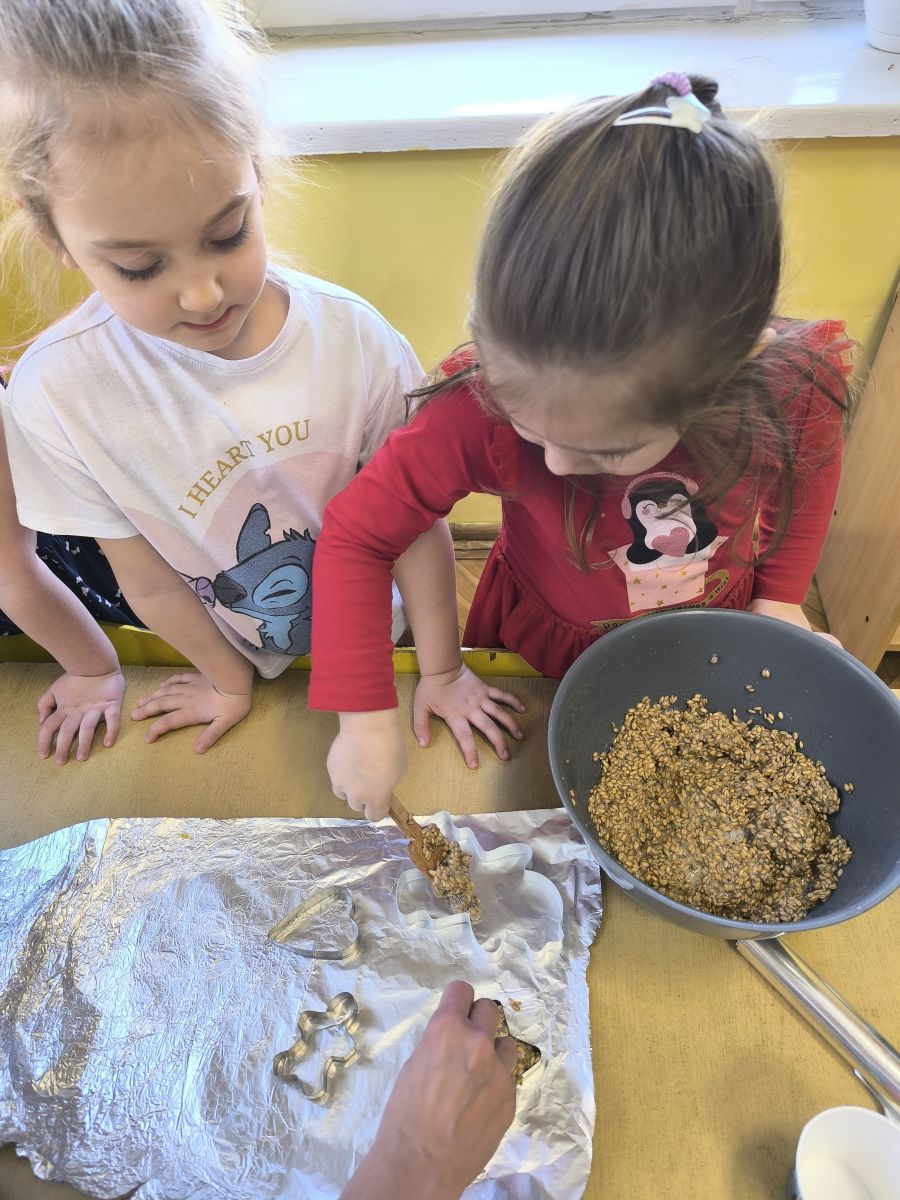 W minionym tygodniu grupa „Motylki” samodzielnie wykonała zawieszki z ziaren dla naszych małych, skrzydlatych przyjaciół. Następnie dzieci zawiesiły je w karmniku, który mogą obserwować z okna sali. Od tej pory codziennie z zainteresowaniem śledzą, jak przylatujące ptaki korzystają z przygotowanego przez nich pokarmu.