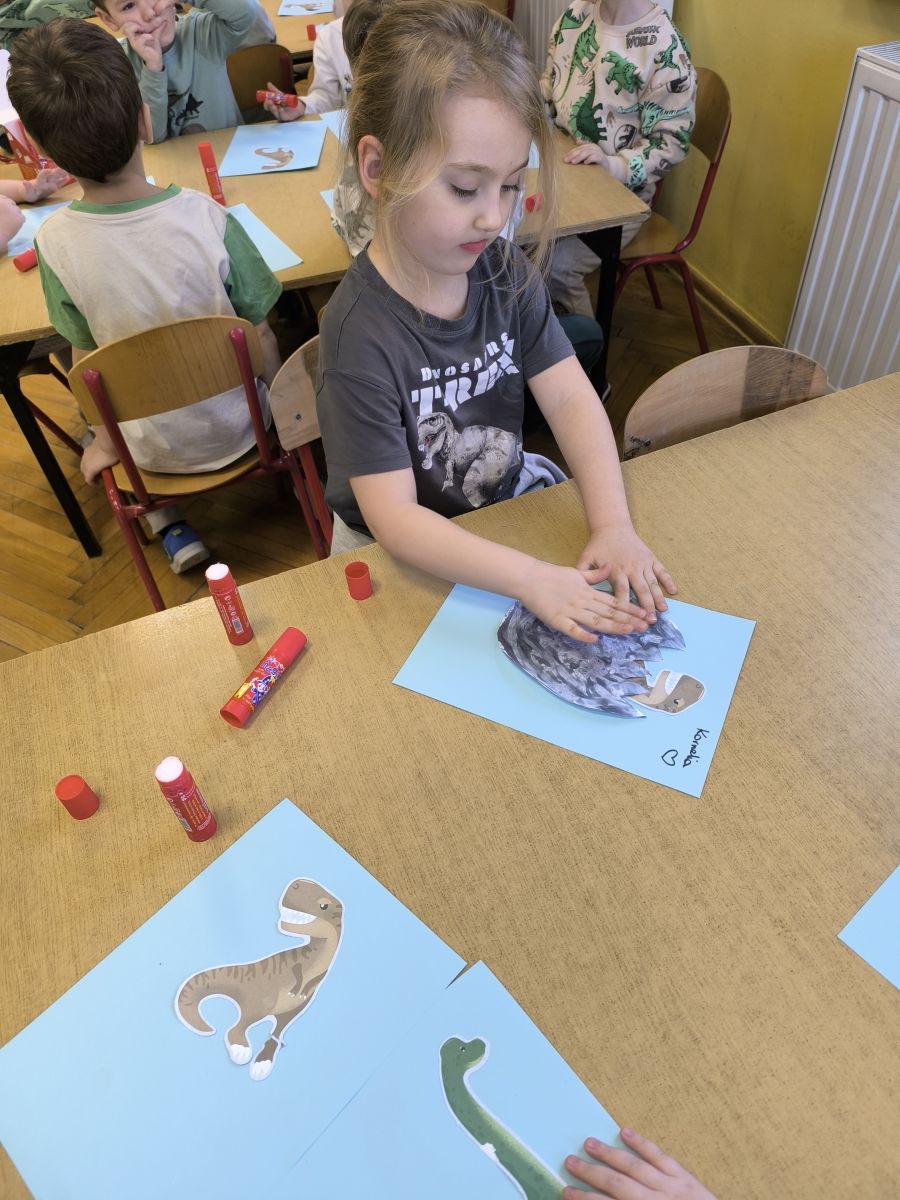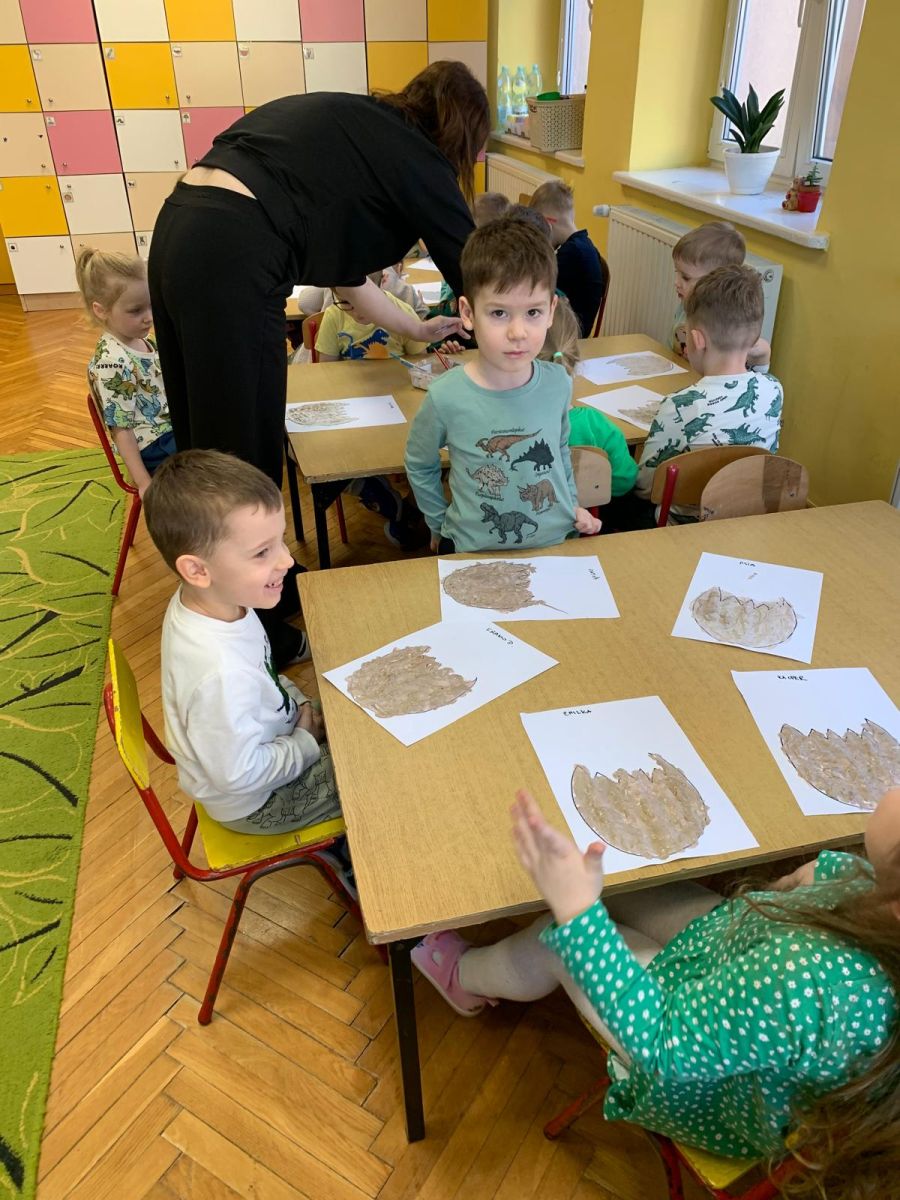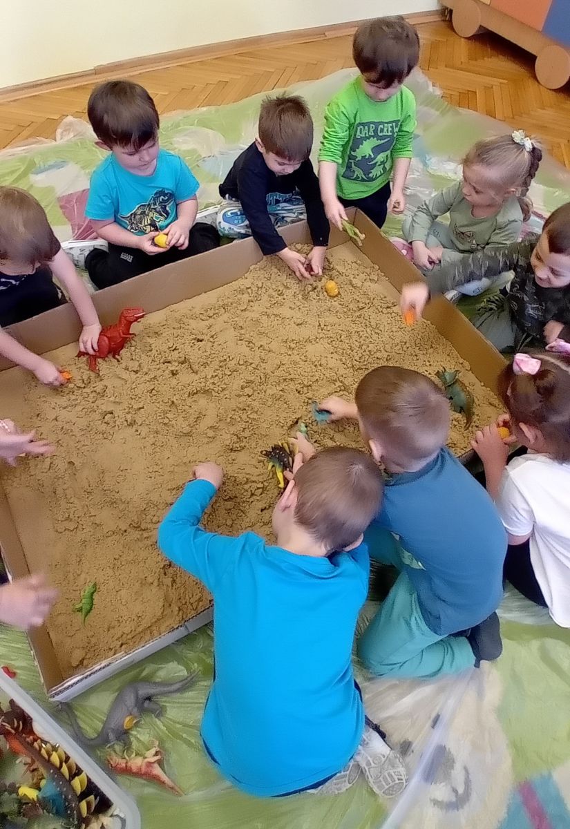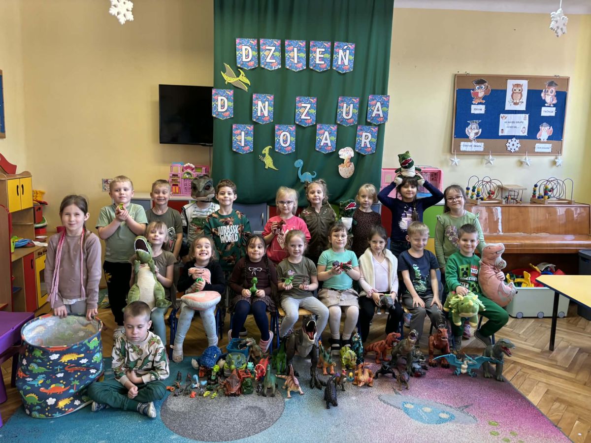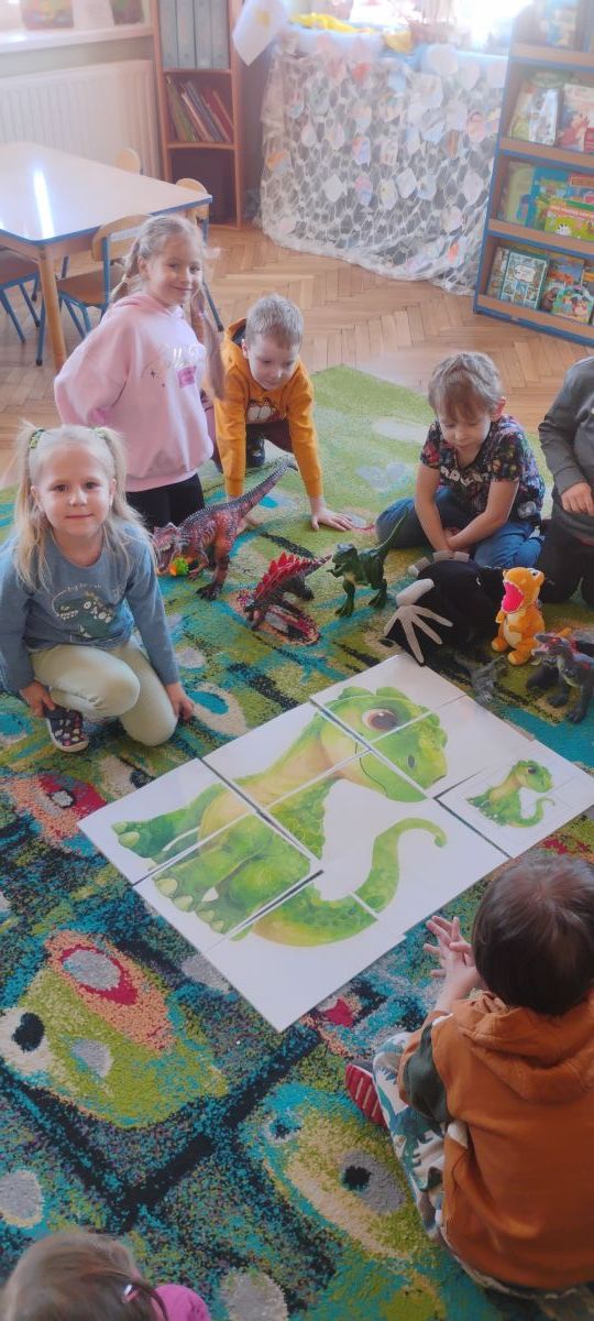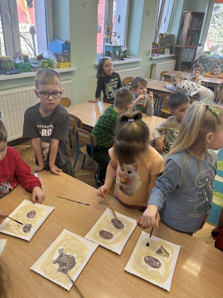 Najstarsze przedszkolaki rozpoczęły dzień od poznania wiersza „Dinozaury” autorstwa Agaty Dziechciarczyk oraz rozmowy o zawodzie paleontologa. Dowiedziały się, na czym polega praca badaczy odkrywających ślady przeszłości. Podczas zabaw muzyczno-ruchowych („Dinozaur się budzi”, „Dinozaurze kroki”, „Uciekamy przed wulkanem”, „Dino-stopy”) doskonaliły poczucie rytmu, refleks i koordynację ruchową. Wspólne układanie puzzli na wyścigi sprzyjało współpracy, a ćwiczenia gimnastyczne inspirowane ruchem dinozaurów rozwijały sprawność fizyczną. Dzieci uczestniczyły również w pracach wykopaliskowych, zabawach matematycznych (liczenie, porównywanie, segregowanie) oraz wykonały twórczą pracę plastyczną „Narodziny dinozaura”.