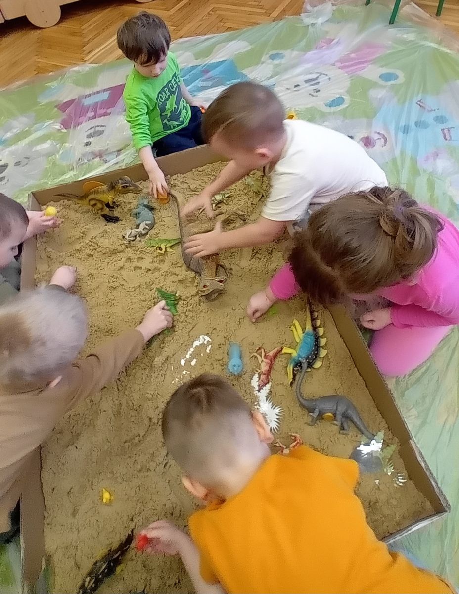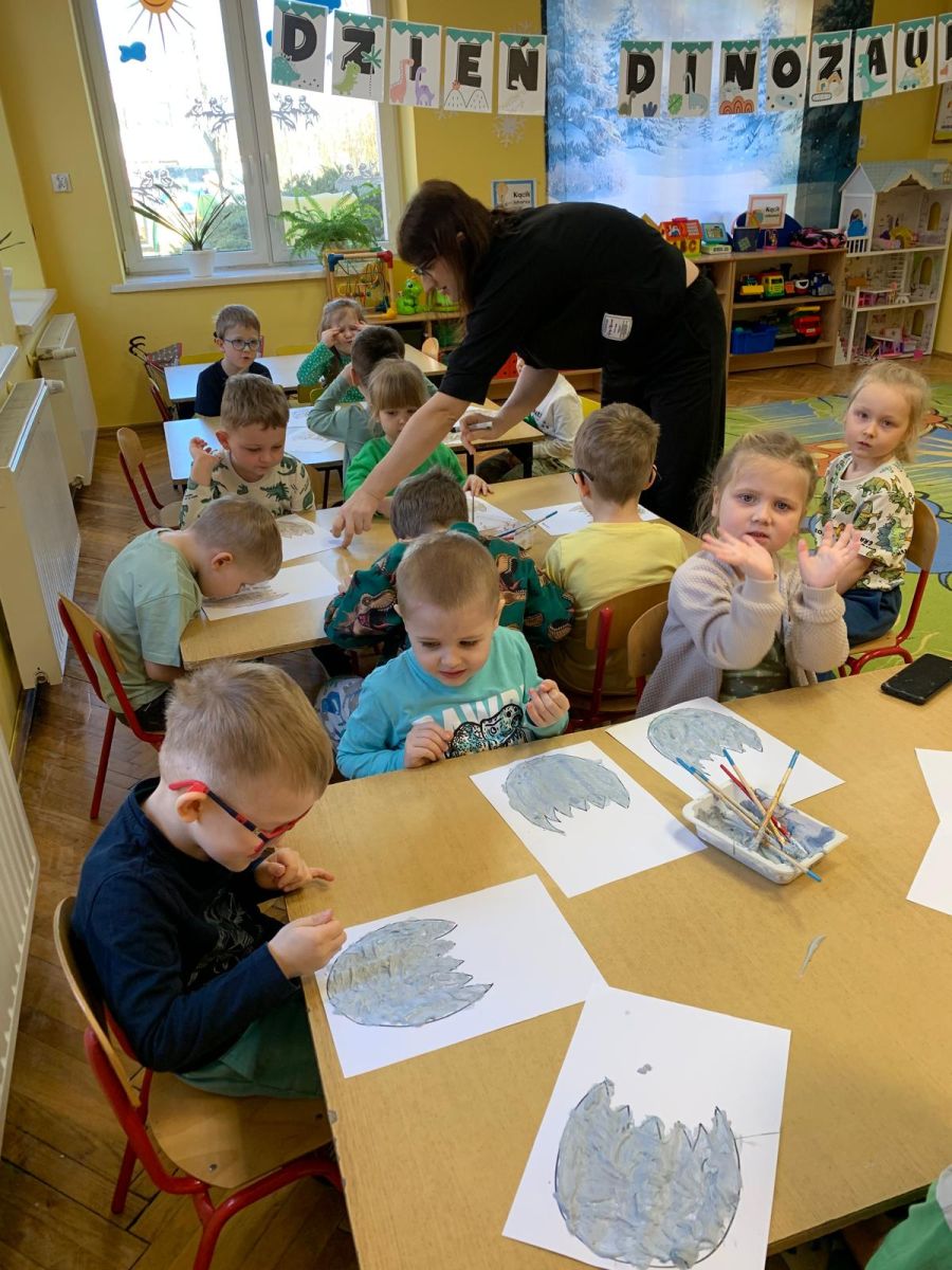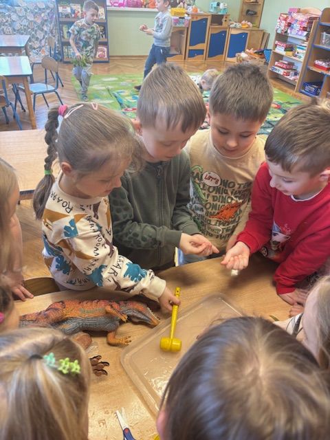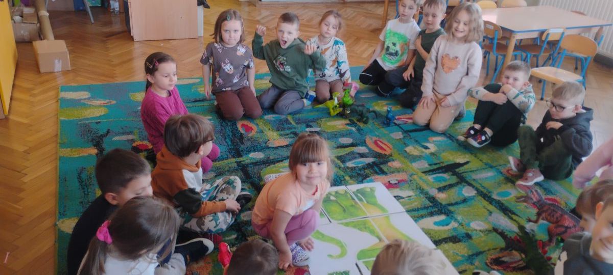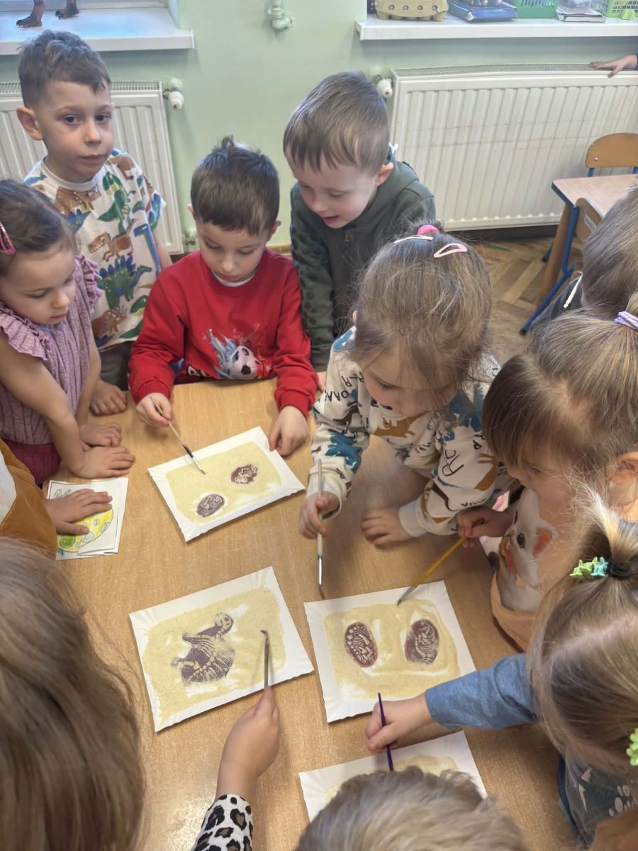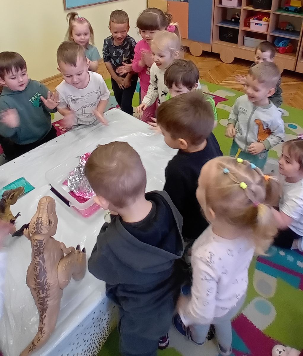 Najstarsze przedszkolaki rozpoczęły dzień od poznania wiersza „Dinozaury” autorstwa Agaty Dziechciarczyk oraz rozmowy o zawodzie paleontologa. Dowiedziały się, na czym polega praca badaczy odkrywających ślady przeszłości. Podczas zabaw muzyczno-ruchowych („Dinozaur się budzi”, „Dinozaurze kroki”, „Uciekamy przed wulkanem”, „Dino-stopy”) doskonaliły poczucie rytmu, refleks i koordynację ruchową. Wspólne układanie puzzli na wyścigi sprzyjało współpracy, a ćwiczenia gimnastyczne inspirowane ruchem dinozaurów rozwijały sprawność fizyczną. Dzieci uczestniczyły również w pracach wykopaliskowych, zabawach matematycznych (liczenie, porównywanie, segregowanie) oraz wykonały twórczą pracę plastyczną „Narodziny dinozaura”.