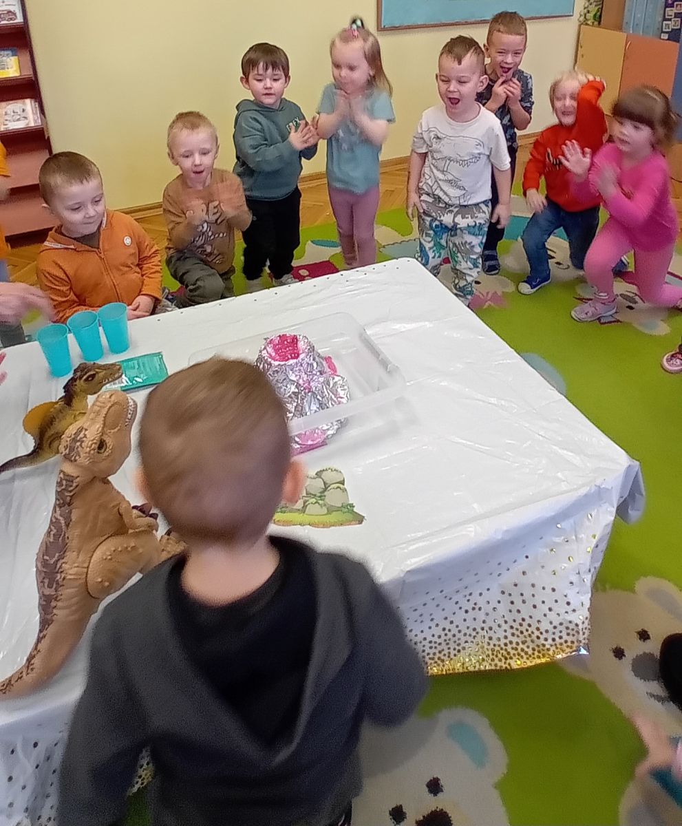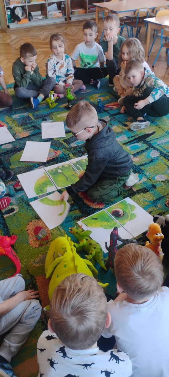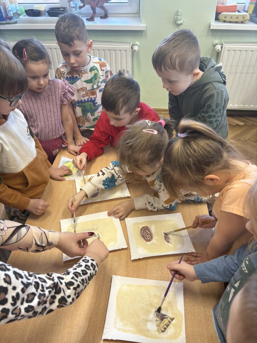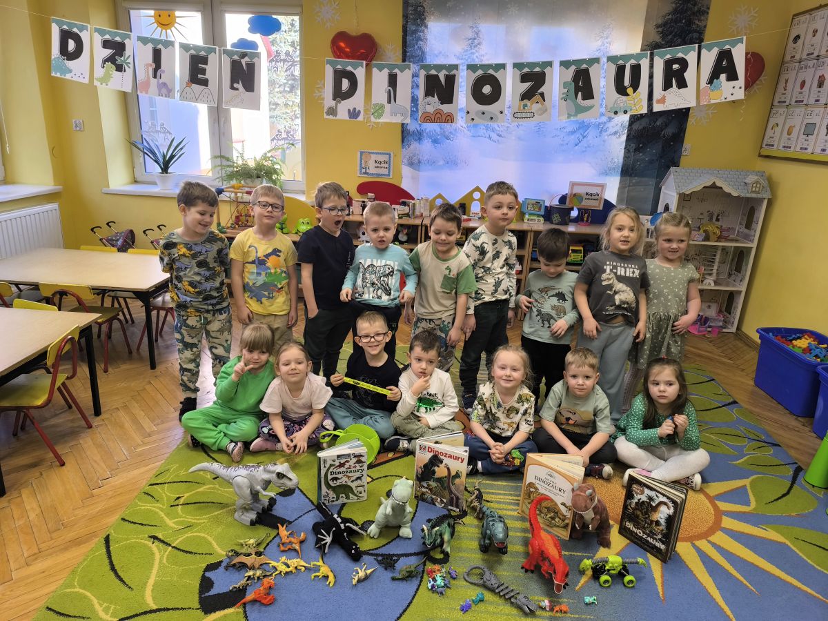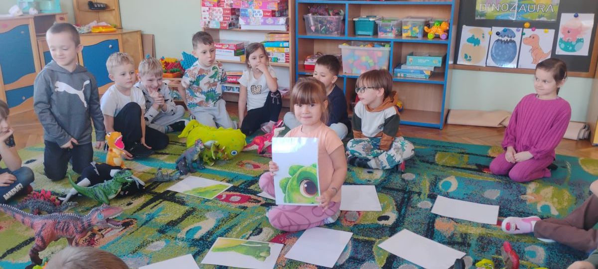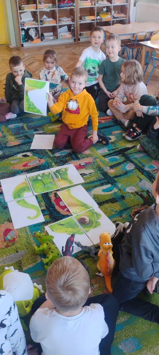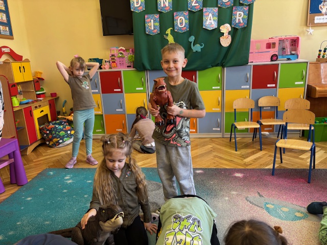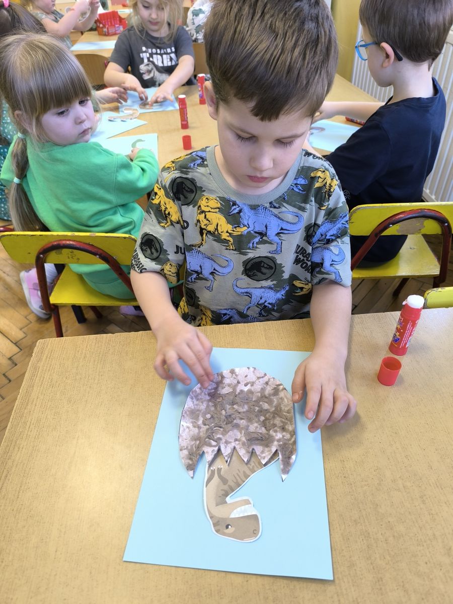 Najstarsze przedszkolaki rozpoczęły dzień od poznania wiersza „Dinozaury” autorstwa Agaty Dziechciarczyk oraz rozmowy o zawodzie paleontologa. Dowiedziały się, na czym polega praca badaczy odkrywających ślady przeszłości. Podczas zabaw muzyczno-ruchowych („Dinozaur się budzi”, „Dinozaurze kroki”, „Uciekamy przed wulkanem”, „Dino-stopy”) doskonaliły poczucie rytmu, refleks i koordynację ruchową. Wspólne układanie puzzli na wyścigi sprzyjało współpracy, a ćwiczenia gimnastyczne inspirowane ruchem dinozaurów rozwijały sprawność fizyczną. Dzieci uczestniczyły również w pracach wykopaliskowych, zabawach matematycznych (liczenie, porównywanie, segregowanie) oraz wykonały twórczą pracę plastyczną „Narodziny dinozaura”.
