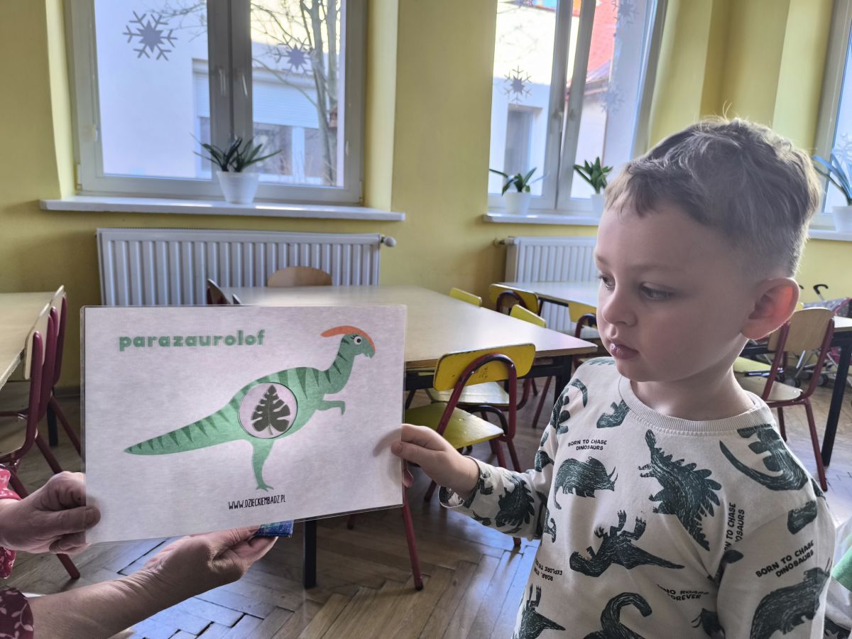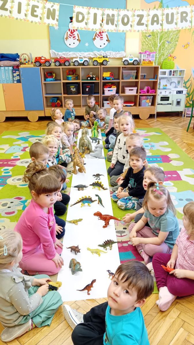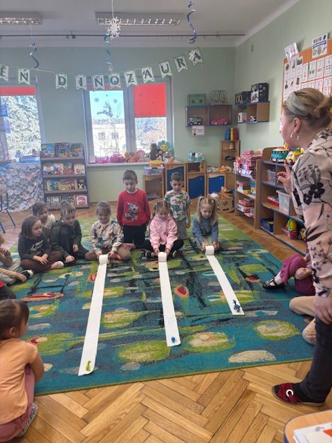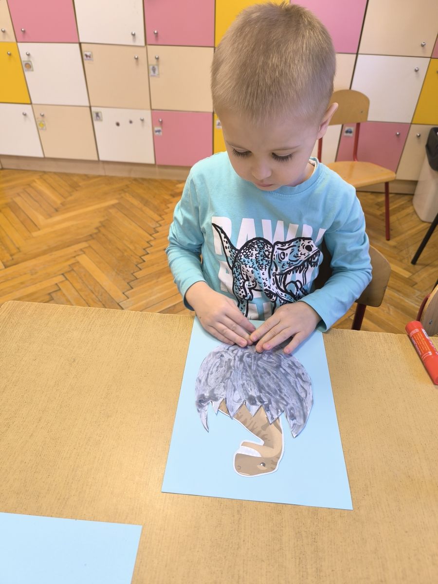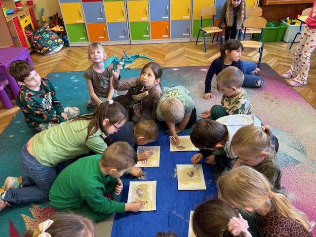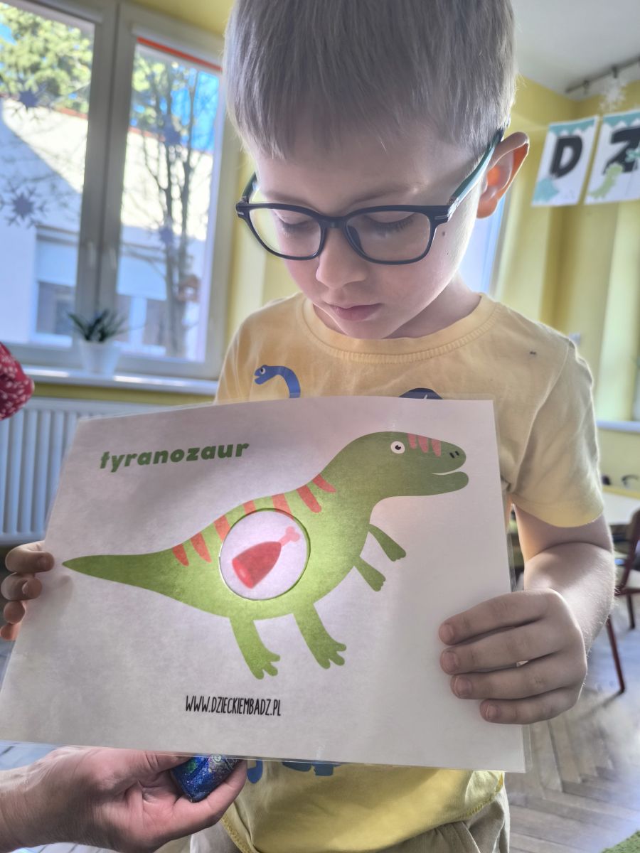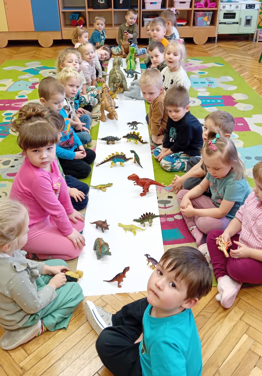 Najstarsze przedszkolaki rozpoczęły dzień od poznania wiersza „Dinozaury” autorstwa Agaty Dziechciarczyk oraz rozmowy o zawodzie paleontologa. Dowiedziały się, na czym polega praca badaczy odkrywających ślady przeszłości. Podczas zabaw muzyczno-ruchowych („Dinozaur się budzi”, „Dinozaurze kroki”, „Uciekamy przed wulkanem”, „Dino-stopy”) doskonaliły poczucie rytmu, refleks i koordynację ruchową. Wspólne układanie puzzli na wyścigi sprzyjało współpracy, a ćwiczenia gimnastyczne inspirowane ruchem dinozaurów rozwijały sprawność fizyczną. Dzieci uczestniczyły również w pracach wykopaliskowych, zabawach matematycznych (liczenie, porównywanie, segregowanie) oraz wykonały twórczą pracę plastyczną „Narodziny dinozaura”.