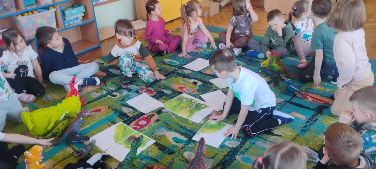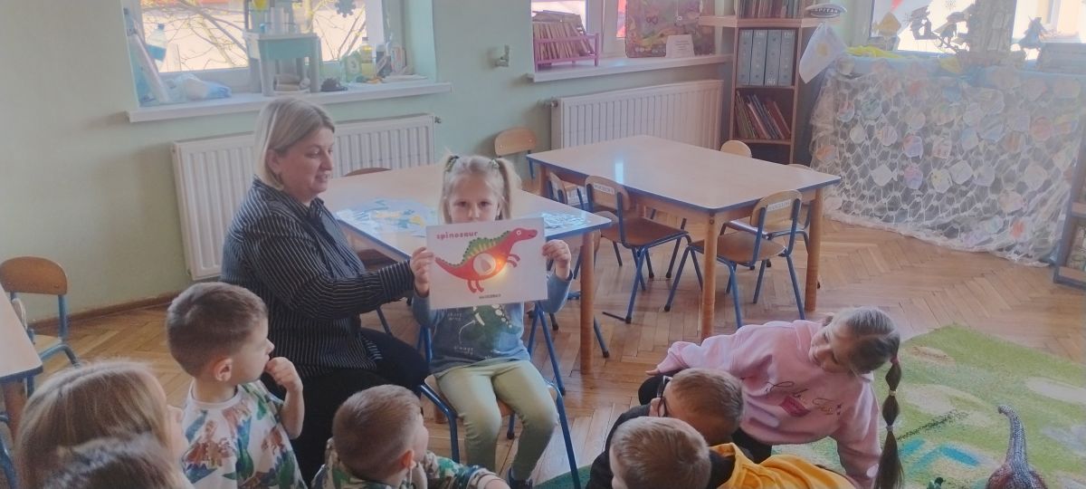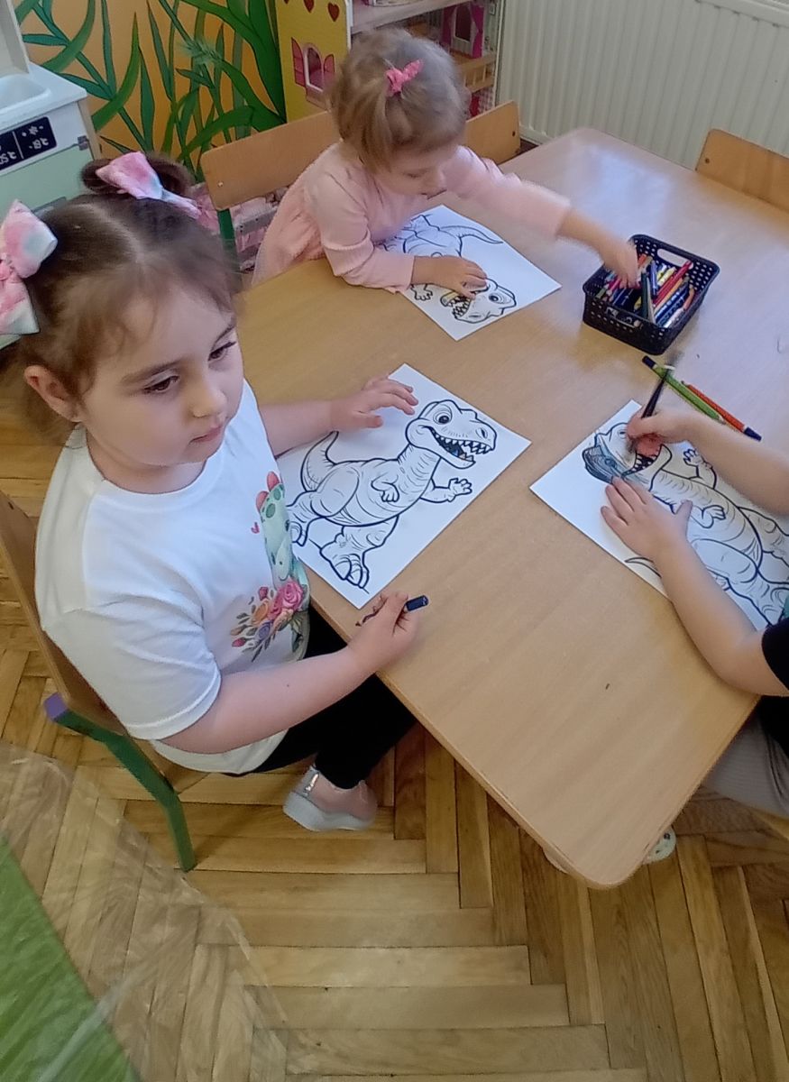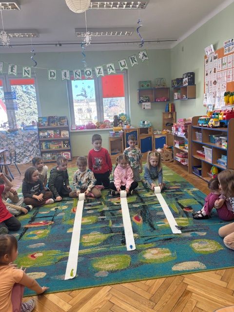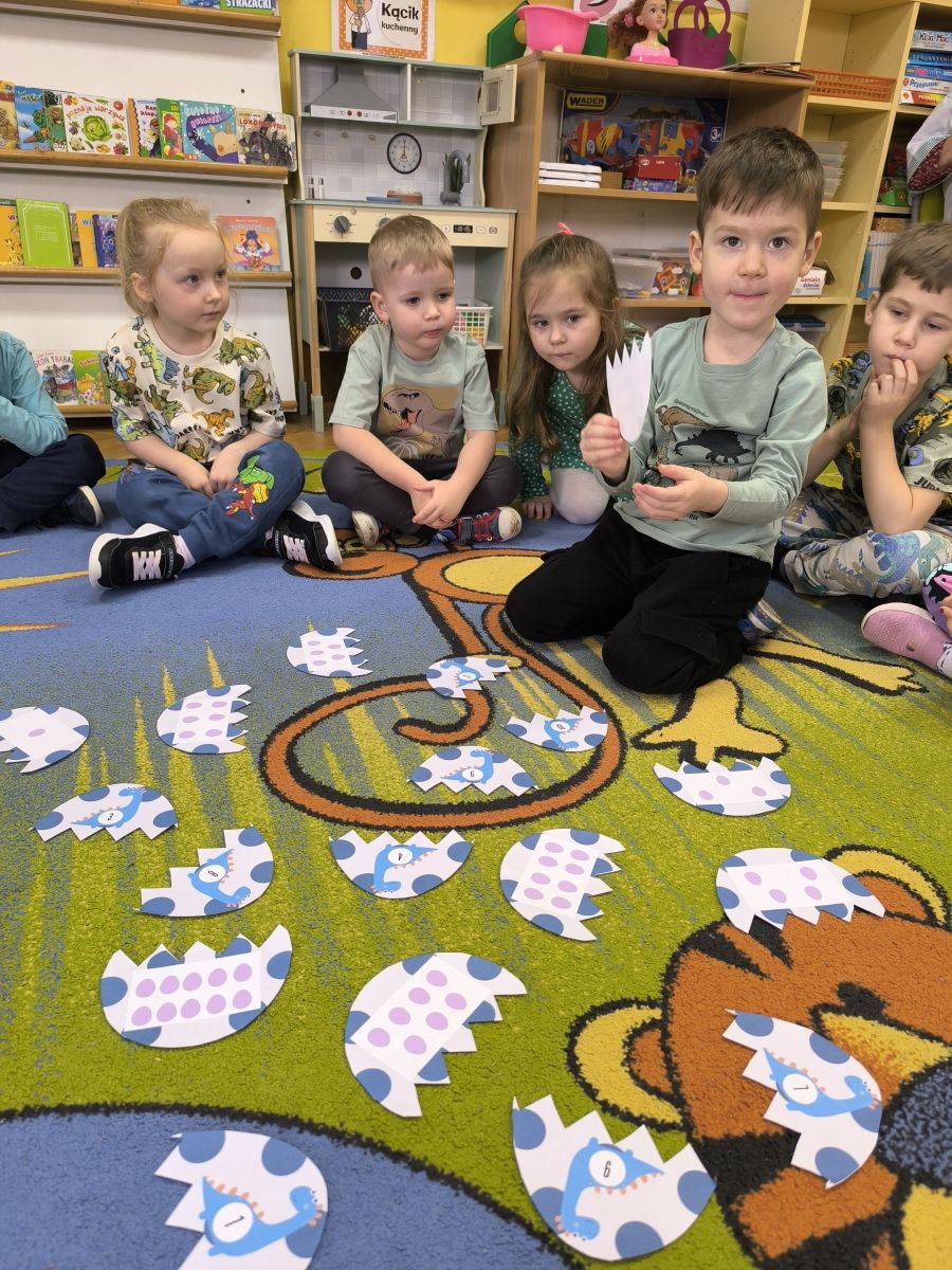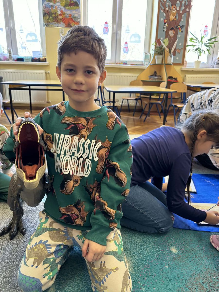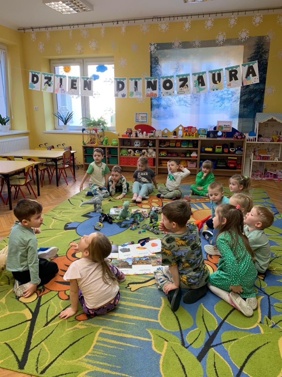 Najstarsze przedszkolaki rozpoczęły dzień od poznania wiersza „Dinozaury” autorstwa Agaty Dziechciarczyk oraz rozmowy o zawodzie paleontologa. Dowiedziały się, na czym polega praca badaczy odkrywających ślady przeszłości. Podczas zabaw muzyczno-ruchowych („Dinozaur się budzi”, „Dinozaurze kroki”, „Uciekamy przed wulkanem”, „Dino-stopy”) doskonaliły poczucie rytmu, refleks i koordynację ruchową. Wspólne układanie puzzli na wyścigi sprzyjało współpracy, a ćwiczenia gimnastyczne inspirowane ruchem dinozaurów rozwijały sprawność fizyczną. Dzieci uczestniczyły również w pracach wykopaliskowych, zabawach matematycznych (liczenie, porównywanie, segregowanie) oraz wykonały twórczą pracę plastyczną „Narodziny dinozaura”.