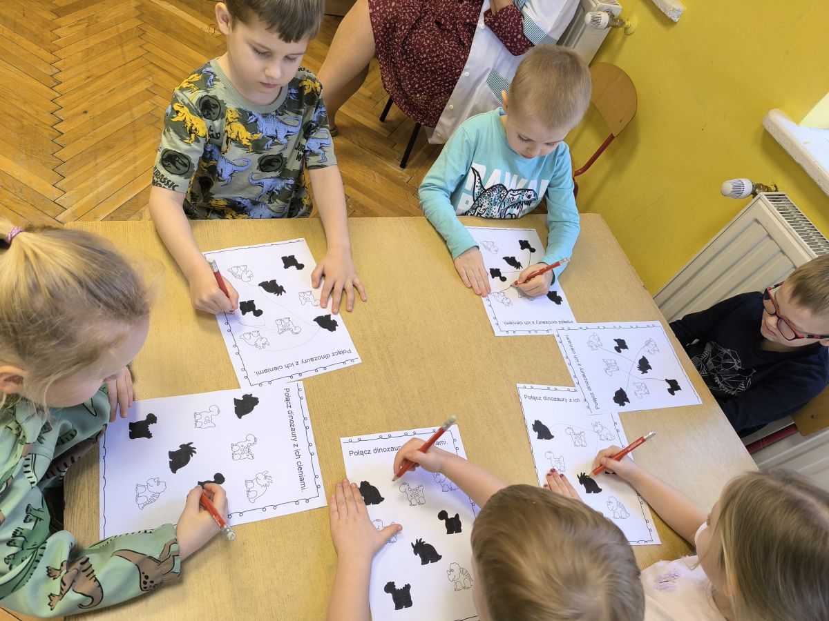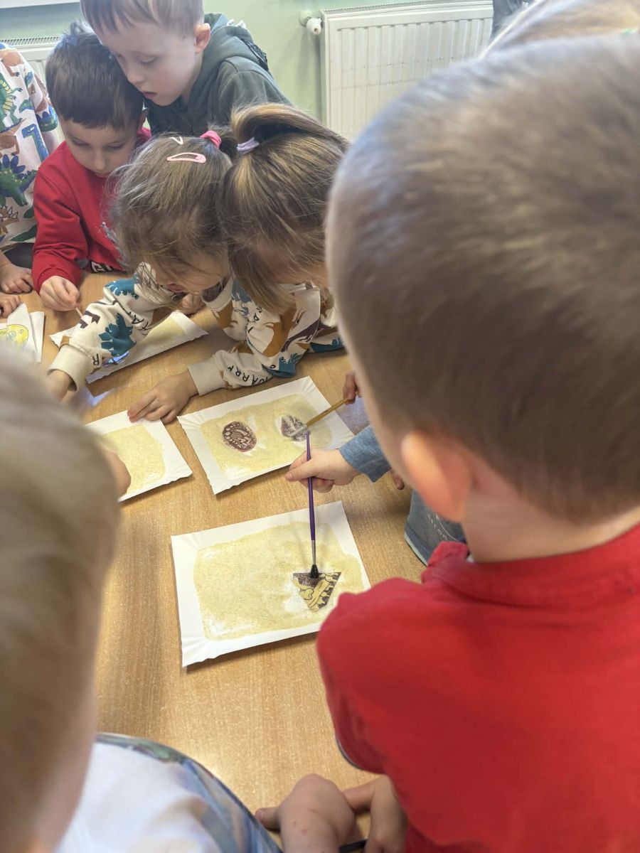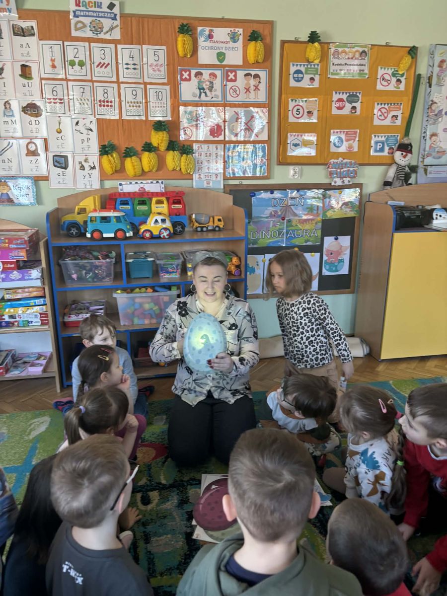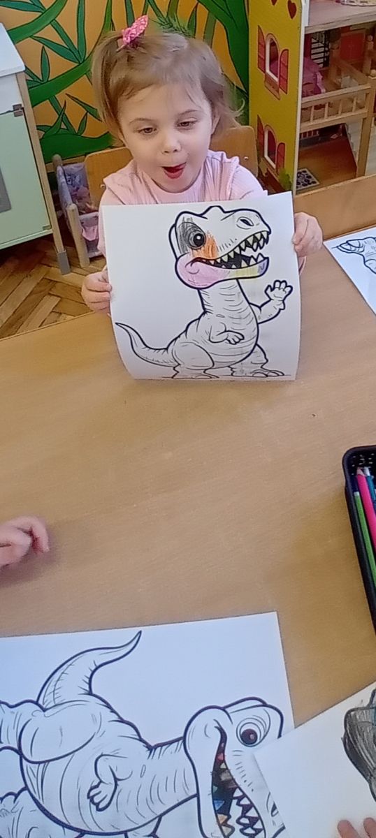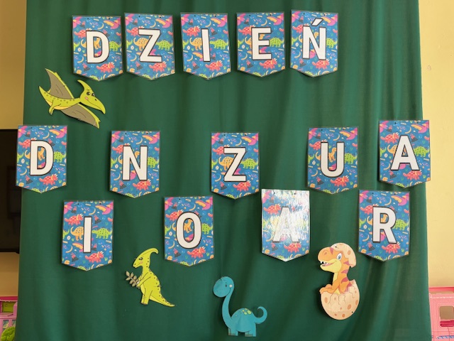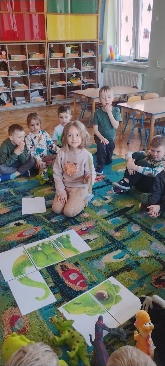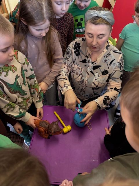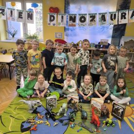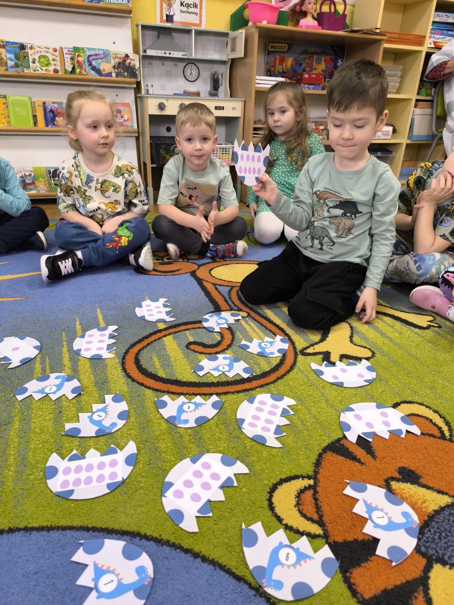 Najstarsze przedszkolaki rozpoczęły dzień od poznania wiersza „Dinozaury” autorstwa Agaty Dziechciarczyk oraz rozmowy o zawodzie paleontologa. Dowiedziały się, na czym polega praca badaczy odkrywających ślady przeszłości. Podczas zabaw muzyczno-ruchowych („Dinozaur się budzi”, „Dinozaurze kroki”, „Uciekamy przed wulkanem”, „Dino-stopy”) doskonaliły poczucie rytmu, refleks i koordynację ruchową. Wspólne układanie puzzli na wyścigi sprzyjało współpracy, a ćwiczenia gimnastyczne inspirowane ruchem dinozaurów rozwijały sprawność fizyczną. Dzieci uczestniczyły również w pracach wykopaliskowych, zabawach matematycznych (liczenie, porównywanie, segregowanie) oraz wykonały twórczą pracę plastyczną „Narodziny dinozaura”.