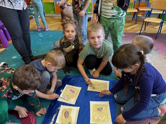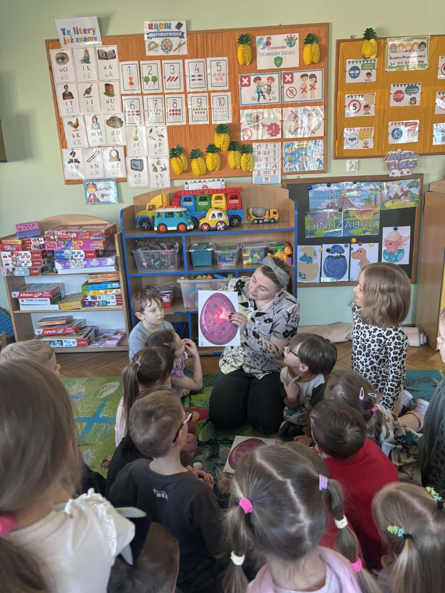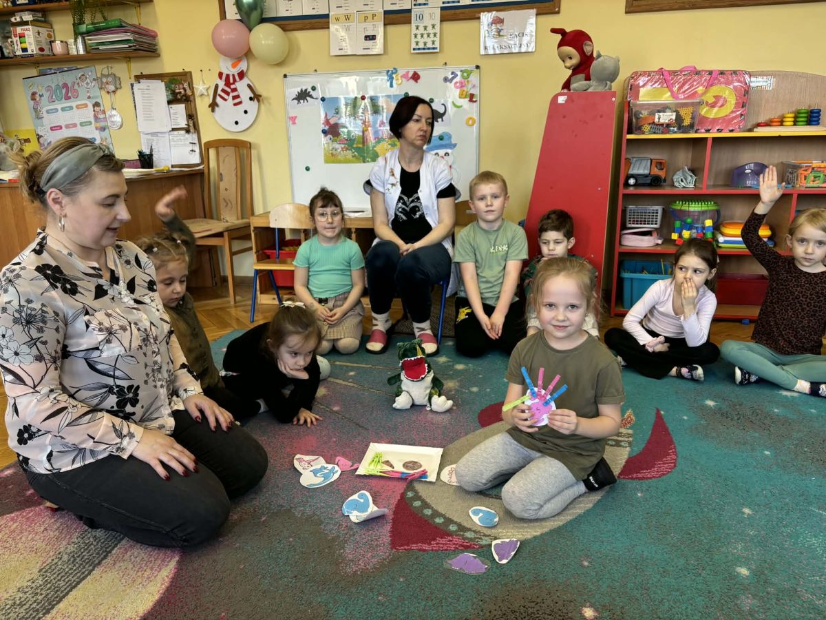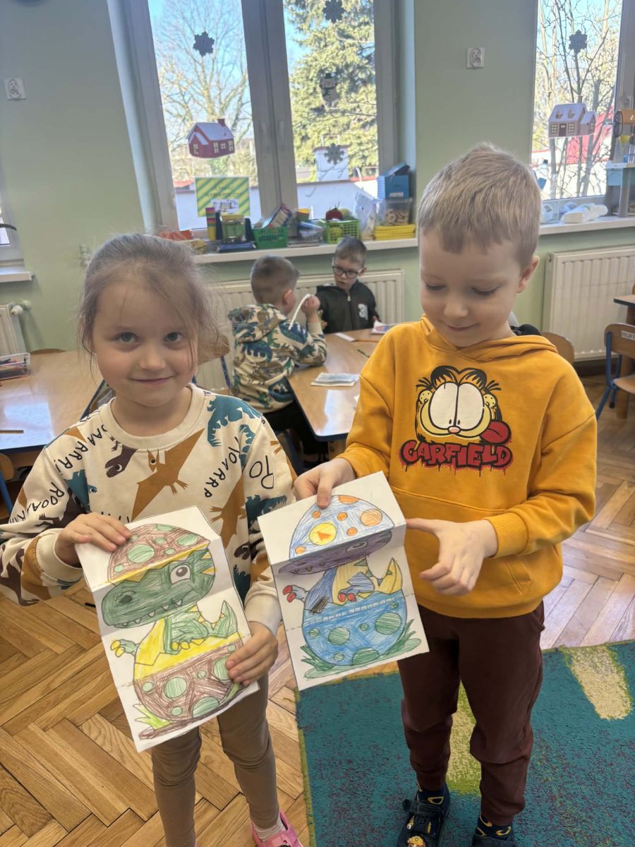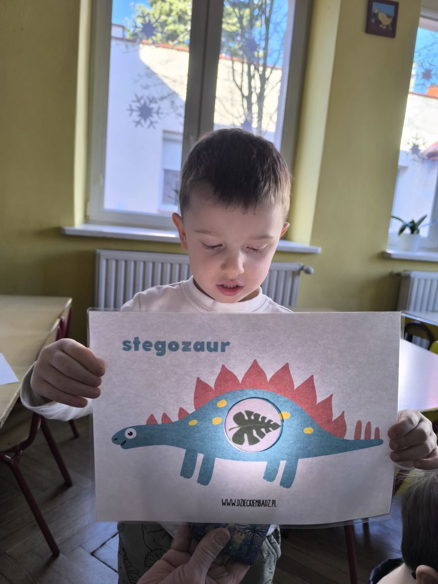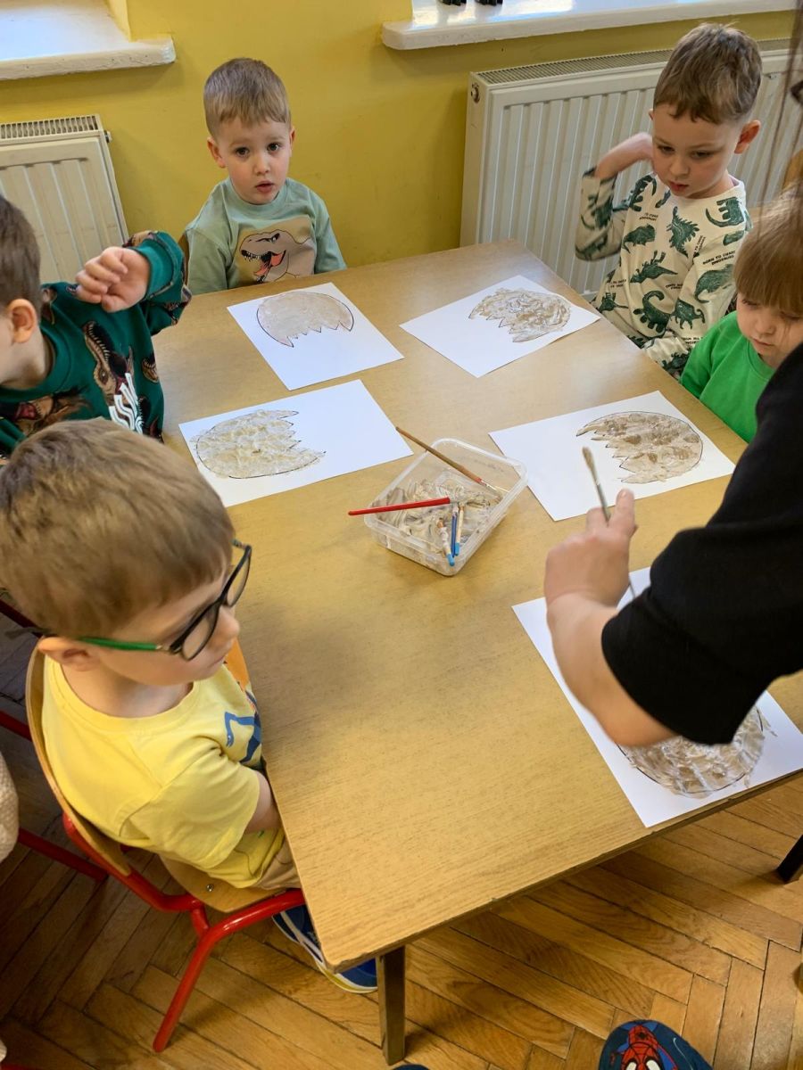 Najstarsze przedszkolaki rozpoczęły dzień od poznania wiersza „Dinozaury” autorstwa Agaty Dziechciarczyk oraz rozmowy o zawodzie paleontologa. Dowiedziały się, na czym polega praca badaczy odkrywających ślady przeszłości. Podczas zabaw muzyczno-ruchowych („Dinozaur się budzi”, „Dinozaurze kroki”, „Uciekamy przed wulkanem”, „Dino-stopy”) doskonaliły poczucie rytmu, refleks i koordynację ruchową. Wspólne układanie puzzli na wyścigi sprzyjało współpracy, a ćwiczenia gimnastyczne inspirowane ruchem dinozaurów rozwijały sprawność fizyczną. Dzieci uczestniczyły również w pracach wykopaliskowych, zabawach matematycznych (liczenie, porównywanie, segregowanie) oraz wykonały twórczą pracę plastyczną „Narodziny dinozaura”.