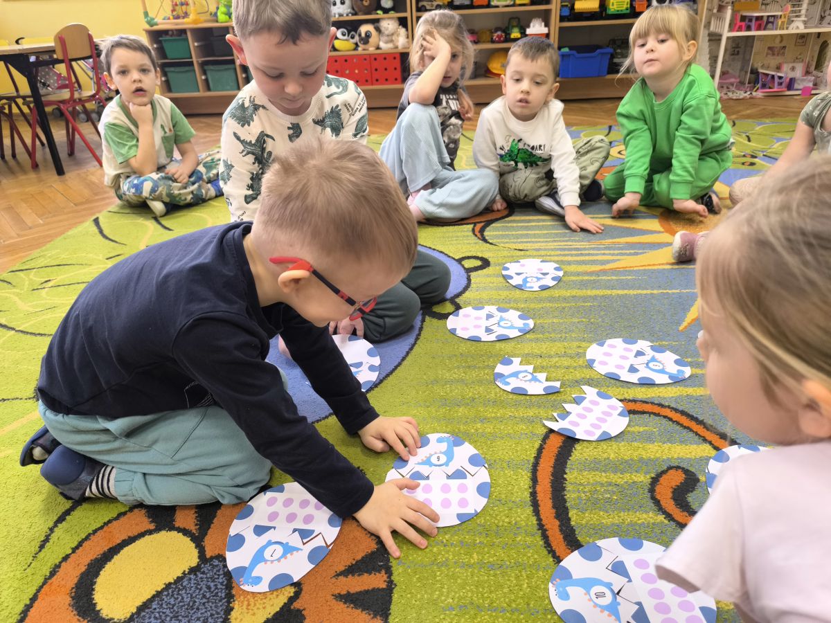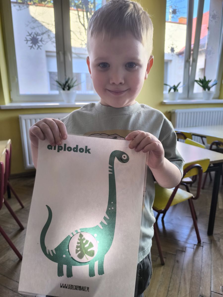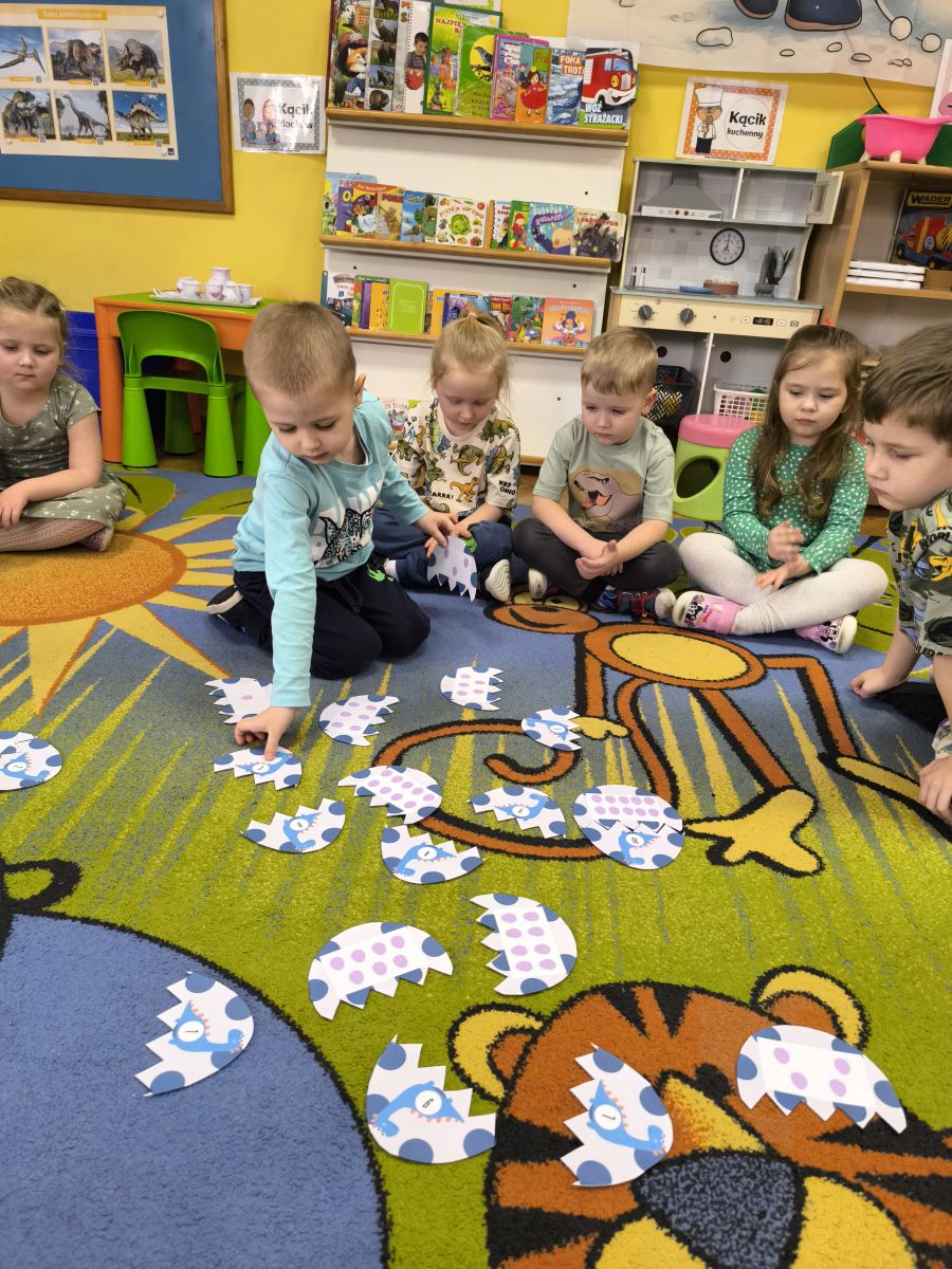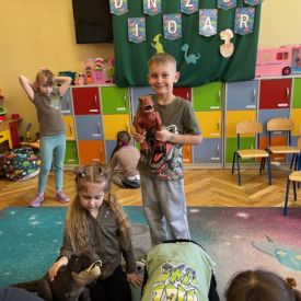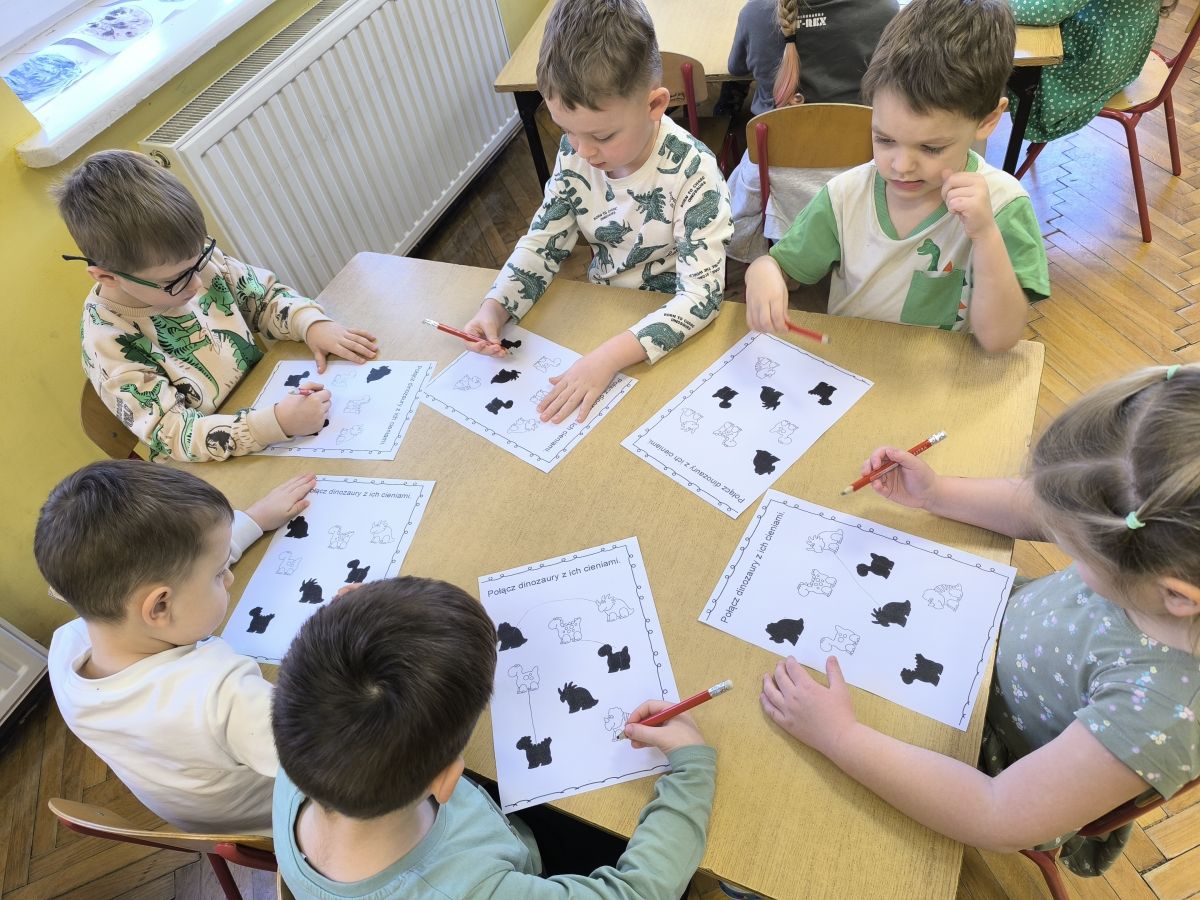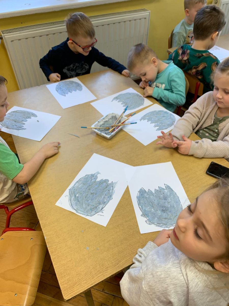 Najstarsze przedszkolaki rozpoczęły dzień od poznania wiersza „Dinozaury” autorstwa Agaty Dziechciarczyk oraz rozmowy o zawodzie paleontologa. Dowiedziały się, na czym polega praca badaczy odkrywających ślady przeszłości. Podczas zabaw muzyczno-ruchowych („Dinozaur się budzi”, „Dinozaurze kroki”, „Uciekamy przed wulkanem”, „Dino-stopy”) doskonaliły poczucie rytmu, refleks i koordynację ruchową. Wspólne układanie puzzli na wyścigi sprzyjało współpracy, a ćwiczenia gimnastyczne inspirowane ruchem dinozaurów rozwijały sprawność fizyczną. Dzieci uczestniczyły również w pracach wykopaliskowych, zabawach matematycznych (liczenie, porównywanie, segregowanie) oraz wykonały twórczą pracę plastyczną „Narodziny dinozaura”.